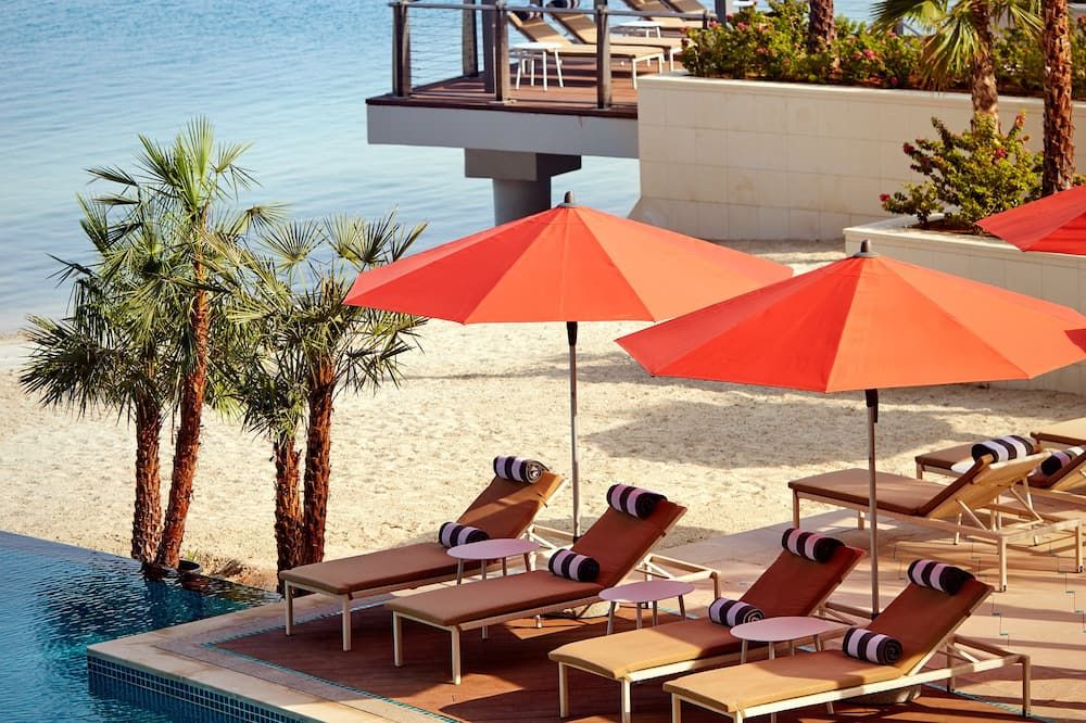 Decorated with it's statement chandeliers, wall of richly colored dunes and textured accent nickel wall, the rooms offer floor-to-ceiling windows and a balcony with views of the Gulf or of the palaces. The bathrooms are fitted with a freestanding tub and a walk-in closet.