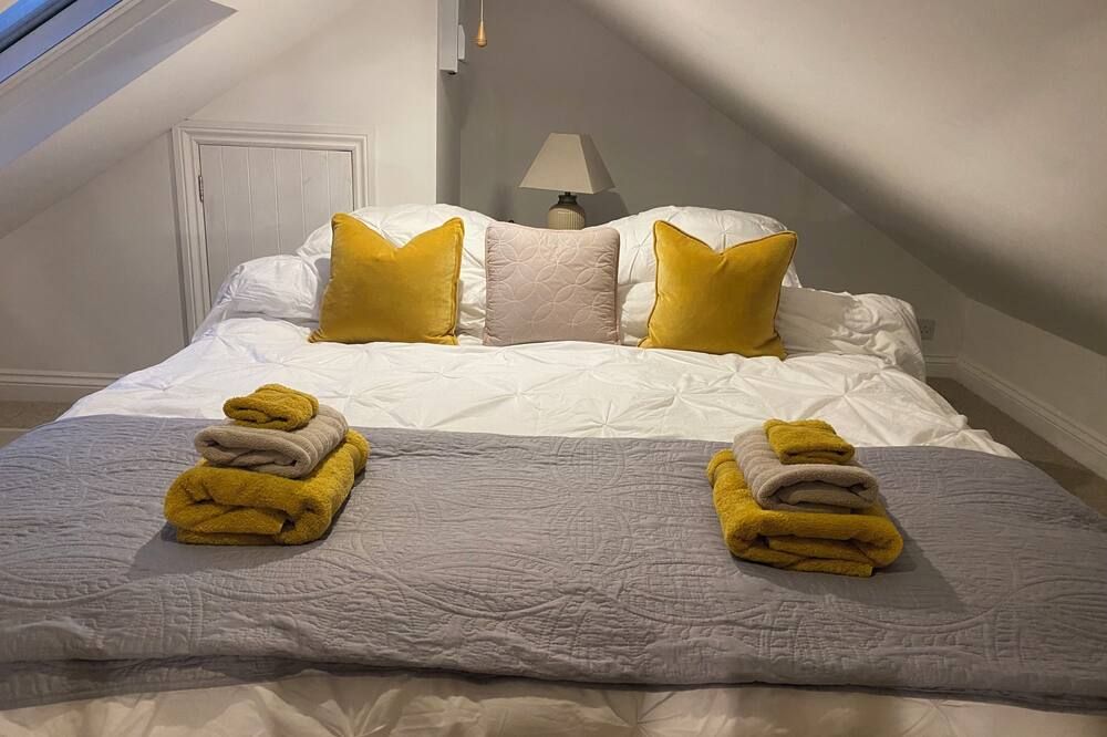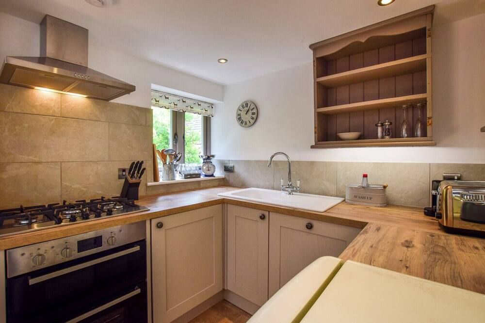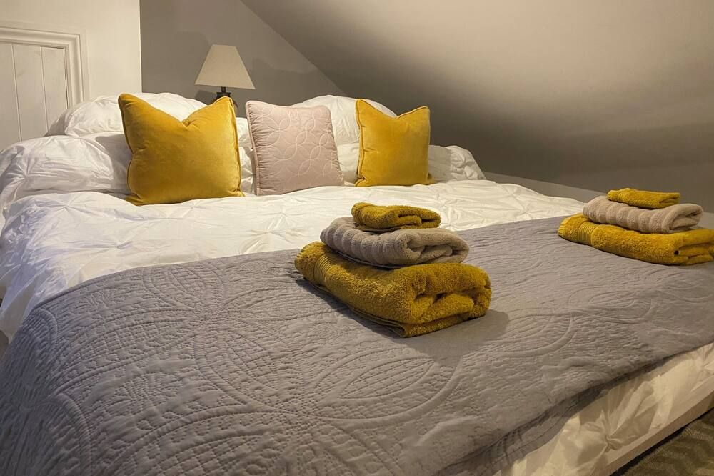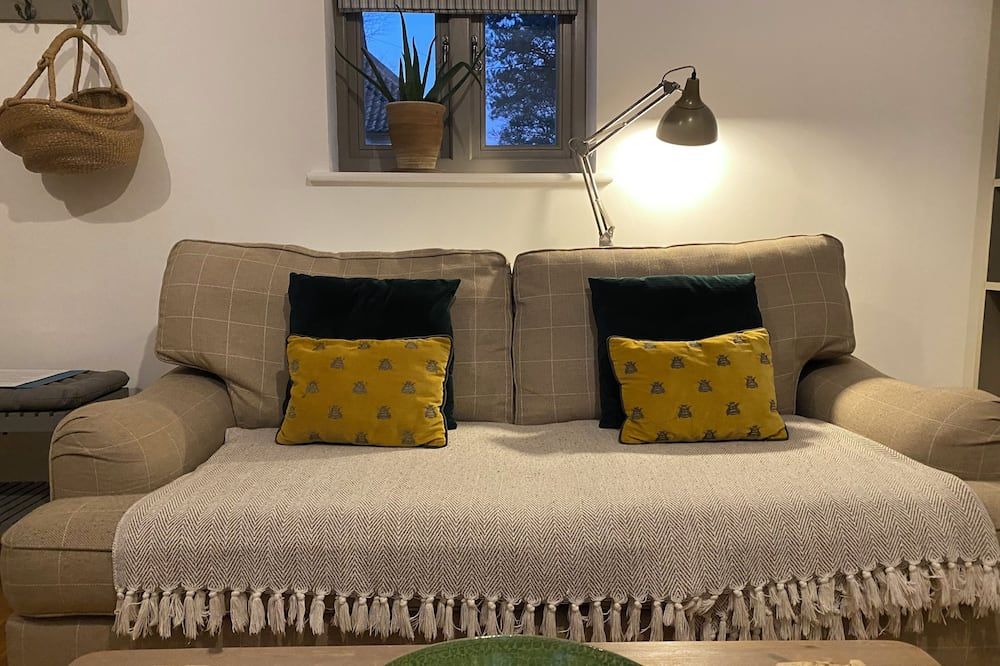 Upon entering the barn, you'll step straight into the stylish open-plan kitchen-dining area and living room, with exposed beams and characterful stone walls. We particularly love the lime green velvet sofa, which adds a tasteful pop of contemporary personality to the otherwise countryside design aesthetic. Across the rest of the home, you'll find soothing earthy tones and soft fabrics and furnishings that tempt those much-needed relaxation moments.