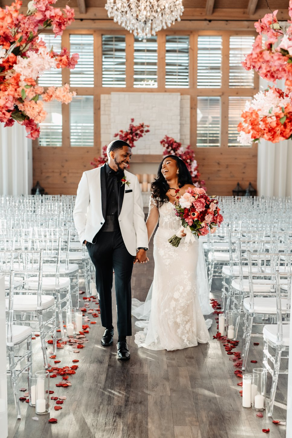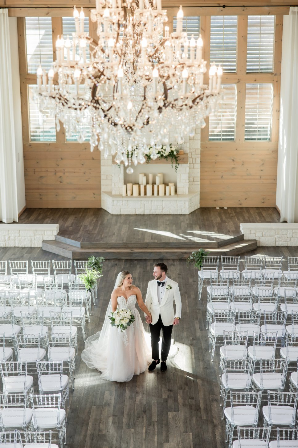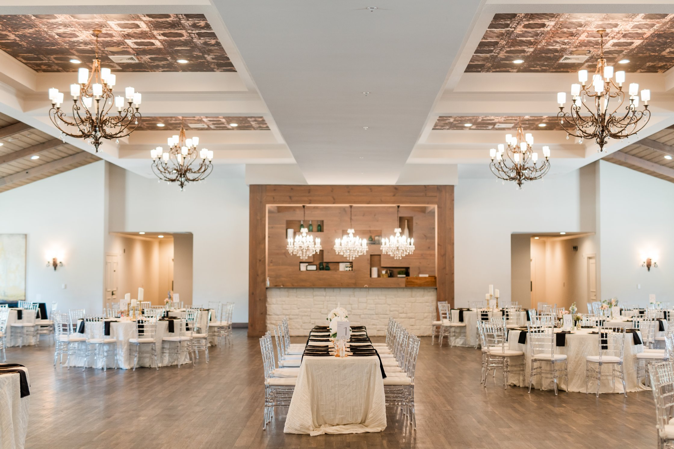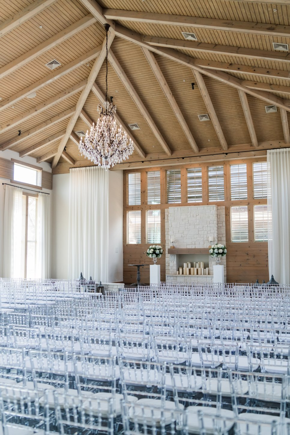 The chapel features a dramatic Austin stone fireplace, gorgeous draping, a wall of windows, beautiful crystal chandeliers, and 40-foot ceilings. The chapel has a grand staircase or beautiful doors for you to make your entrance. The Grand Reception Hall with sliding barn doors personifies Texas-chic ambiance. The impressive stone and granite bar and elegant sparkle of chandeliers will transport you and your guests to a Texas Hill Country setting with city style and modern elegance.