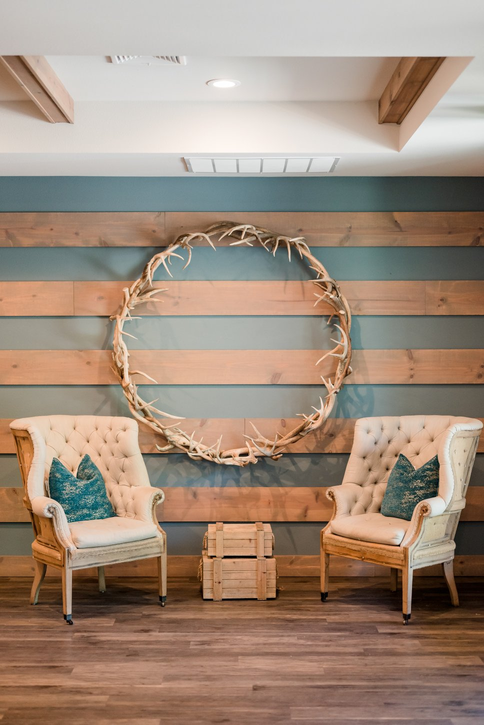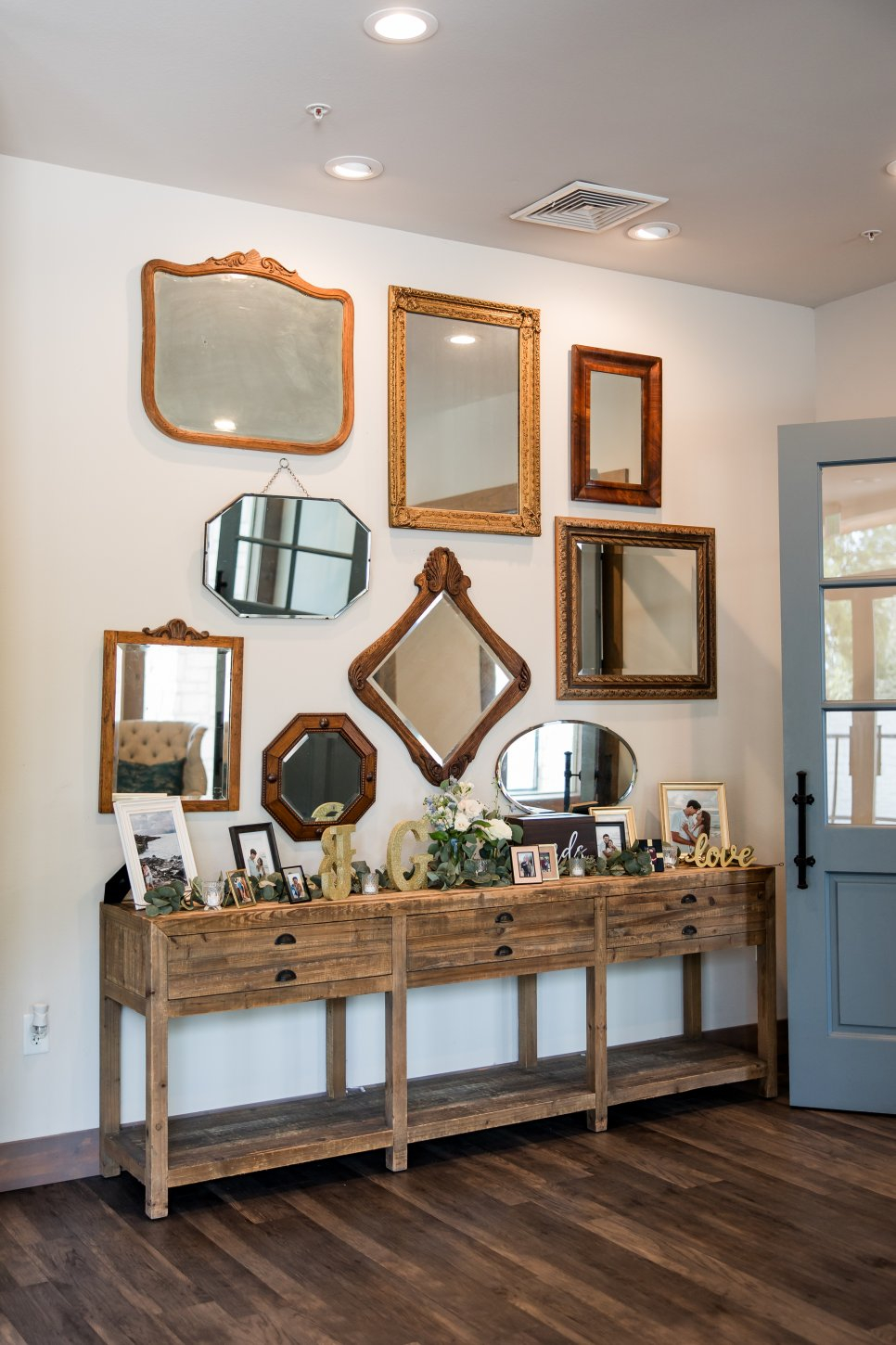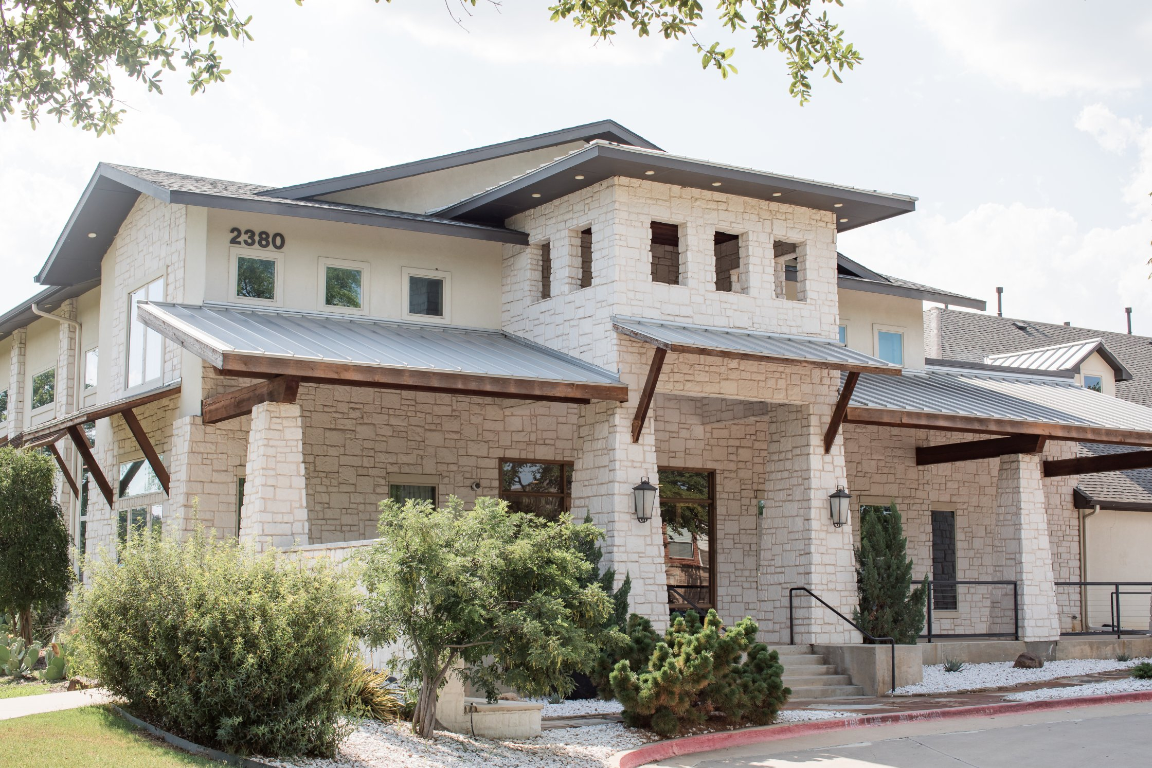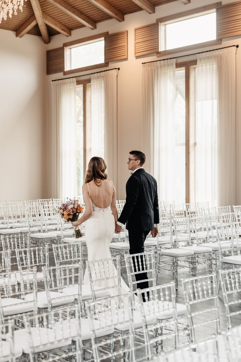 The chapel features a dramatic Austin stone fireplace, gorgeous draping, a wall of windows, beautiful crystal chandeliers, and 40-foot ceilings. The chapel has a grand staircase or beautiful doors for you to make your entrance. The Grand Reception Hall with sliding barn doors personifies Texas-chic ambiance. The impressive stone and granite bar and elegant sparkle of chandeliers will transport you and your guests to a Texas Hill Country setting with city style and modern elegance.