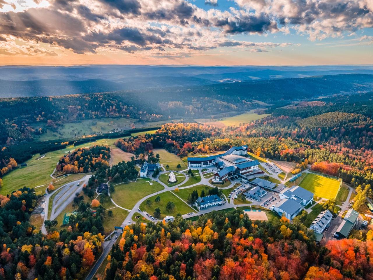 Located on top of a hill 4-star Hotel Arłamów constitutes a recreation, conference and a sport centre. It offers a golf course and a ski complex, an outdoor thermal pool, a helicopter and a small plane landing pad as well as a three storey spa and wellness centre. 4-star Hotel Complex Arłamów features air-conditioned, modern and luxury rooms, some adapted for disabled people. It consists of two parts, a modern one - Hotel Arłamów **** and a historic uncategorised residence connected by the underground passage.