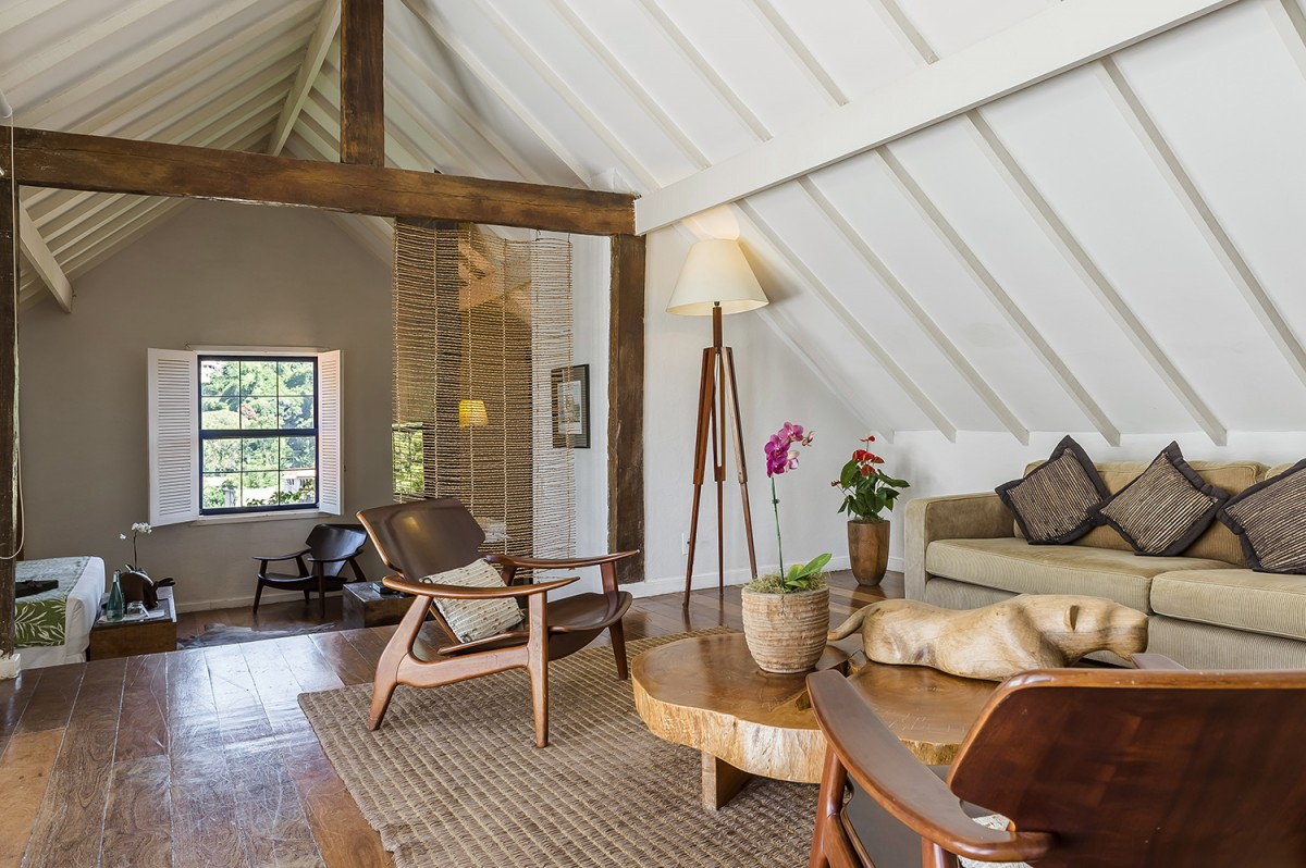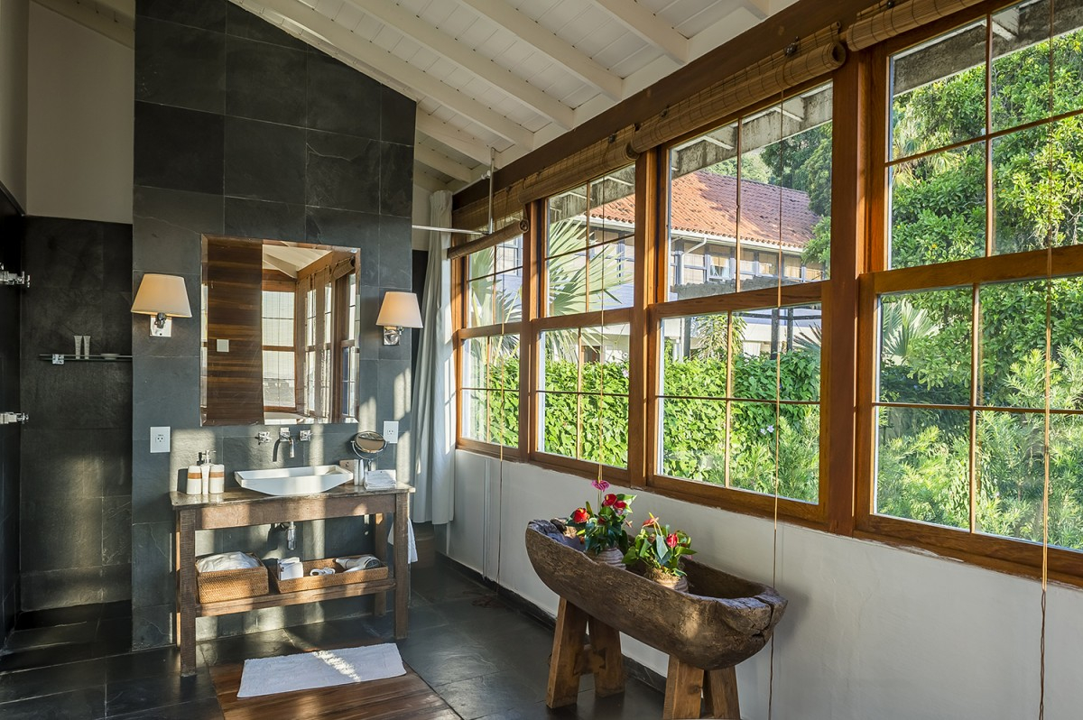 An old farm of coffee. Inspired by the Indigenous and the African roots of the North and East of Brazil, by the great times of coffee, sugarcane and cocoa plantations, the decoration is a travel by the Baroque and the Mystic Brazilian soul. The design architecture project, into the old farm walls, using the burnt cements, the lime stones, the black and golden slates, the dark reddish tropical woods and natural fibers from banana tree, coconuts, bacaba seeds, carnauba leaves, wild cotton, are playing with the contemporary design of artists Sergio Rodrigues, Zemog, Rock Lane or Oficina de Agosto.