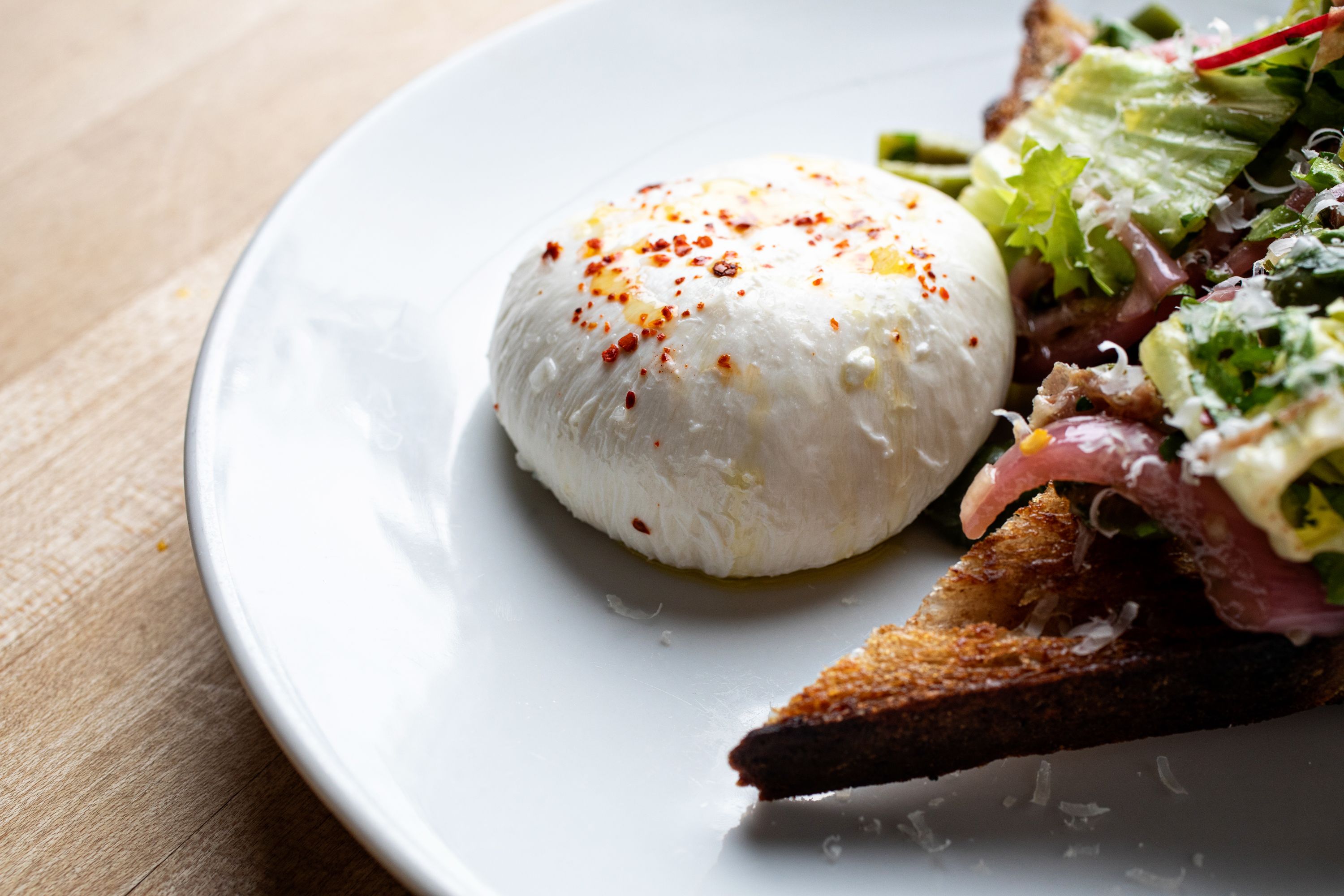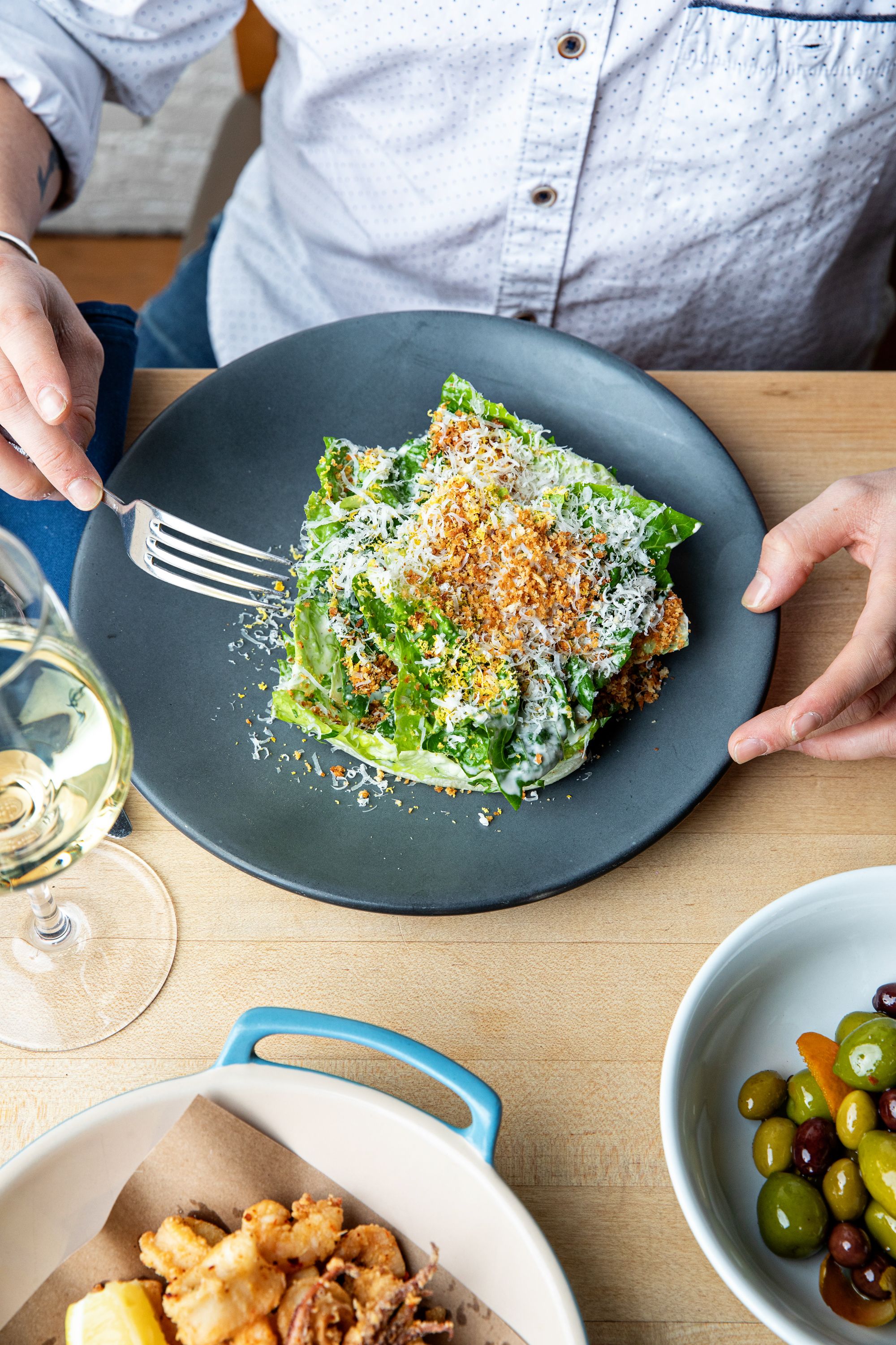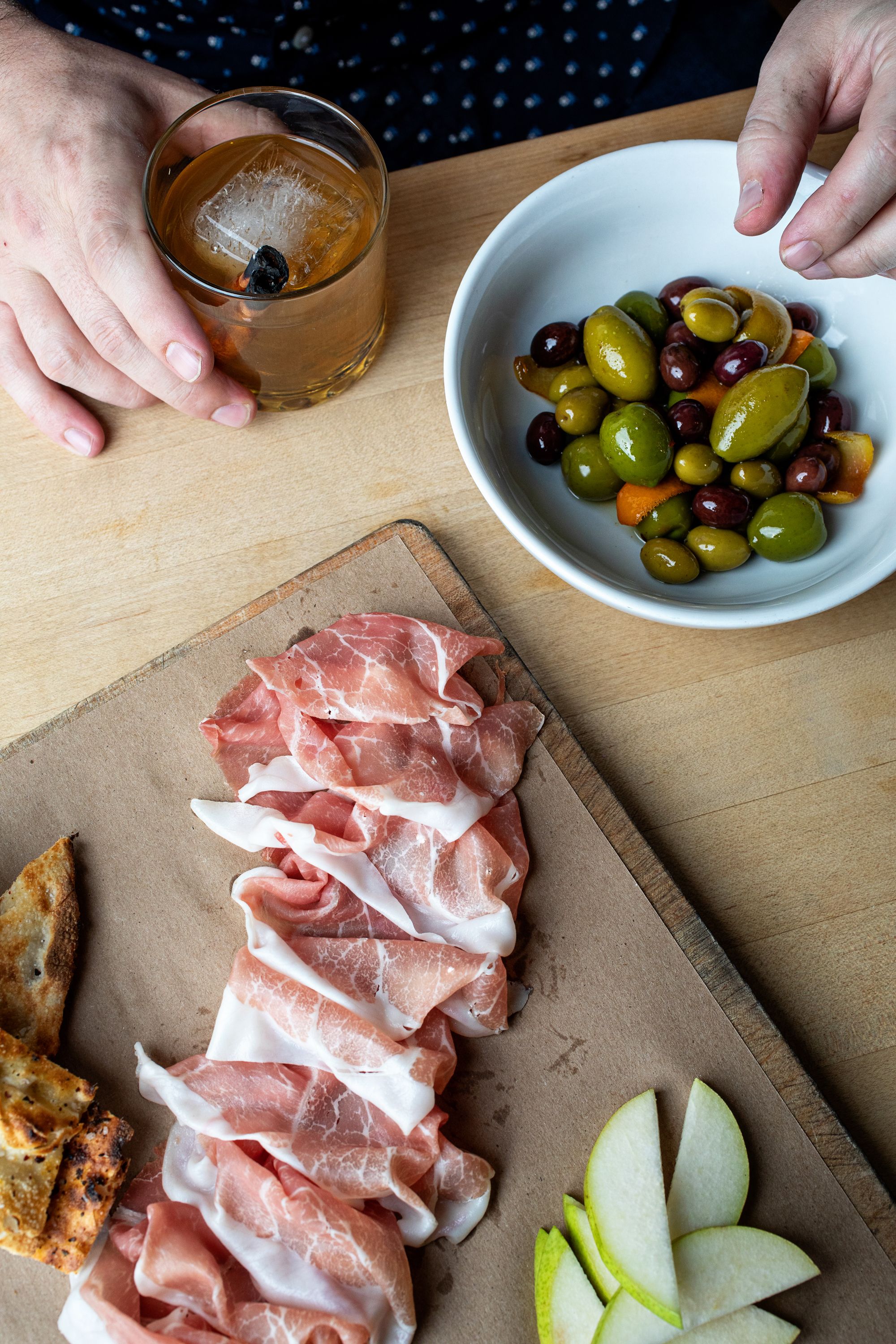 Located on Charleston's Upper King Street, Indaco (Italian for "indigo") serves rustic Italian cuisine. Wood-fired pizzas, hand-crafted pastas, housemade salami and cured sausages fill the restaurant's menu which can be enjoyed family-style or a la carte. With community tables, an open kitchen, and a comfortable atmosphere, Indaco can accommodate 100 guests for a casual night of food and drinks. The wine list is focused on affordable Italian varietals, the Negroni cocktail is on tap, and the fresh sodas are made in-house. The massive wooden doors on Upper King Street are your first indication that Indaco is different from the typical Charleston restaurant. Rustic details continue inside with butcherblock tables, lime-wash walls, and white brick. An open kitchen with nearby community tables lets interested diners keep an eye on the action inside the kitchen. Outside, a patio puts you streetside to watch Upper King Street's vibrant nightlife scene.