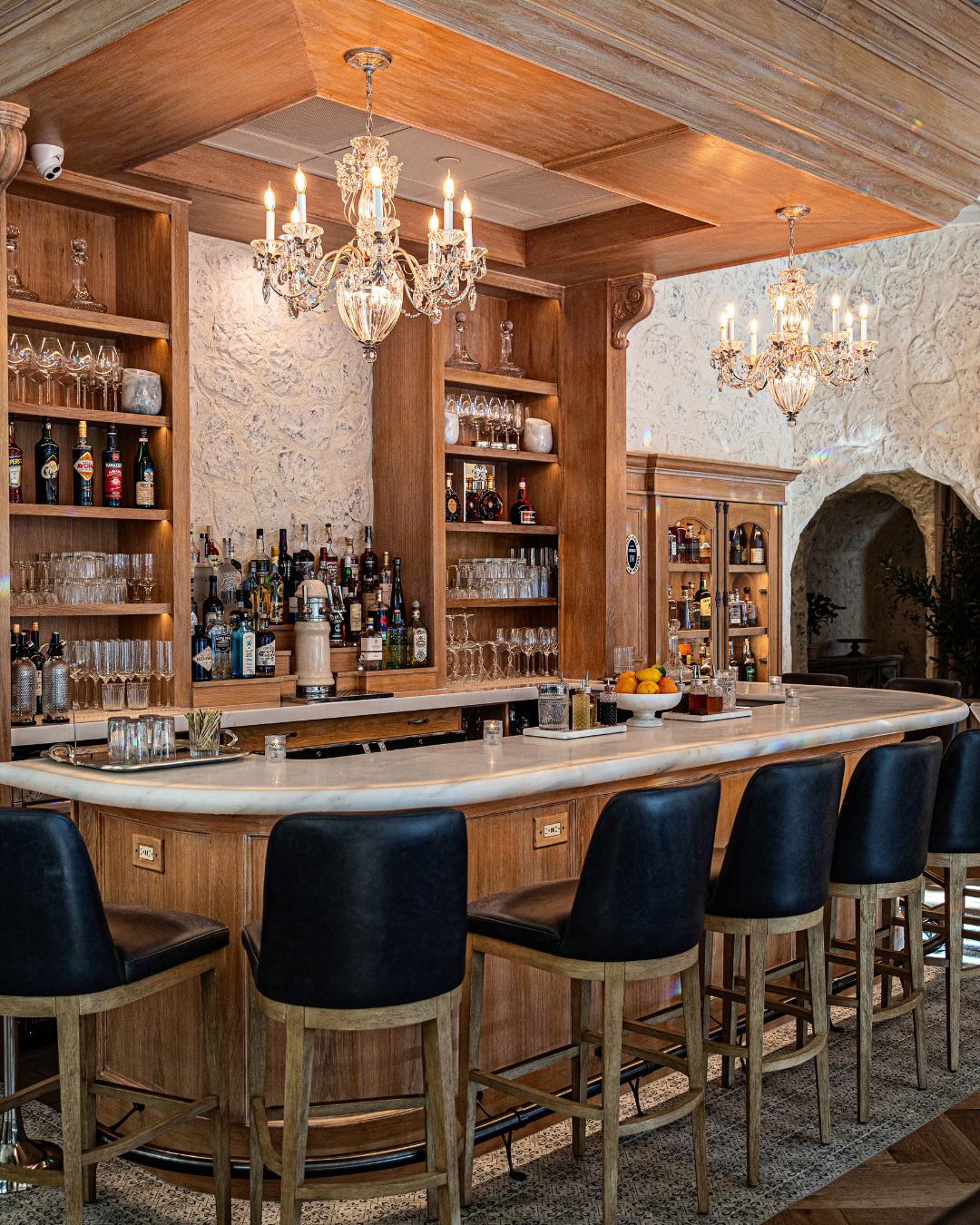 Inspired by the light-soaked villas of the South of France, La Cave provides an elevated backdrop for rehearsal dinners, private brunches, cocktail parties, and beyond. With cozy banquettes and antique mirrors, the lounge evokes classic Provençal style with natural wood finishes, curved light stone walls, organic lavender accents, and olive trees for added charm.