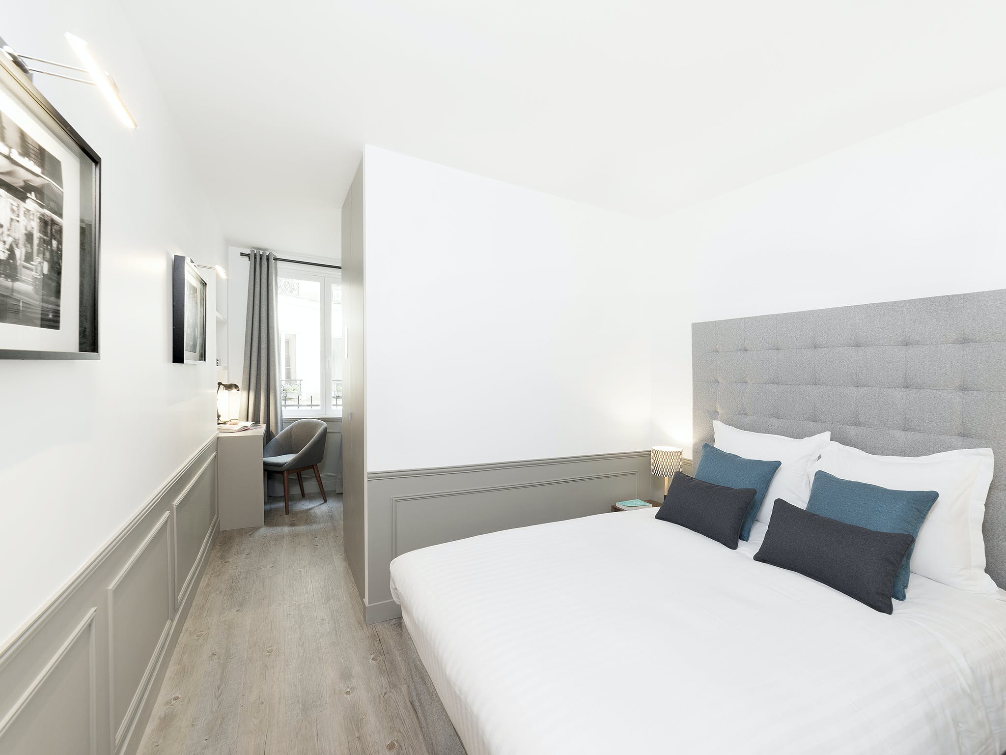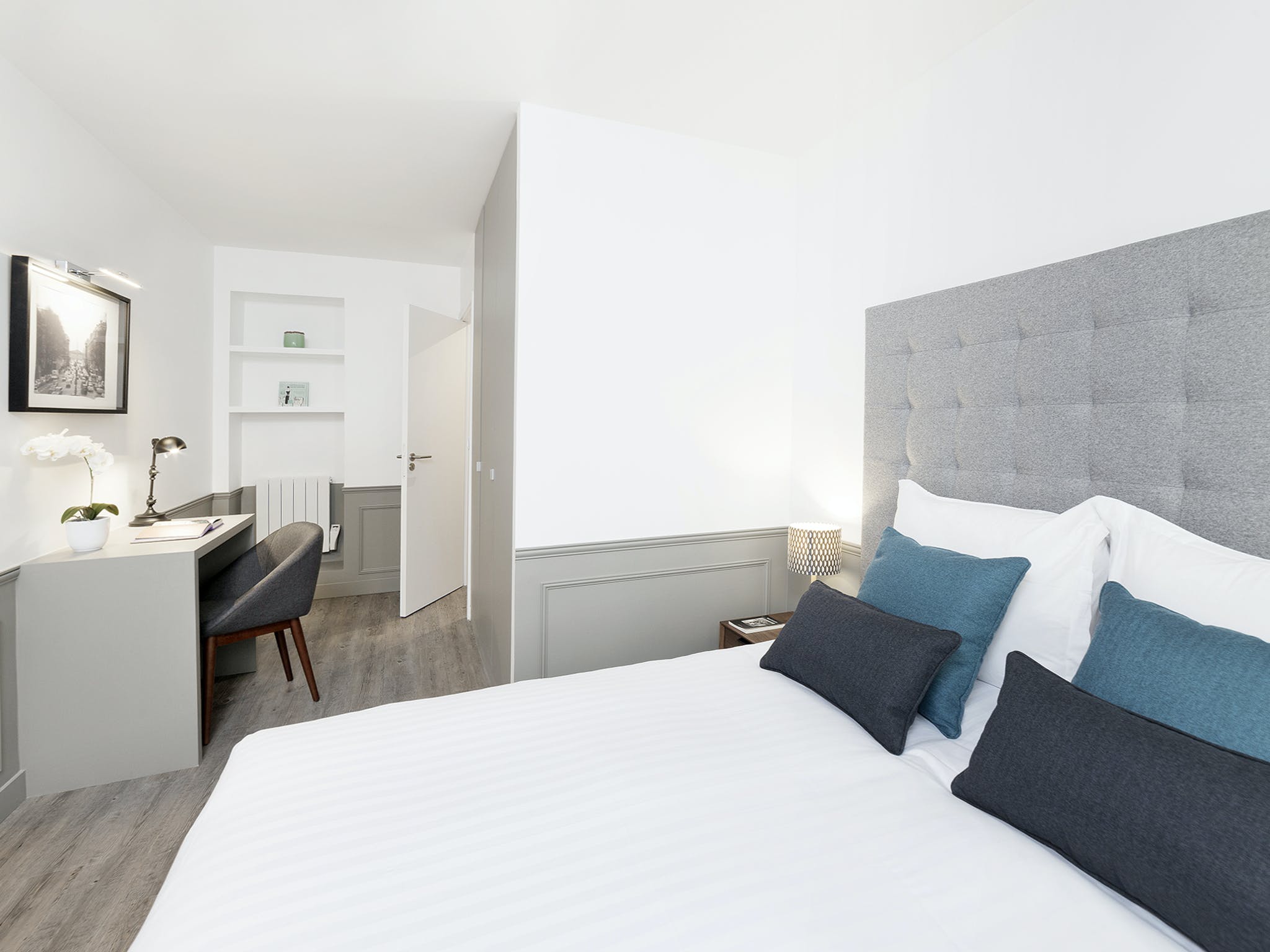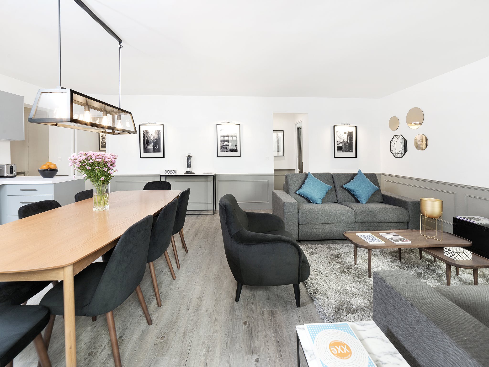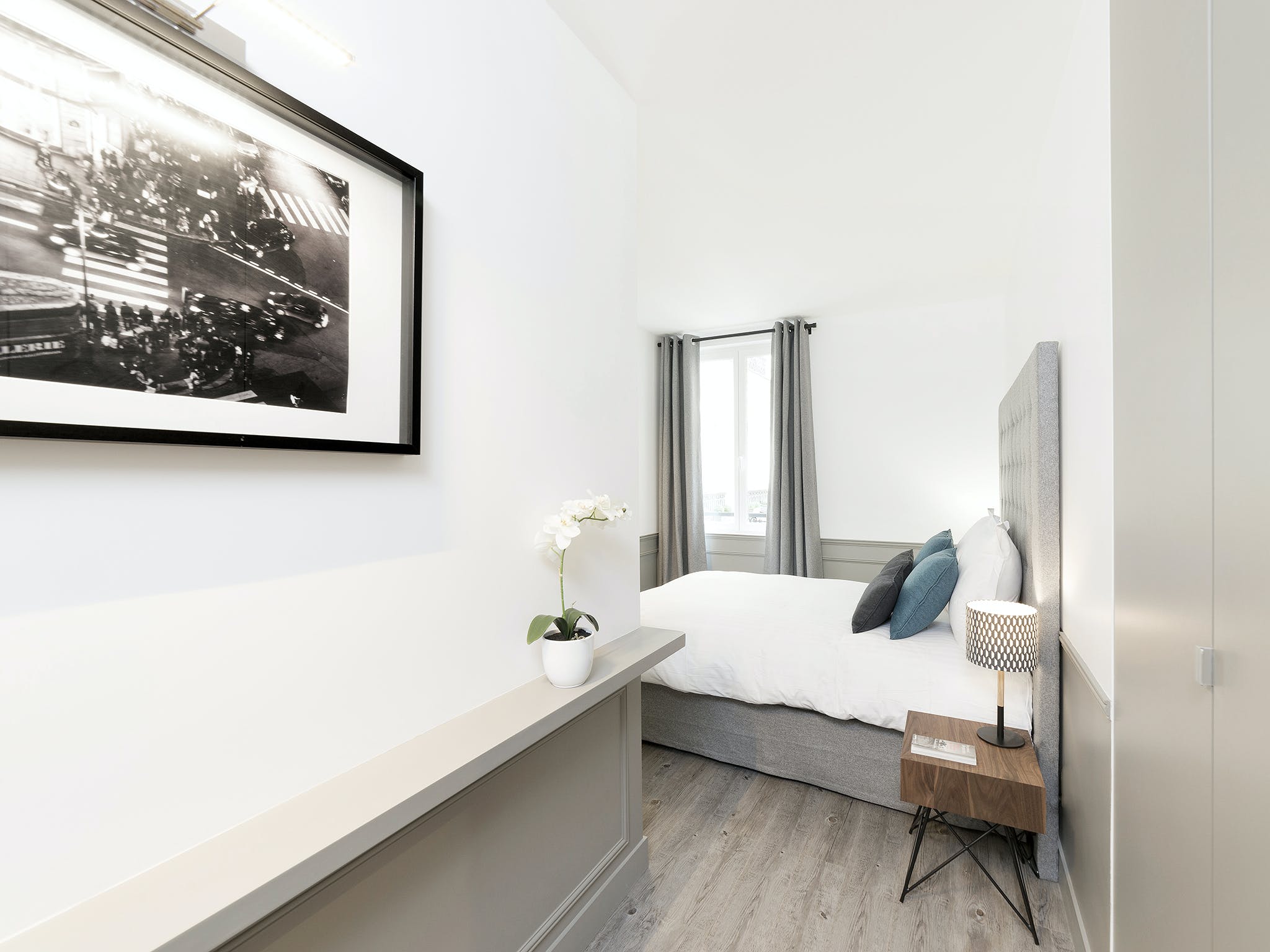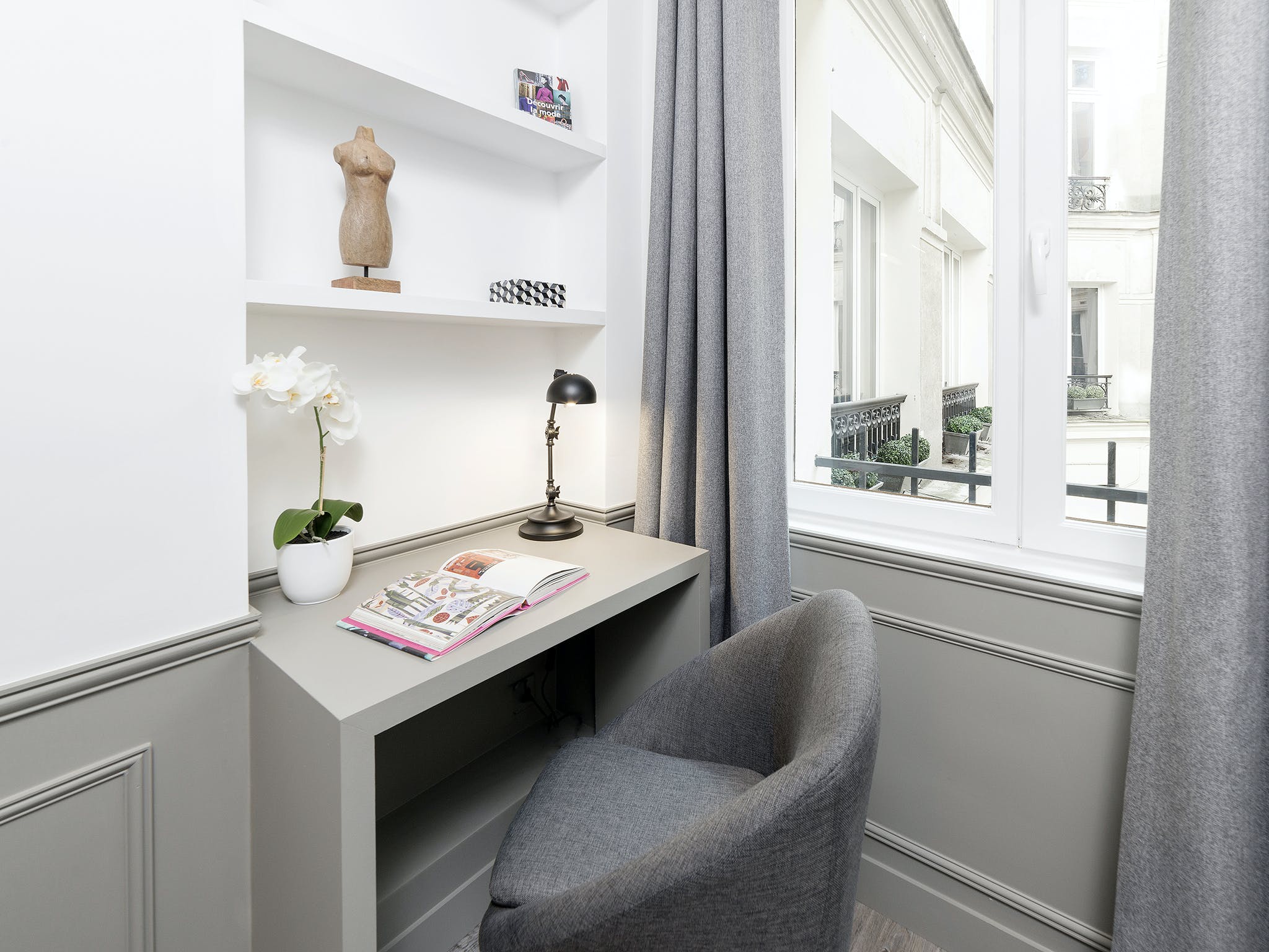 Sitting at the heart of the 3rd arrondissement, Le Marais is famously one of Paris’ most creative and colourful quarters. A favourite of writers, artists, and actors, this bohemian area is full of galleries, boutiques, and eclectic cafés. But with so much excitement going on in the local area, you’ll need a relaxed base to come home to. Just a two-minute stroll from the Arts et Métiers metro station, this apartment makes a statement with its understatement. After experiencing the colour and quirks of your locale, the plush, grey interiors allow you to centre yourself. Sink your feet into the thick, fluffy rug, or recline on the soft sofas. Grey, wood-panelled walls bring a vintage look to the space, along with mid-century furnishings and monochrome photography prints of Parisian scenes. You’re reminded of your arty surroundings with the pops of colour from fresh flowers and blue cushions, but the overall theme is one of muted sophistication, and the charming courtyard views add to the calming atmosphere. When you’re recharged and ready to head out, take a wander east to the Canal Saint-Martin. With hip bars and street food by the waterside, why not stay on for a few cocktails – home is just an eleven-minute walk away.