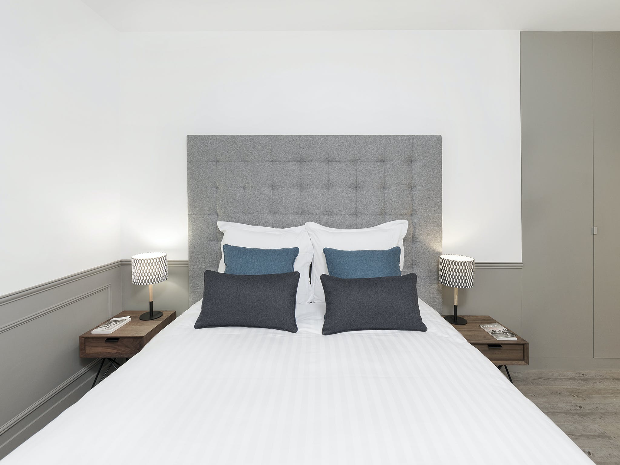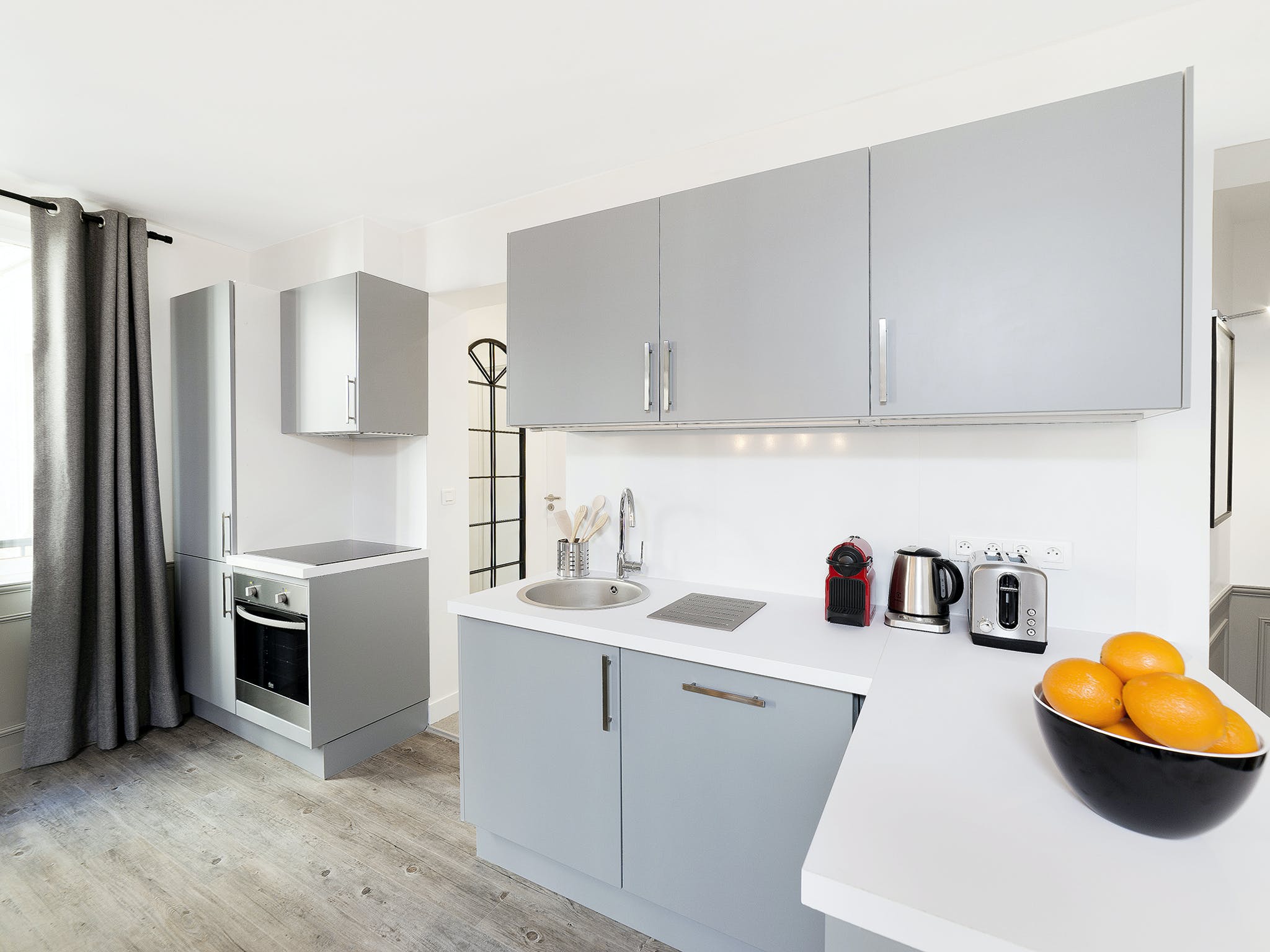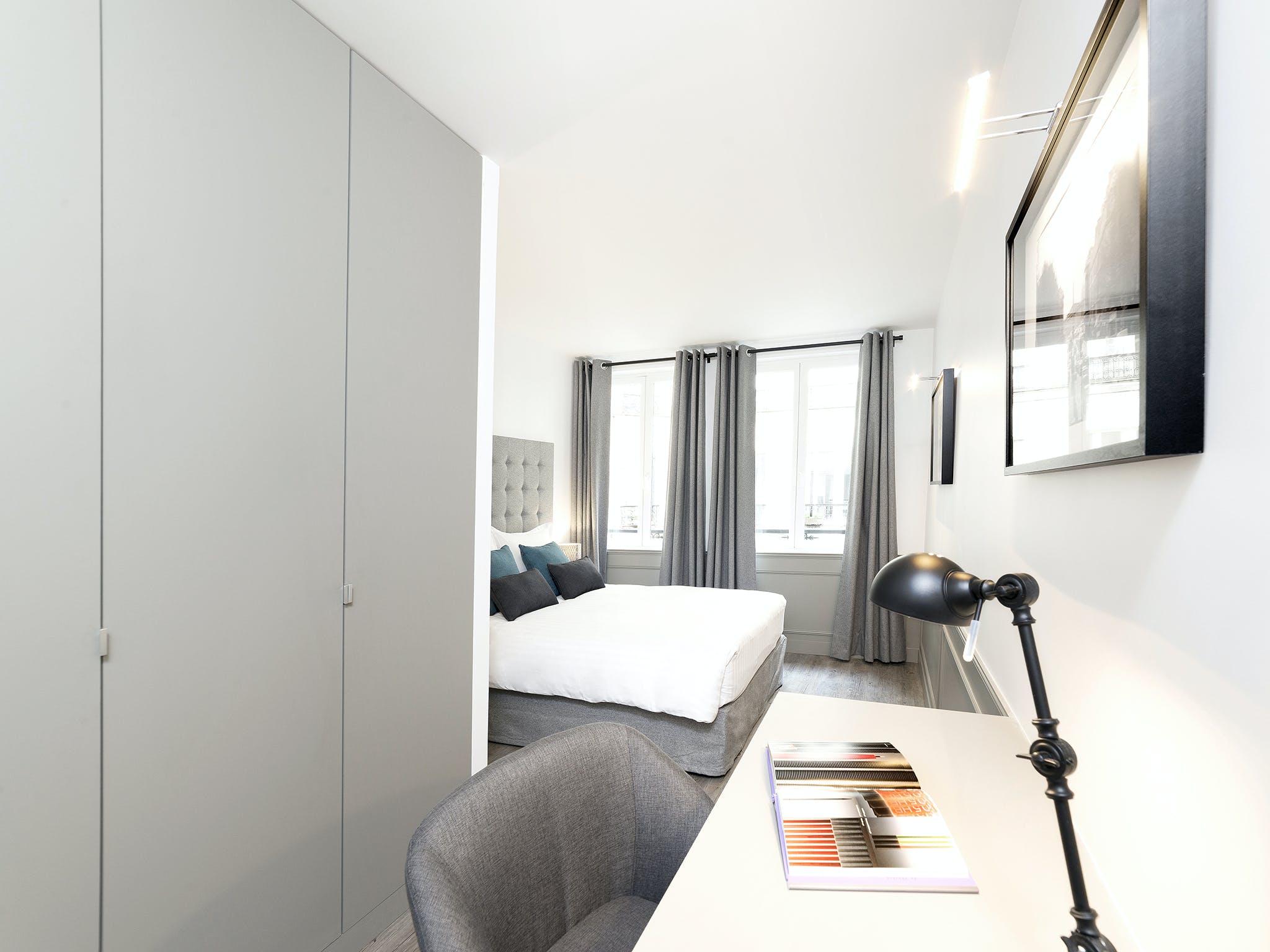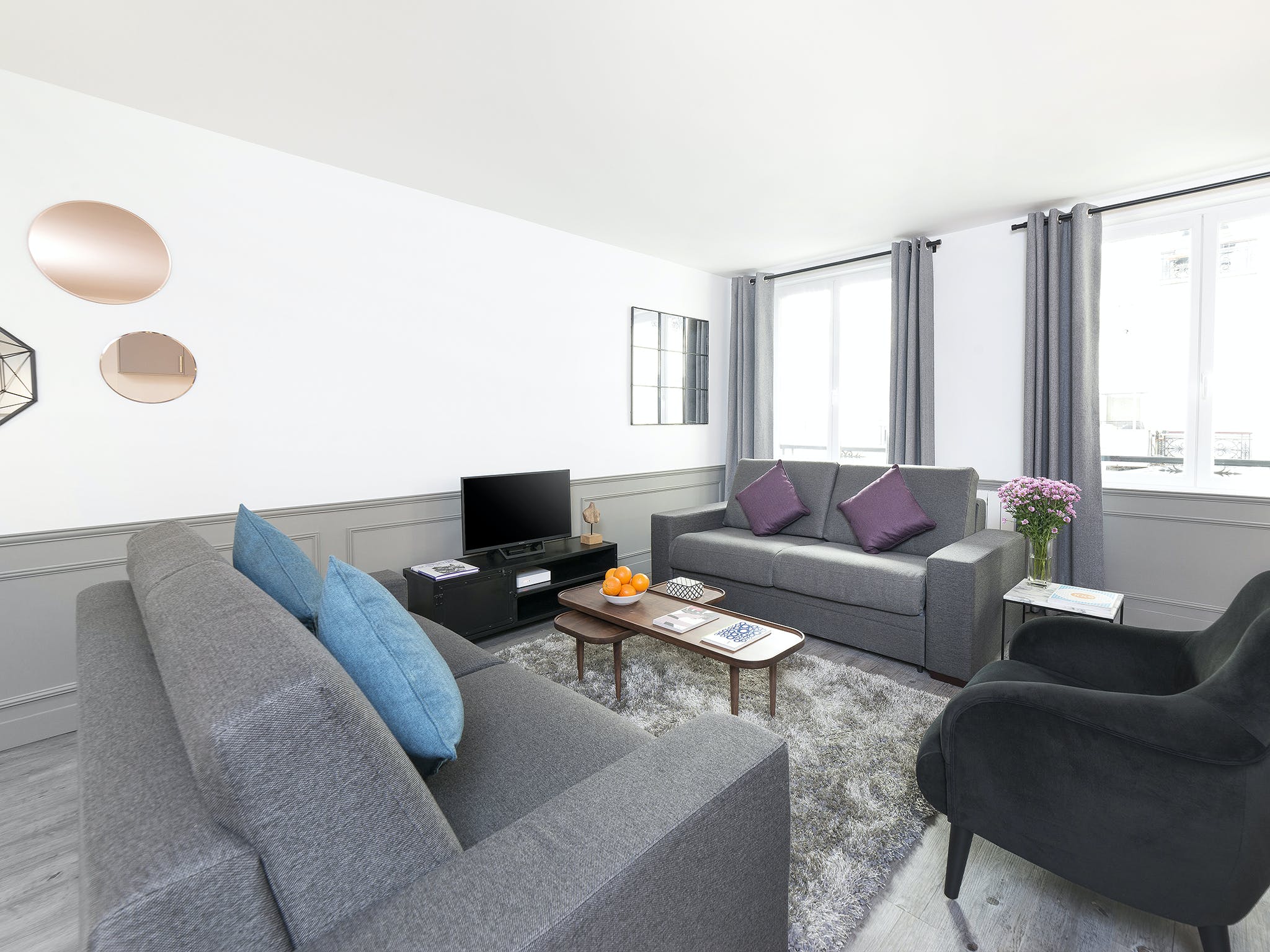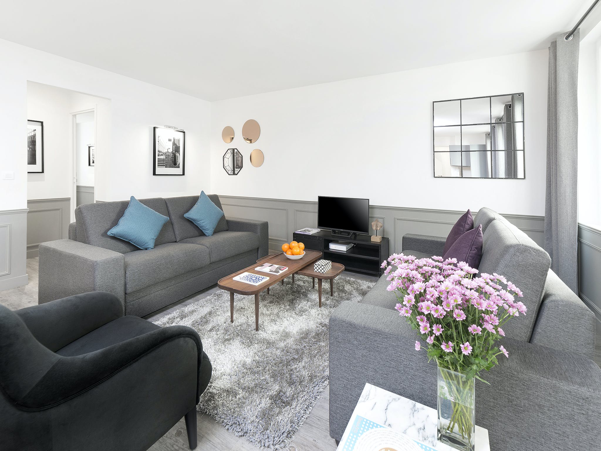 Sitting at the heart of the 3rd arrondissement, Le Marais is famously one of Paris’ most creative and colourful quarters. A favourite of writers, artists, and actors, this bohemian area is full of galleries, boutiques, and eclectic cafés. But with so much excitement going on in the local area, you’ll need a relaxed base to come home to. Just a two-minute stroll from the Arts et Métiers metro station, this apartment makes a statement with its understatement. After experiencing the colour and quirks of your locale, the plush, grey interiors allow you to centre yourself. Sink your feet into the thick, fluffy rug, or recline on the soft sofas. Grey, wood-panelled walls bring a vintage look to the space, along with mid-century furnishings and monochrome photography prints of Parisian scenes. You’re reminded of your arty surroundings with the pops of colour from fresh flowers and blue cushions, but the overall theme is one of muted sophistication, and the charming courtyard views add to the calming atmosphere. When you’re recharged and ready to head out, take a wander east to the Canal Saint-Martin. With hip bars and street food by the waterside, why not stay on for a few cocktails – home is just an eleven-minute walk away.