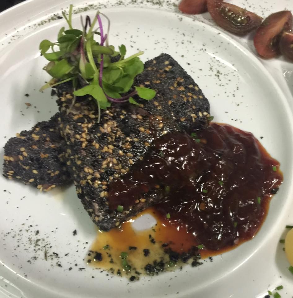 Local con decoración de diseño sencillo y paredes rojas que sirve platos españoles con un toque creativo.