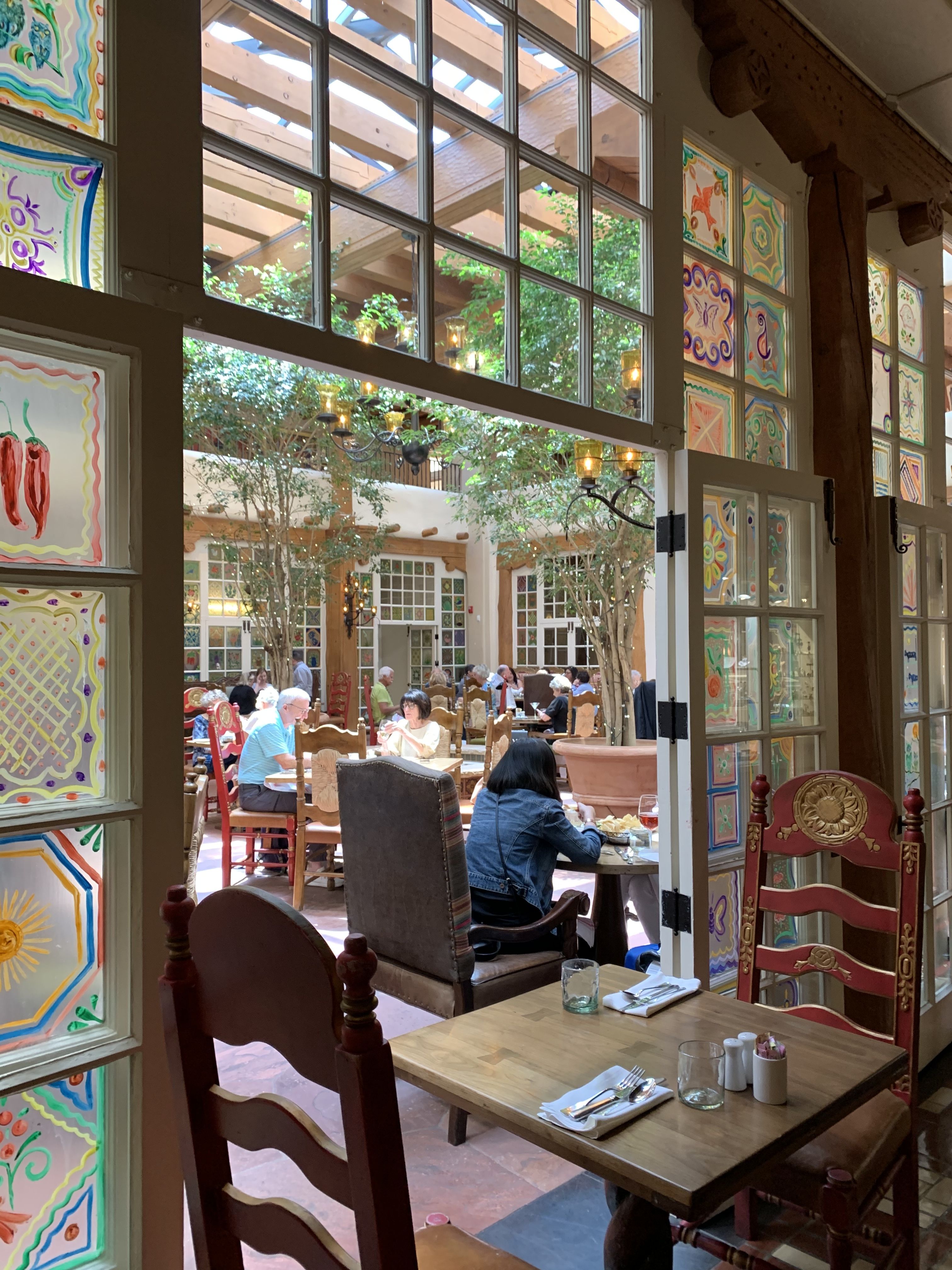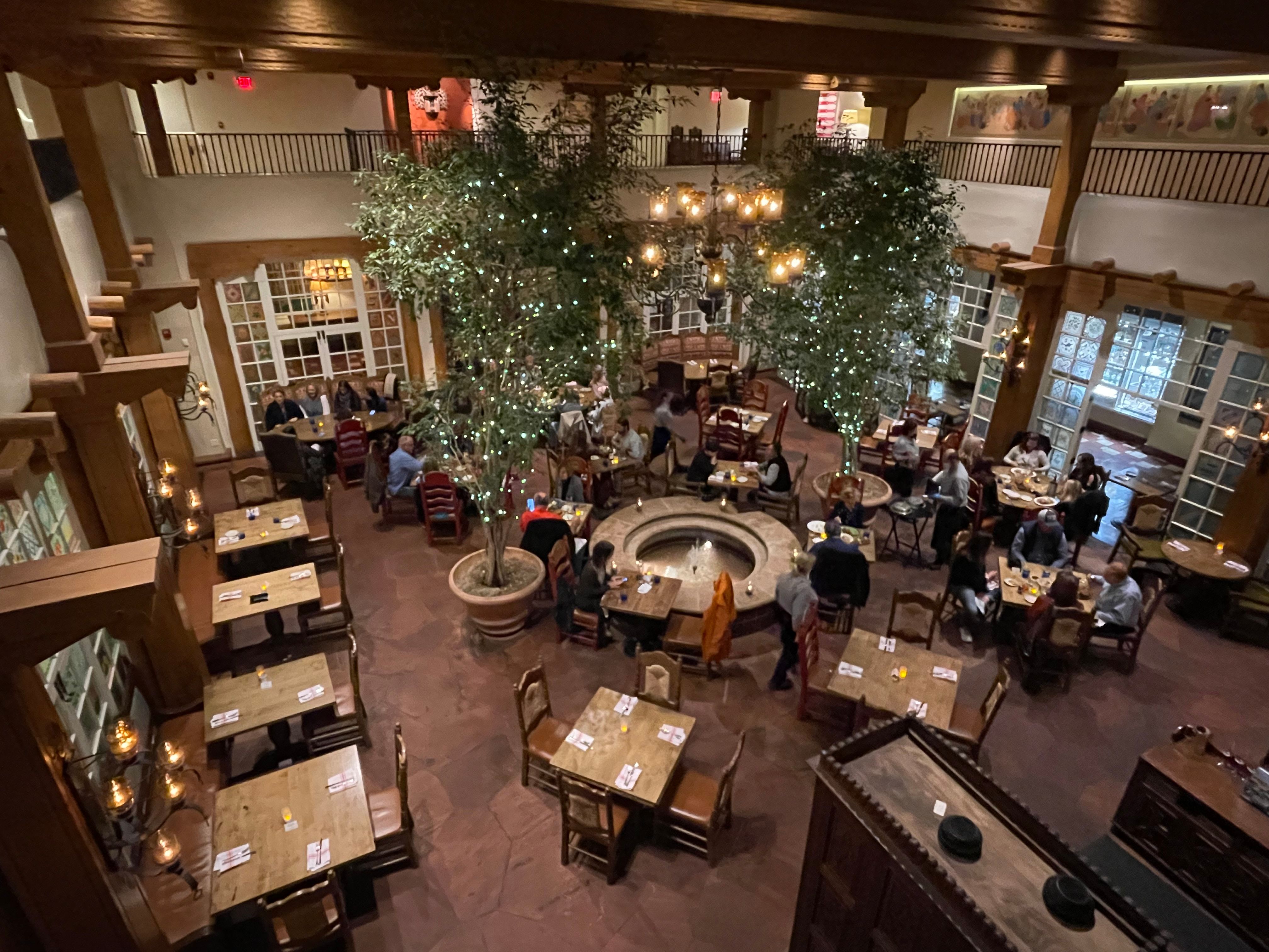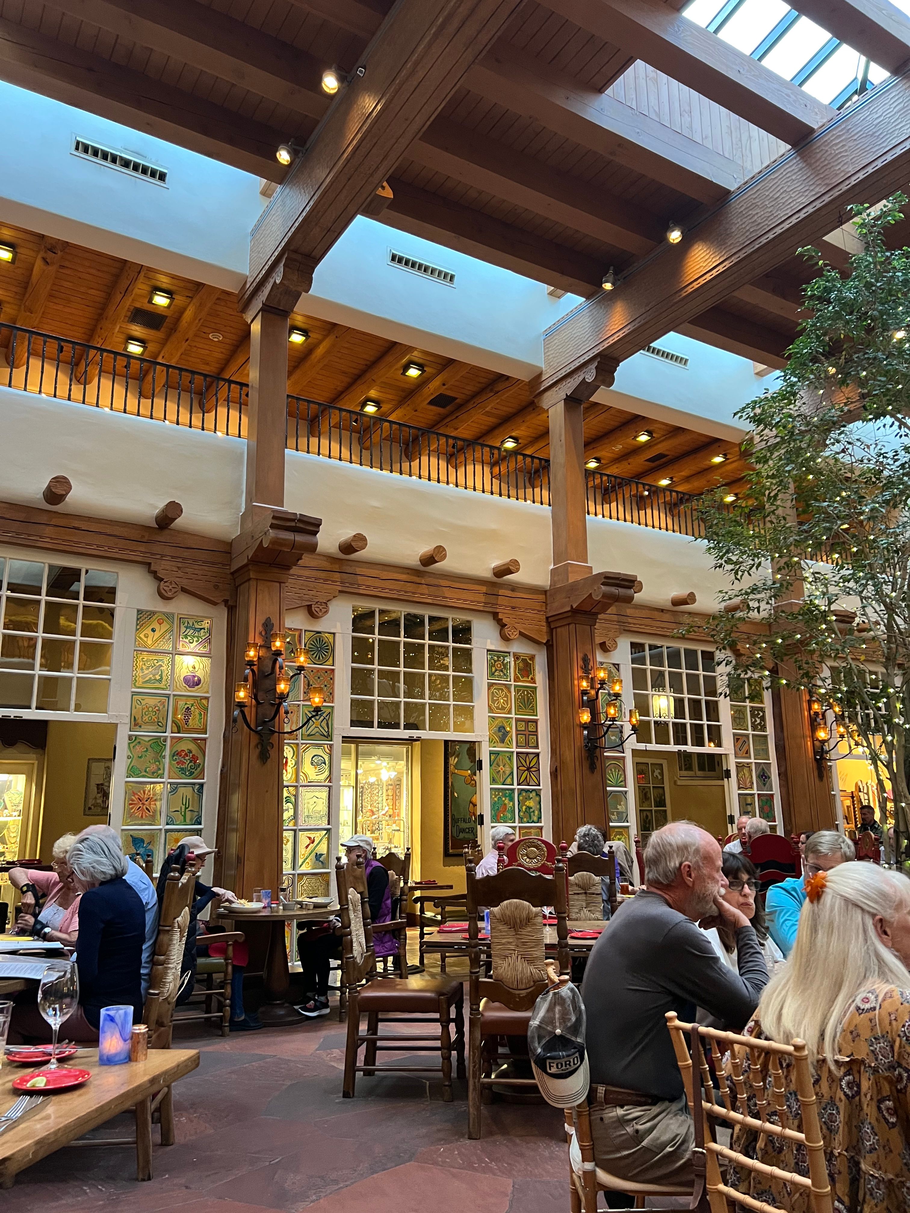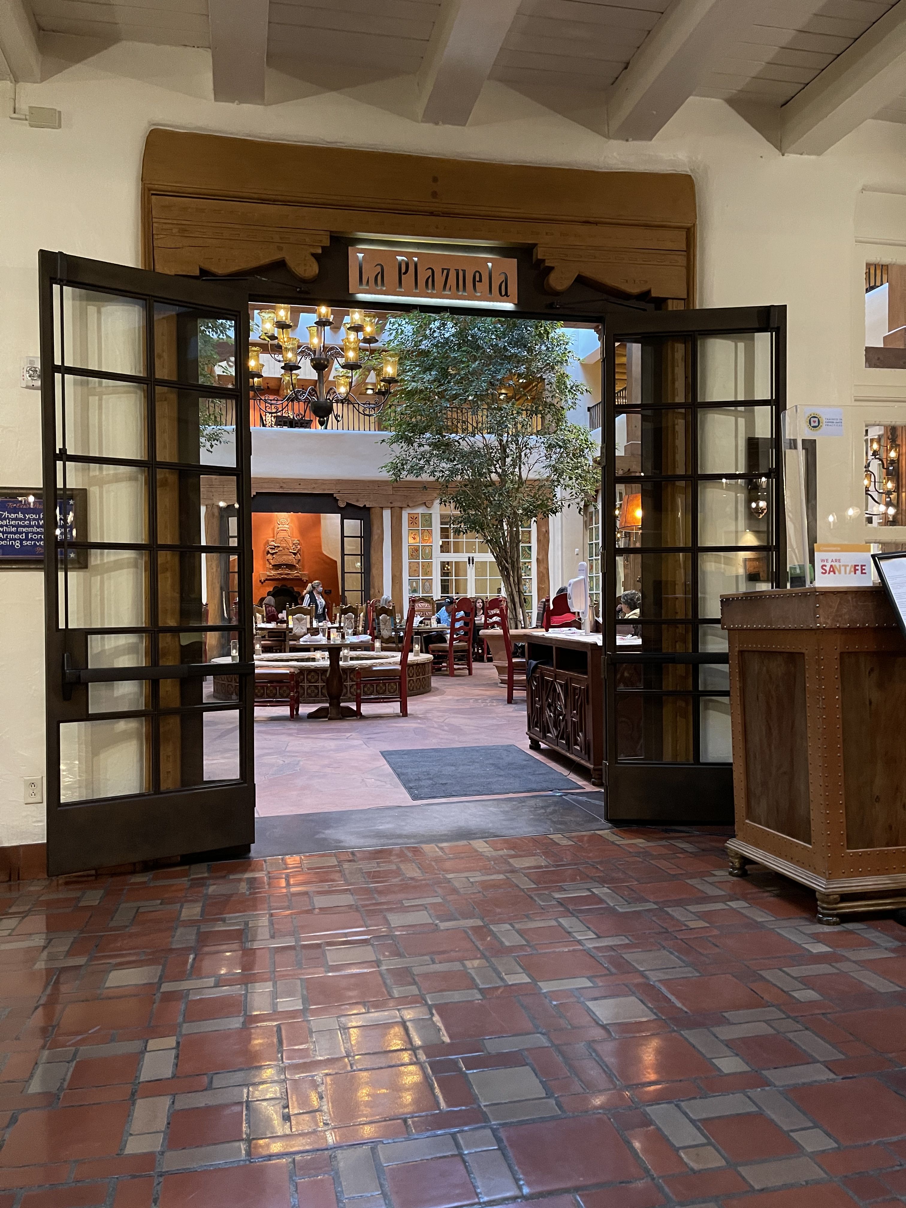 We do not accept reservations for breakfast and lunch, it is walk-in based only.In consideration of our dining reservations, we kindly ask you to abide by the following time courtesy standards: 1-2 Guests; 1 Hour 30 Minutes 3-5 Guests; 1 Hour 45 Minutes 6-8 Guests; 2 Hours 9-12 Guests; Reservations are only available at designated times (4:30-5:30, 7:30, 8:00) - 2 Hours 30 minutes*For parties of more than 12 guests please call our Dining Room at (505) 995-2334 La Plazuela was the hotel’s original 1920s patio and it retains that sunlit Old World charm. Skylights flood the dining room with natural light and handsome carved furnishings, artisanal lighting, and our much-loved hand painted windows create a beautiful, inviting room to gather, to dine and to make memories in. The menu was crafted to showcase old favorites with New World influences and authentic New Mexican cuisine. La Plazuela at La Fonda on the Plaza is Santa Fe’s gathering place. Come dine with us!