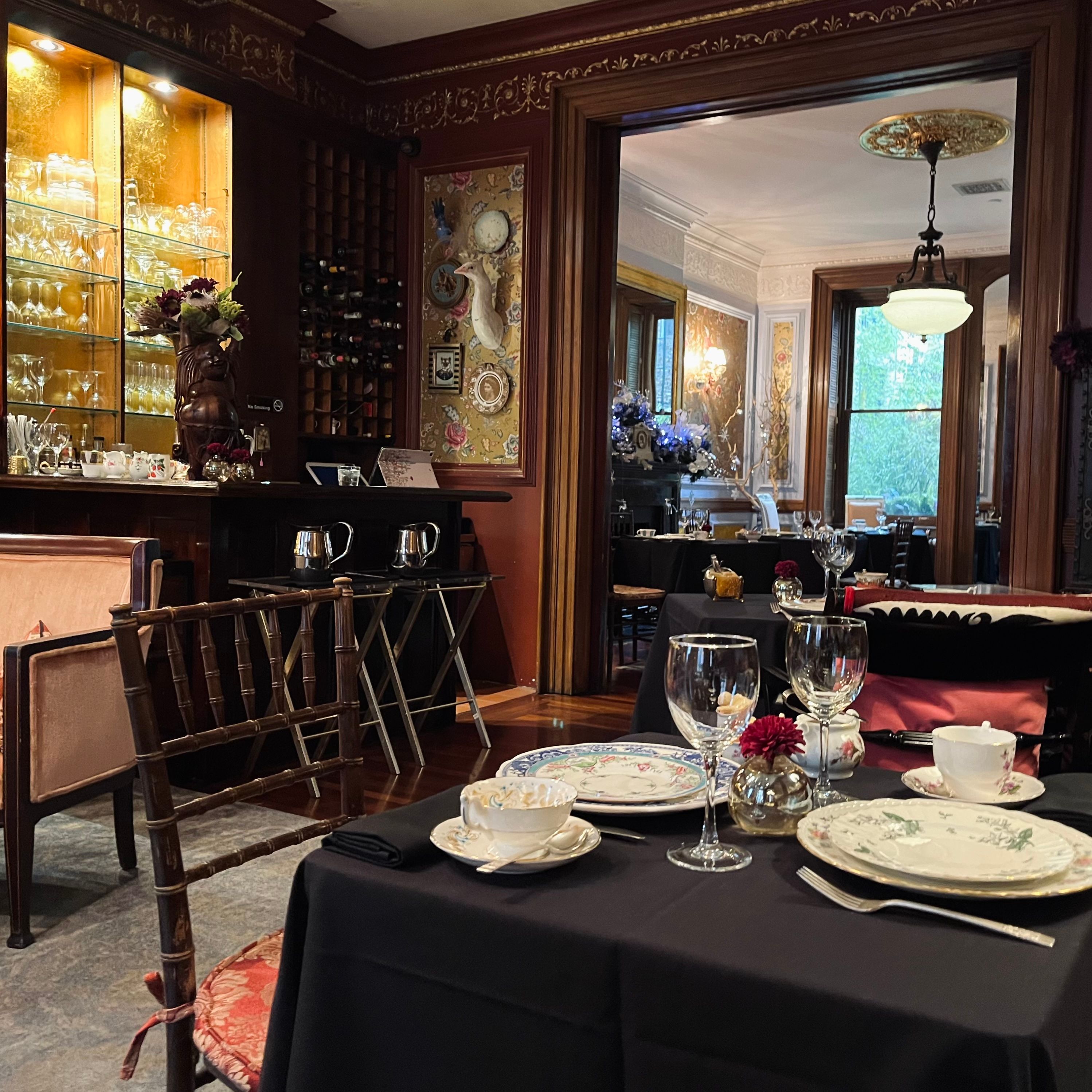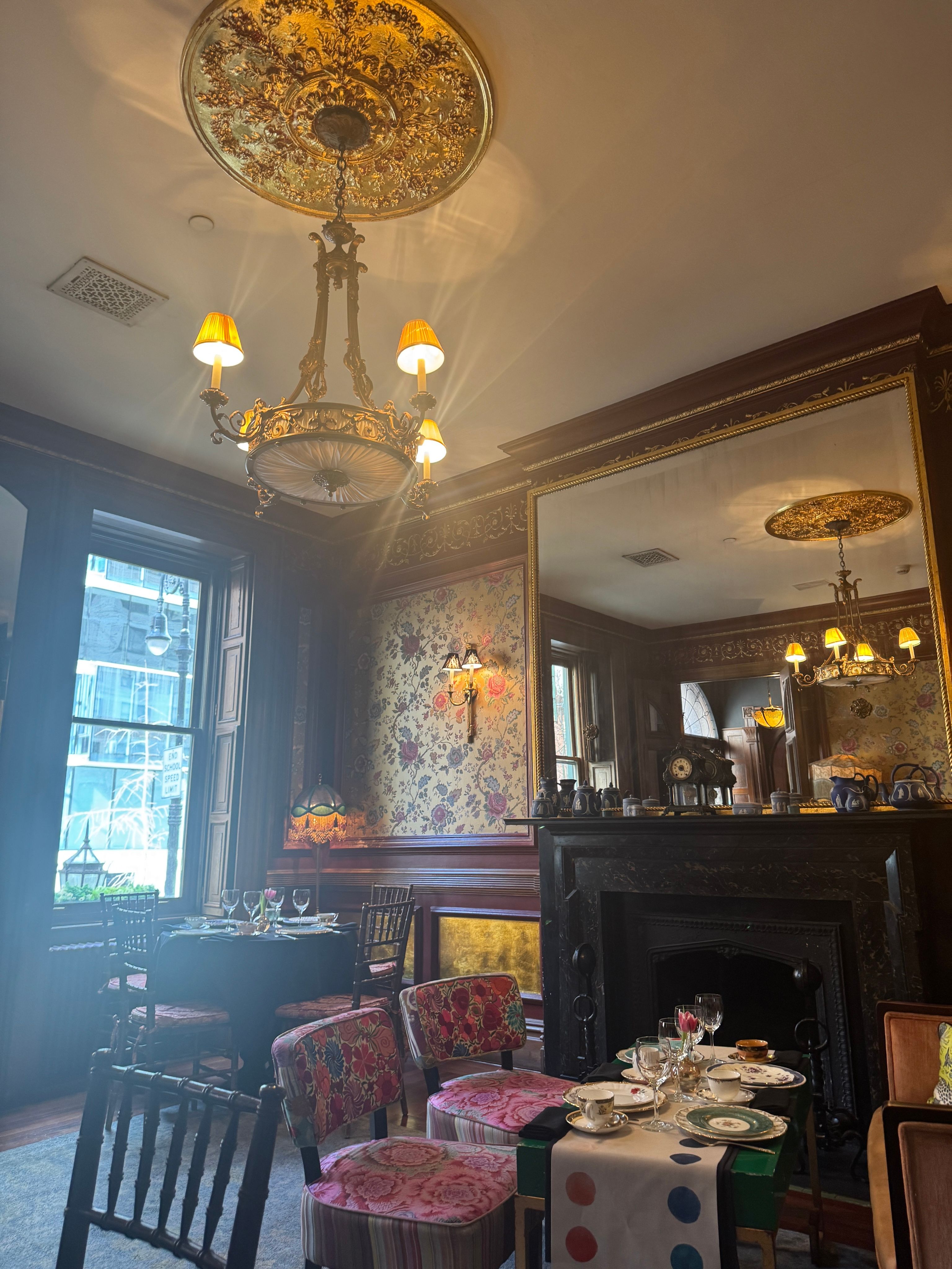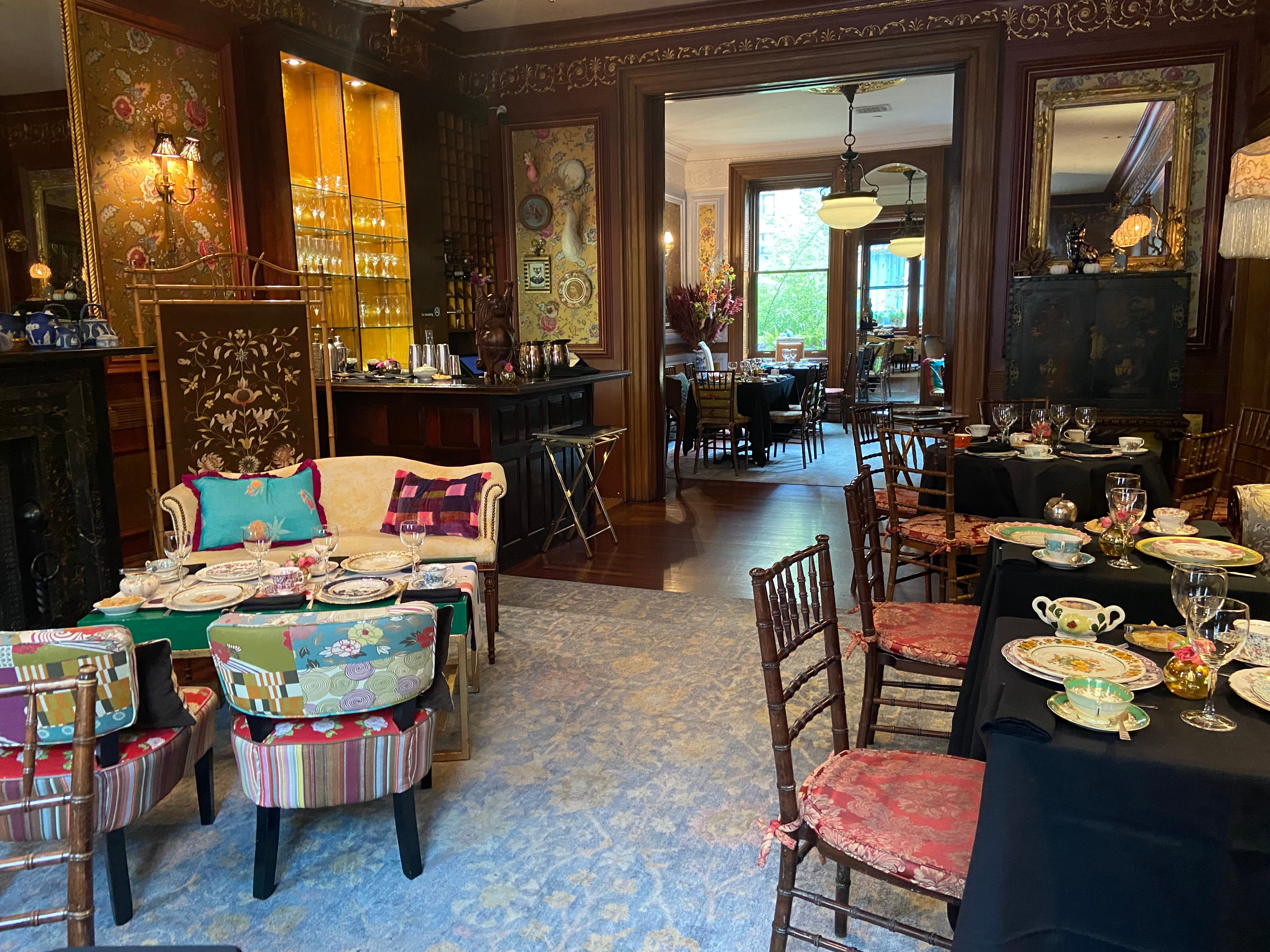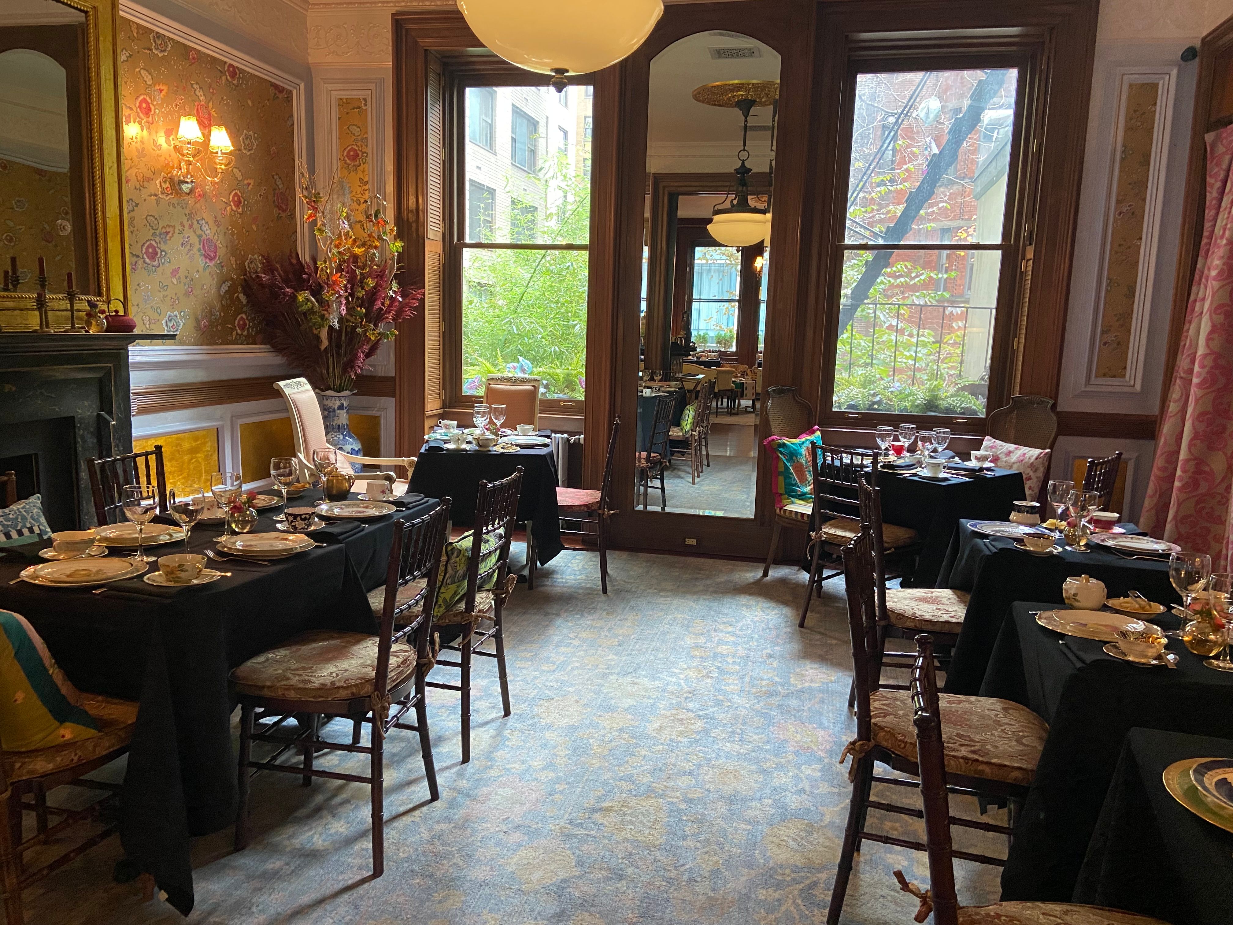 Our $89 prix fixe tea service is offered Tuesday through Sunday.Lady Mendl's is an unconventionally chic tea salon housed within a Georgian brownstone in the Gramercy Park neighborhood of Manhattan. An opulent five-course tea is served in an eclectic and whimsical parlor by a doting staff. Patrons sip tea from hand culled vintage Wedgwood teacups as they nibble dainty finger sandwiches and house baked scones. Please note that our entrance is only accessible via a staircase of 10 steps. We do not have an elevator.