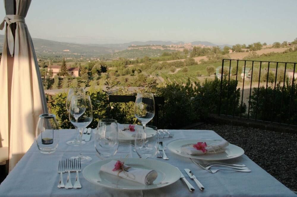 A buffet breakfast of homemade croissants, cakes and marmalades is served each morning. The restaurant, open on request, serves a fixed menu of Umbrian specialities at dinner.