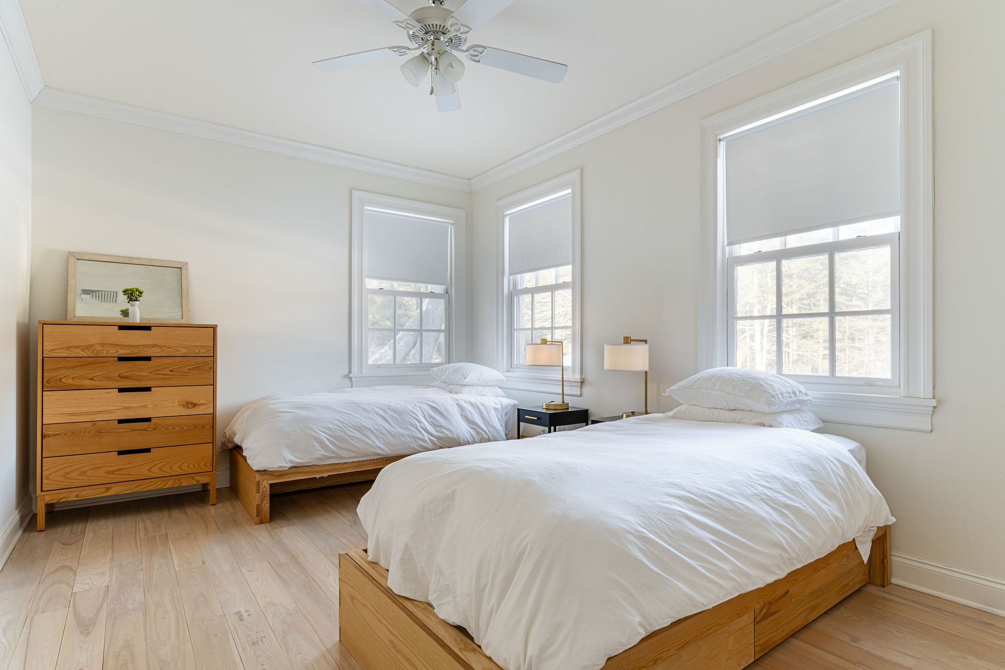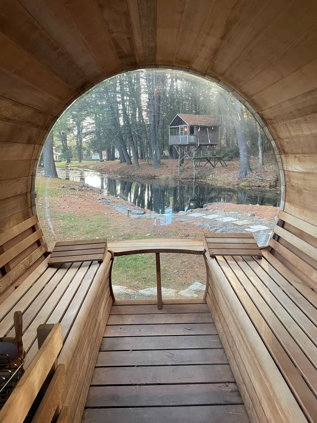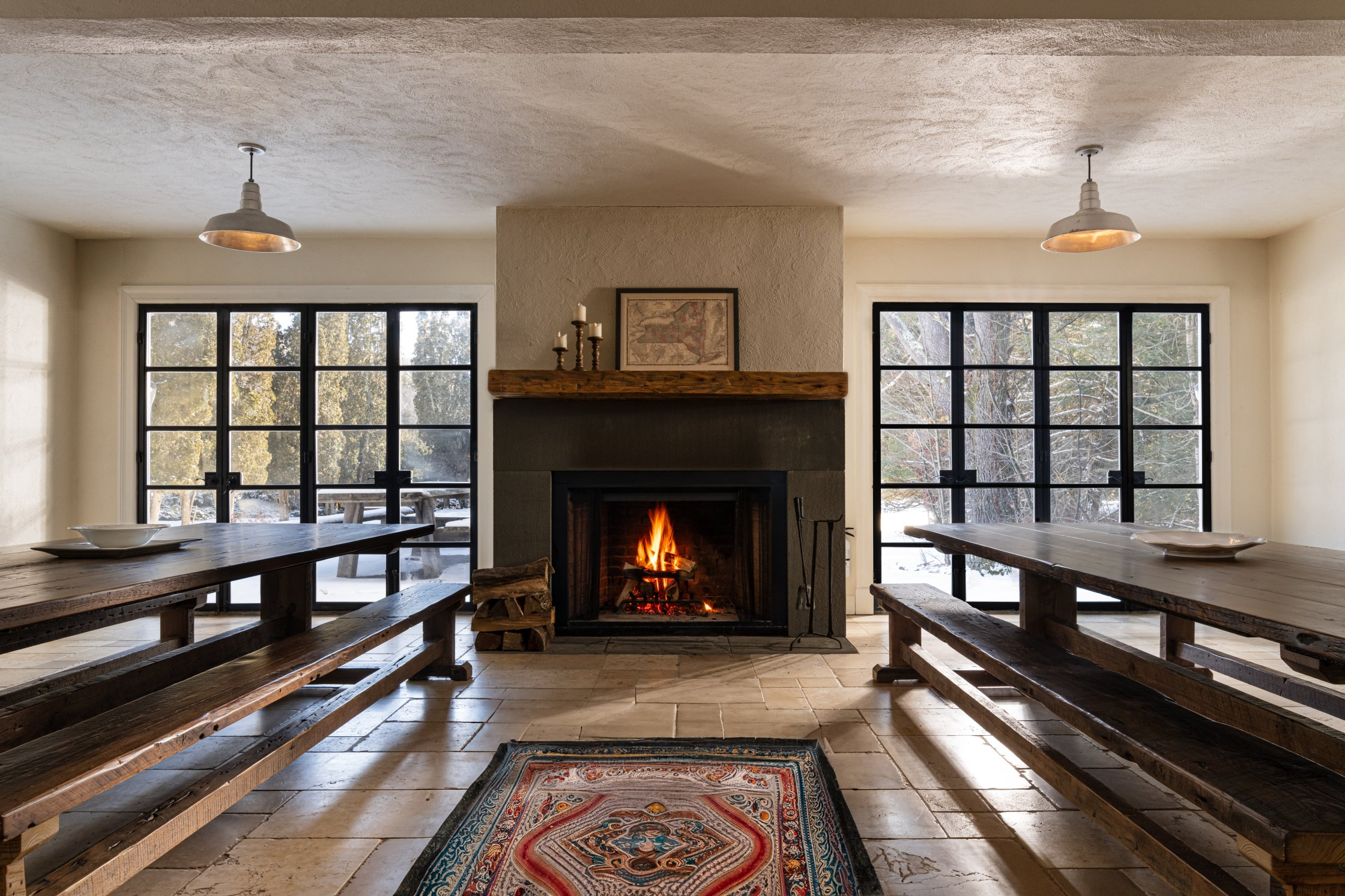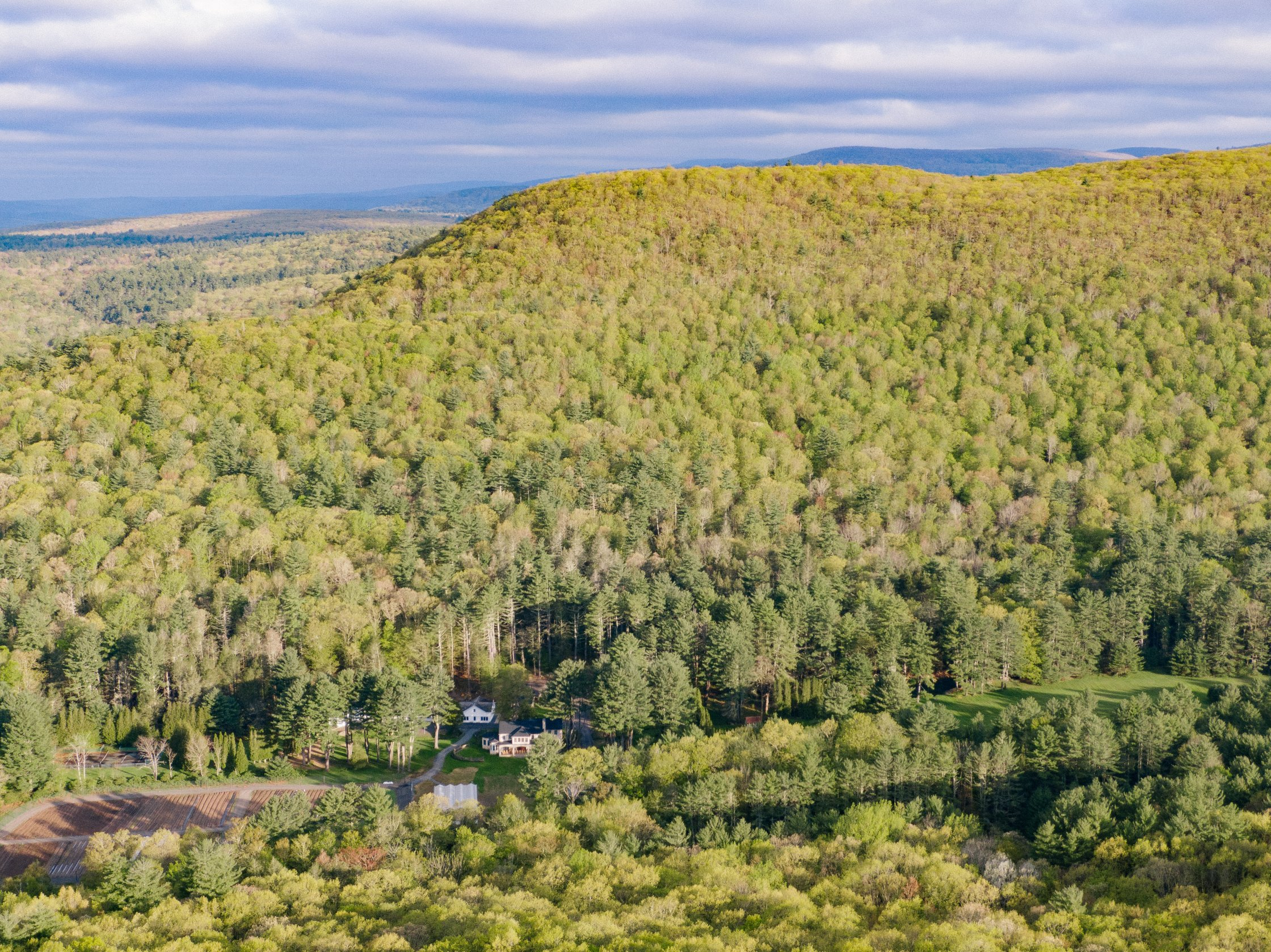 The estate is set in a mountainous valley and caters to long walks, bike rides, and hiking. There is a spring-fed pond—with rope swings— a saltwater pool for swimming & a state-of-the-art Sauna. Guests stay in two distinct villas that feature comfortable & luxuriously appointed common rooms, reading nooks, fireplaces, stone patios, dining rooms, and a game room with a video projector. We have added a greenhouse, 4-acre regenerative organic farm, and chef kitchen in our revitalization of the estate. We refurbished the building interiors and restored the horse stable into a movement studio. The property is the home of an apple, peach, and pear orchard, a compost site, laying hens, and bees. Lundy House contains multiple well-appointed communal spaces, living rooms, an open kitchen, sunroom, a game room with billiards, a music room with a record player and fireplace, 7 bedrooms and 7 bathrooms, and stone patios surrounding the house. The Guest House has 5 bedrooms, 5.5 baths, a commercial kitchen, and the main communal dining room with a large fireplace and patio. The Barn encloses the movement and meditation space next to a workout room equipped with stationary cardio machines and free weights.