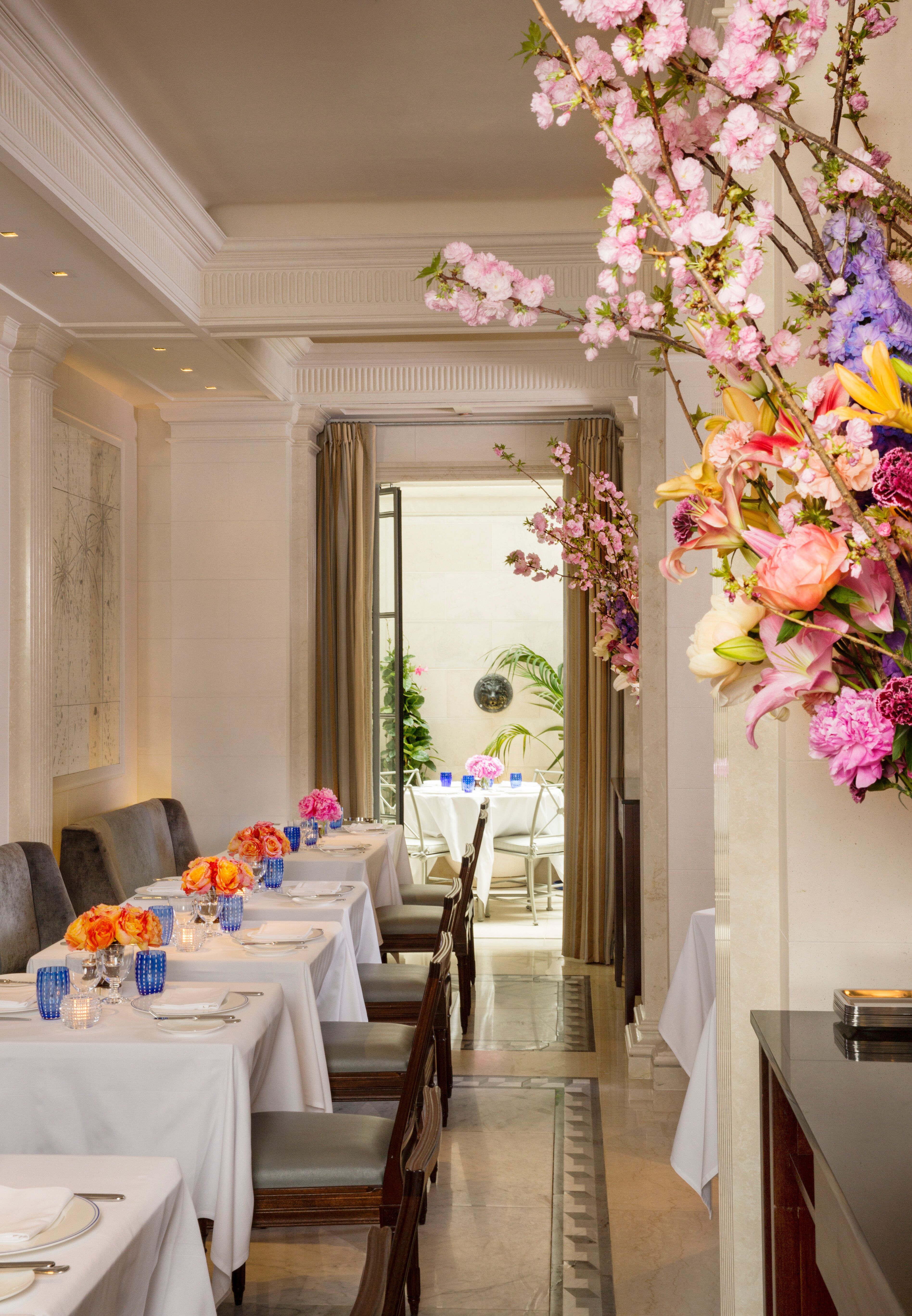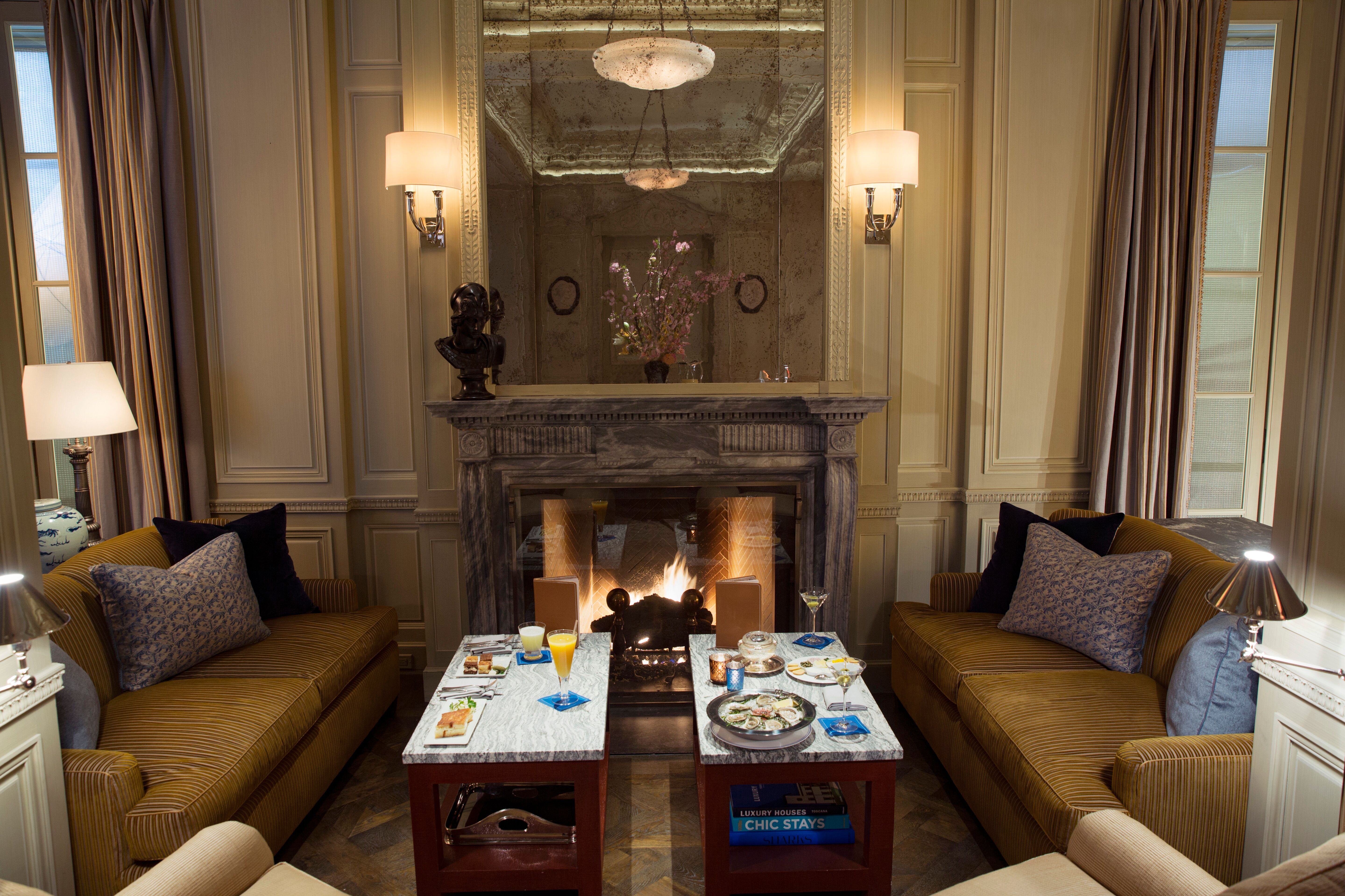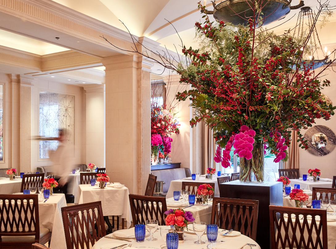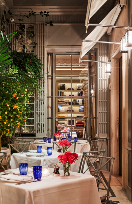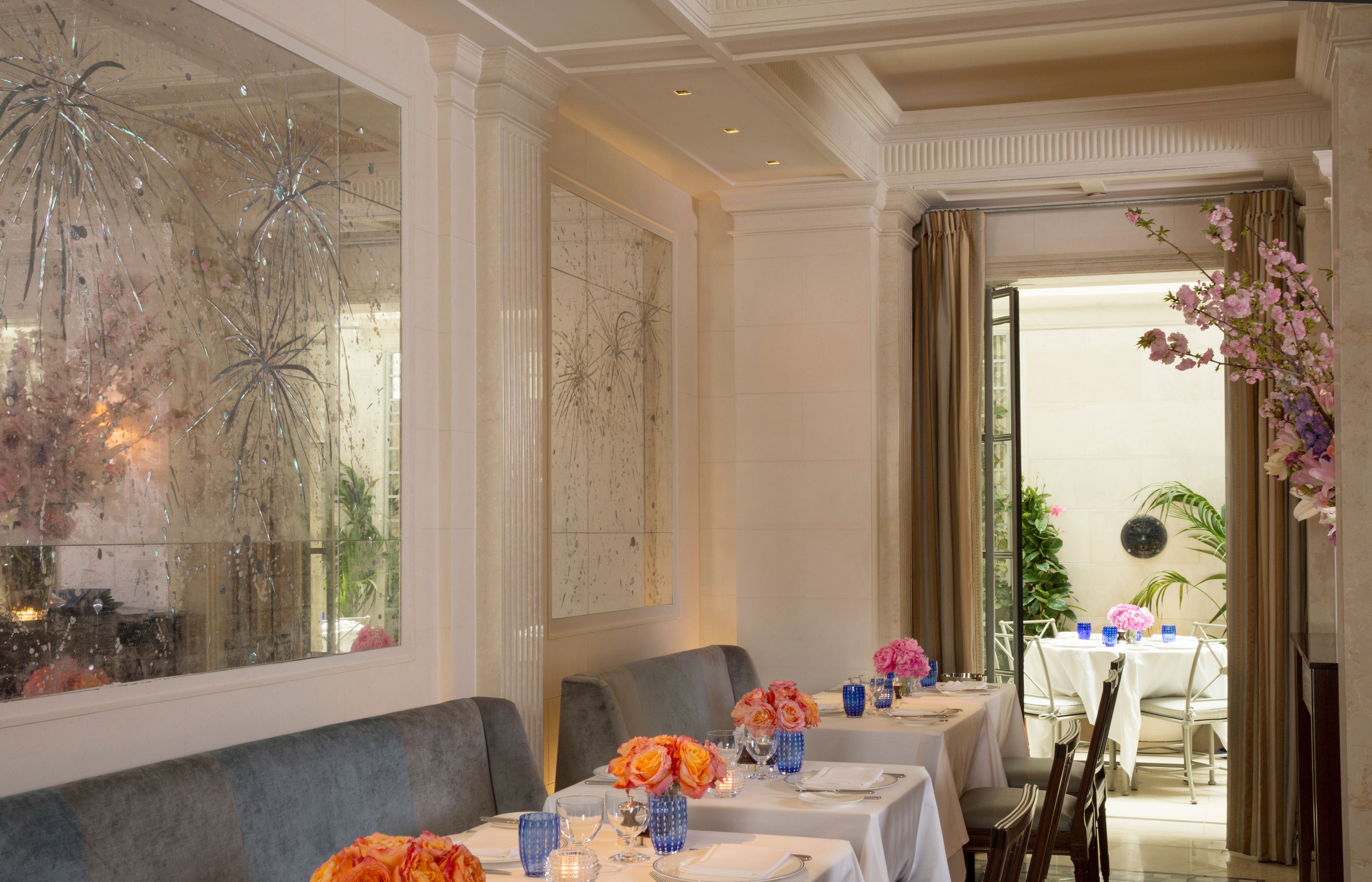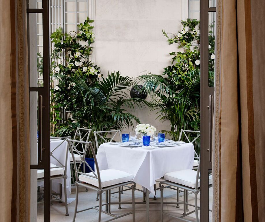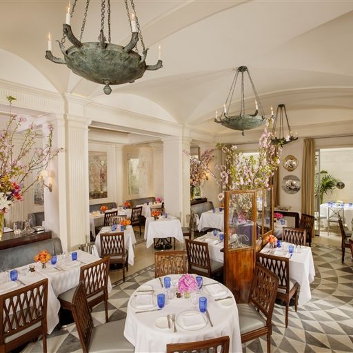 Intimate bar and beautiful lounge lead to unique restaurant with an open garden.The subtly lit French oak paneled bar greets you with booth banquettes and tables amenable to serve Jacques’ Bar Menu, all day.The Club Room: its coffered ceilings and fireplace creates familiarity in the comfort of a warm elegant home.Both the lounge and the bar menus offer spontaneously prepared French delicacies, savory and sweet with distinct Mediterranean and Moroccan influence.“Majorelle” restaurant: its vaulted ceiling, marble columns, and trellised garden with up-lighted fountains set the stage for fine French Cuisine and Service in an atmosphere of harmony and luxury for all the senses.