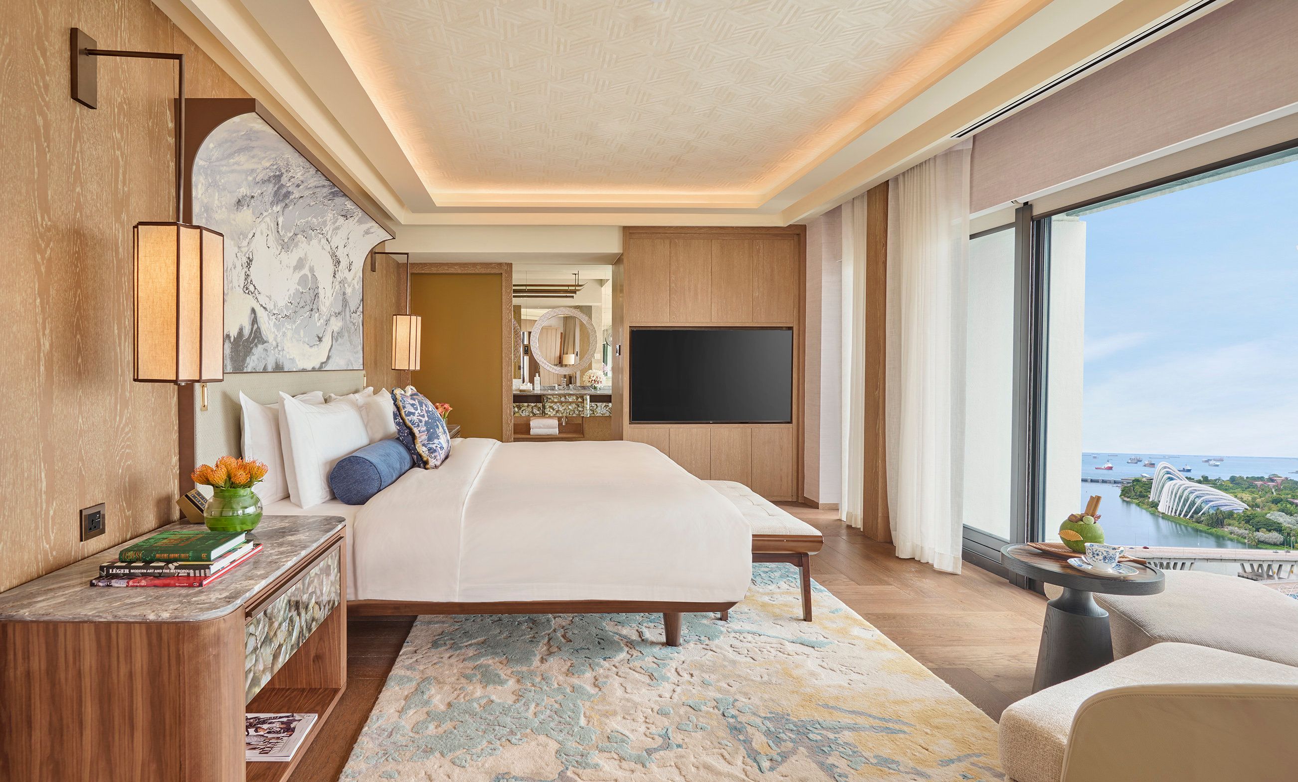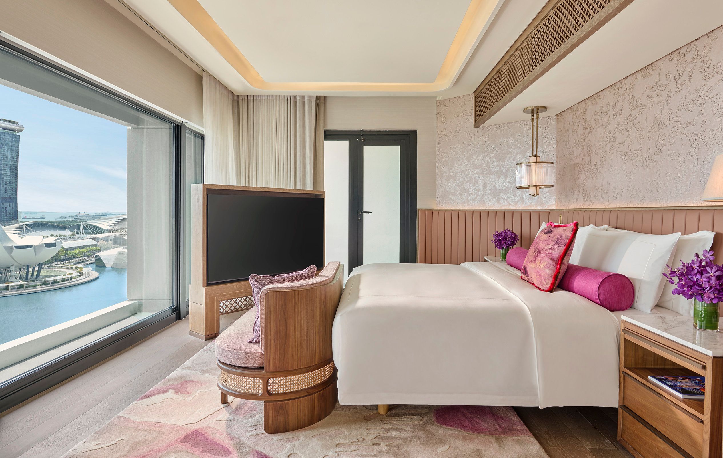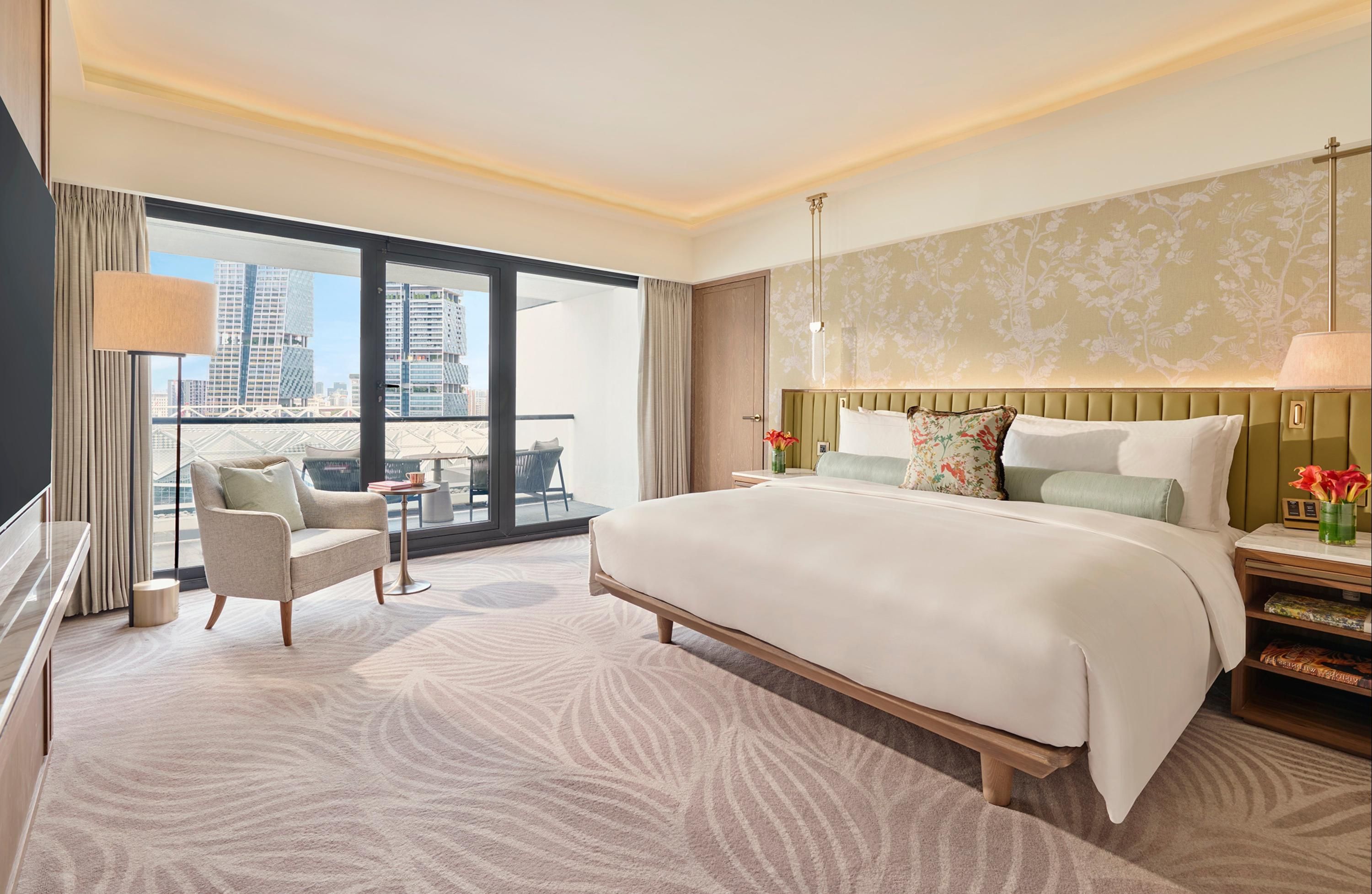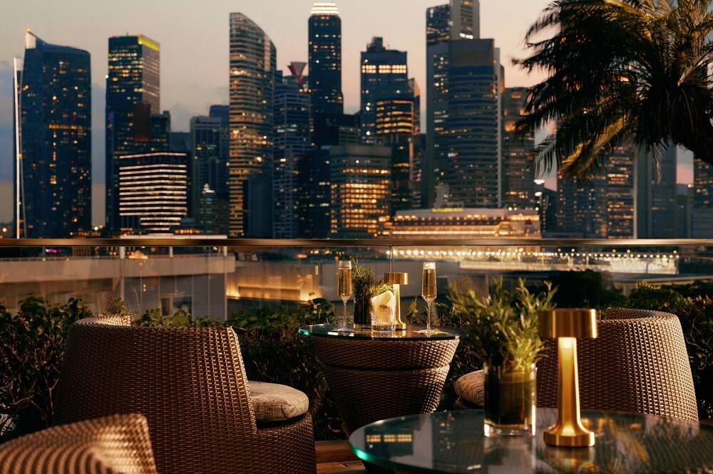 Towering over Marina Bay, Mandarin Oriental, Singapore, features an outdoor pool with stunning cityscape views and a luxurious spa. Guests can keep fit at the gym or with Yoga classes.