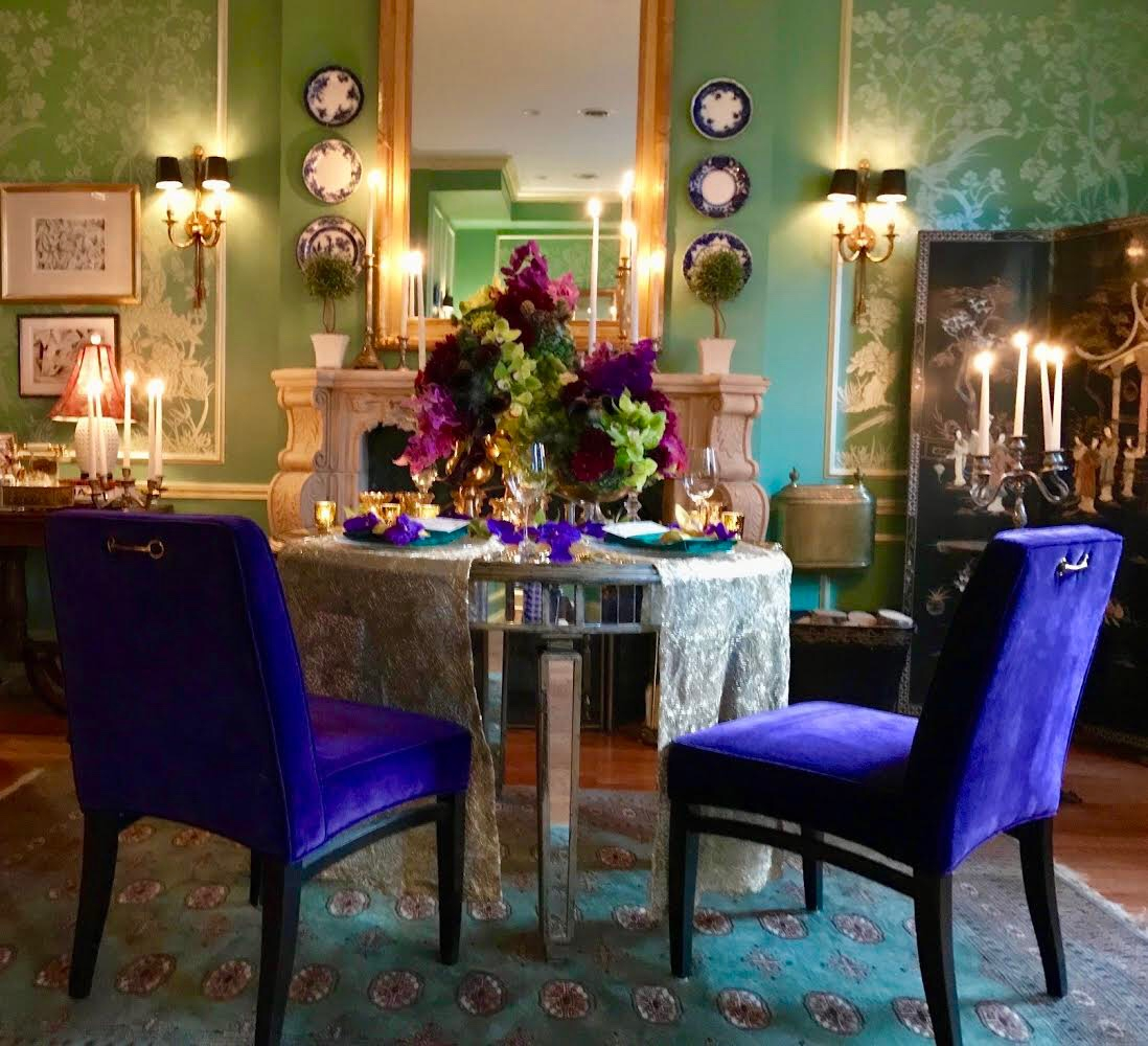 Named after noted French epicure, Jean Anthelme Brillat-Savarin, this intimate enclave offers a dramatic view of the beautiful Marchesa show kitchen. Complete with seating for as many as 12 and as few as 4, the Savarin Room boasts a chinoiserie cabinet filled with exotic elixirs, a malachite ceiling and gorgeous brass chandeliers. Luxuriously upholstered seats ring a table set with vintage table linens and marble chargers. Guests can select from a variety of heirloom table accouterments like crystal knife holders and individual salt cellars. A 49” television, hidden behind an oil painting, can be used for a variety of viewing purposes, from a movie night with friends to catching the latest highlights of Chicago’s storied sports teams!
