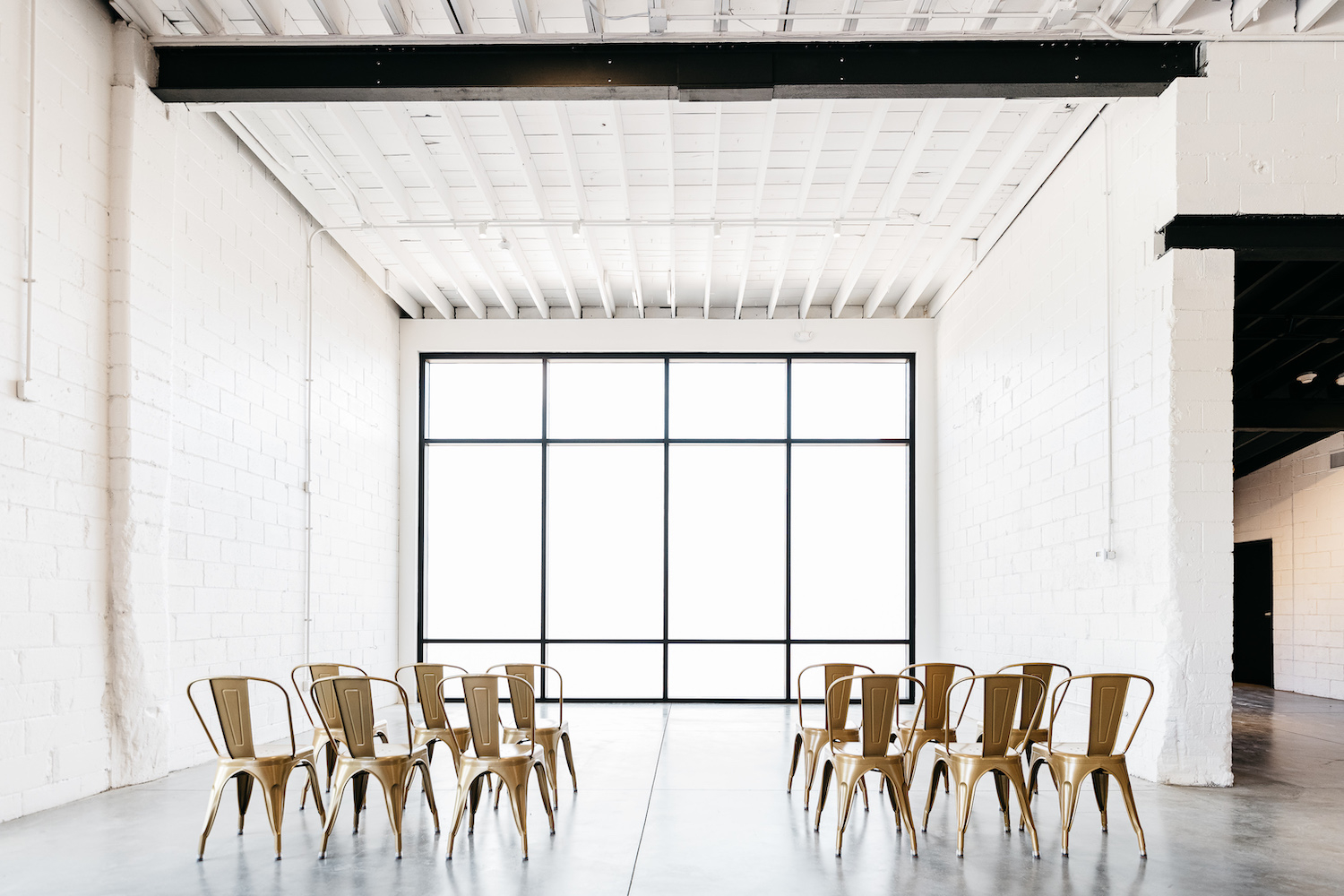 The open space includes exposed rafters, polished concrete floors, and extra large windows for natural light.
