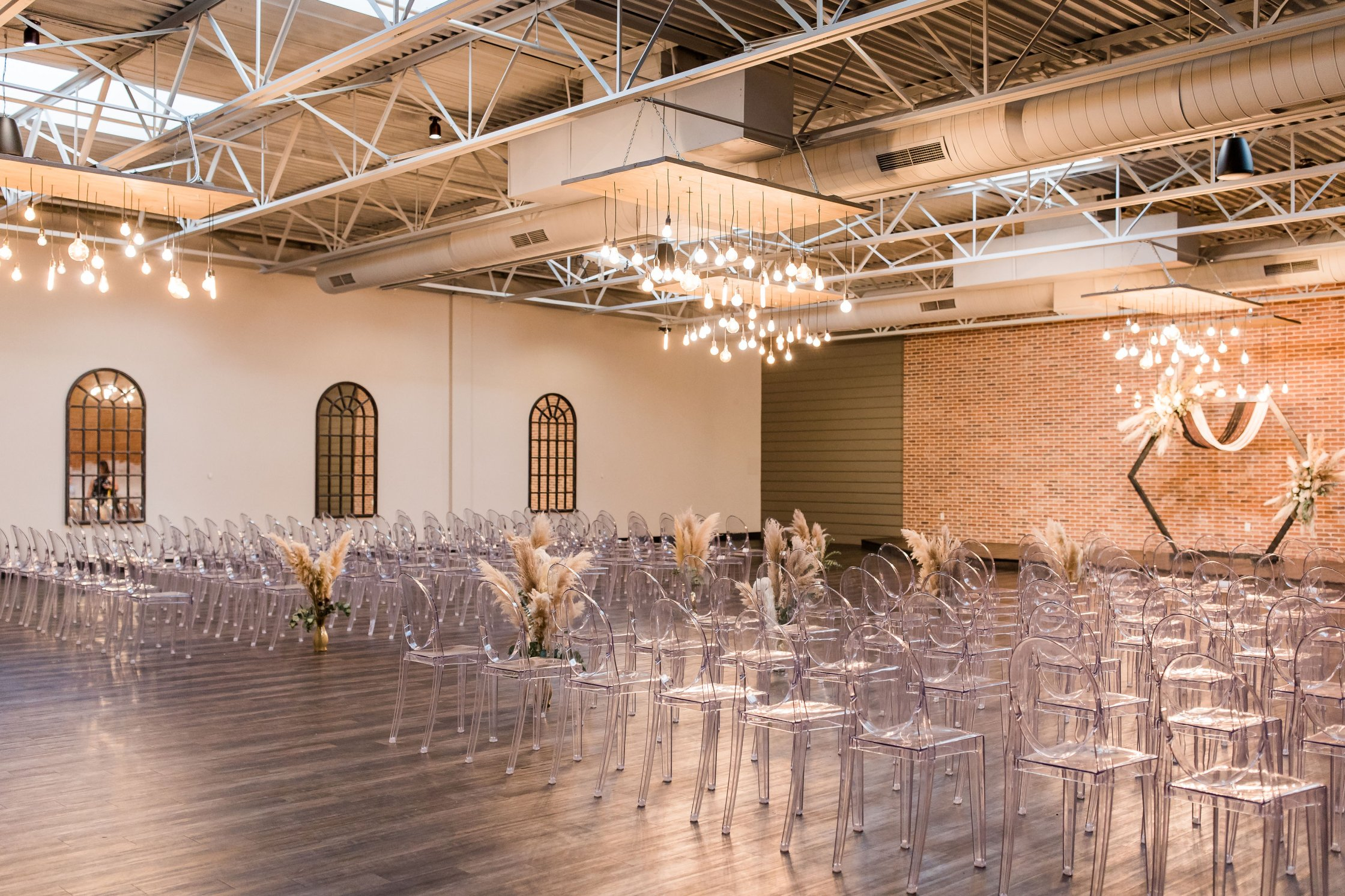 Our industrial-chic venue boasts a grand foyer, private suites, a gorgeous ceremony room, an expansive ballroom, and lounge space all under one roof! You'll fall in love with our exposed brick walls, Edison bulb Chandeliers, and unique furniture that showcase our speakeasy style. It's the perfect venue for the eclectic, industrial-chic couple.