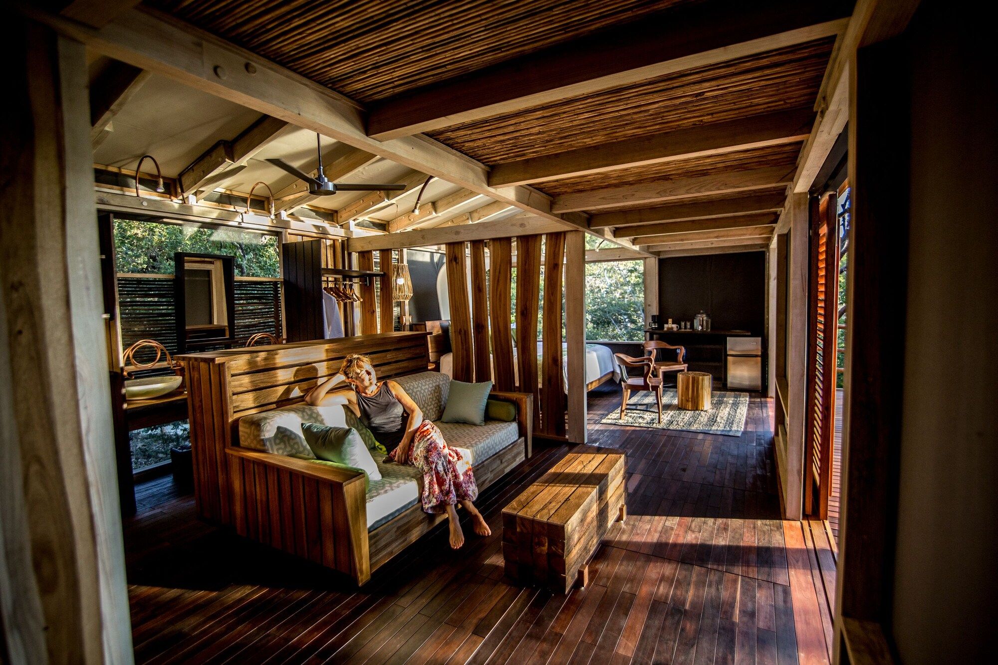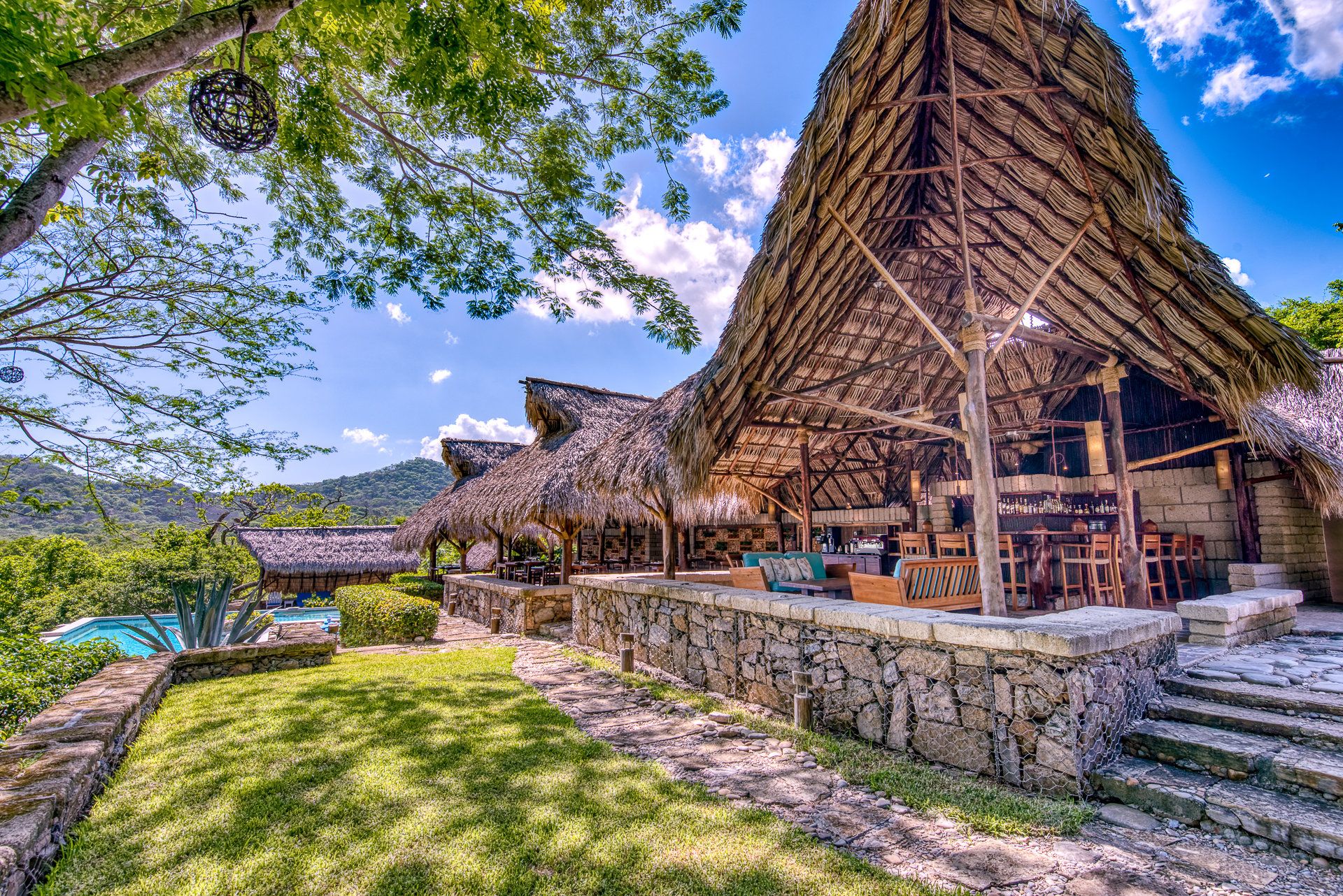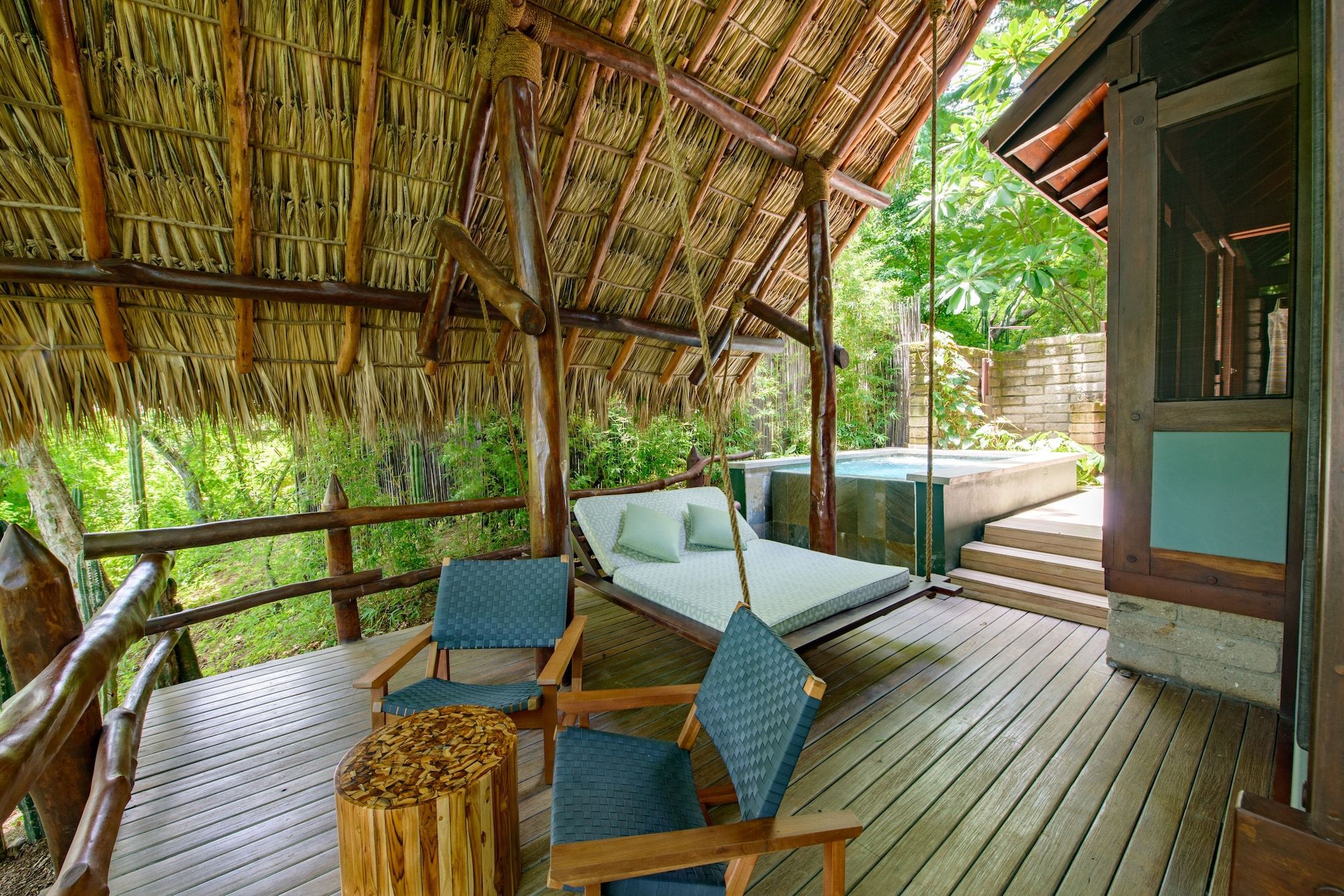 The bungalow is equipped with a fan, a private terrace that overlooks the mountainside and a private bathroom with shower. The bungalows have a rustic decoration with modern-style details, wooden furniture, floors and beamed ceilings, plus thatched roofs.