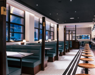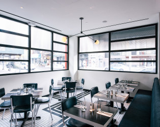The interior, designed by Dutch East Design, evokes streamline art deco with a contemporary flare and is set within a nearly century-old pagoda-style building. Inside, the decor is reminiscent of a 1920’s diner with a long bar counter and accents like spherical metal light fixtures, blue leather banquettes, and black geometrically patterned tables that will transport you to another era.