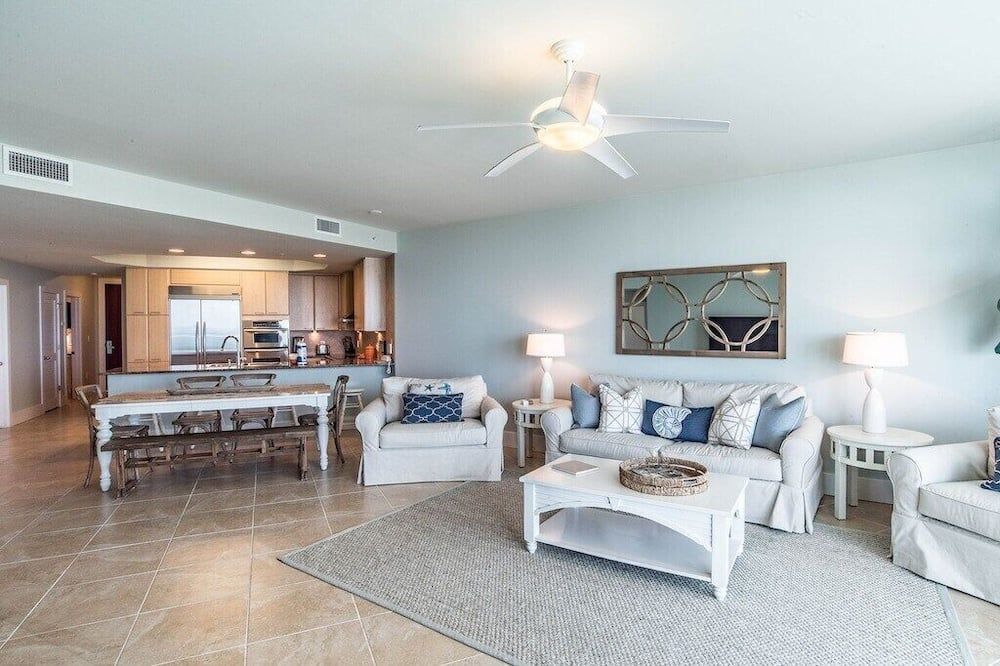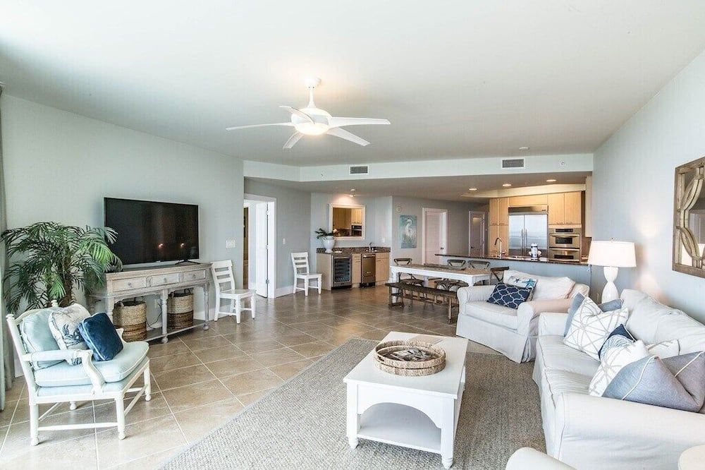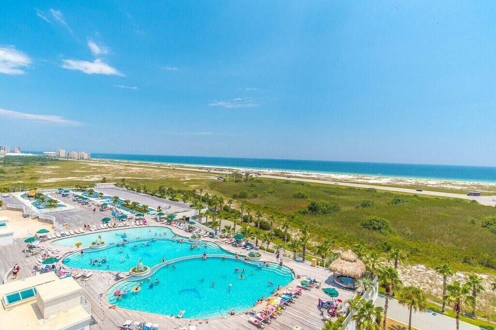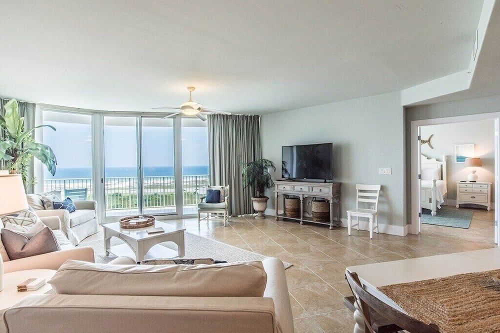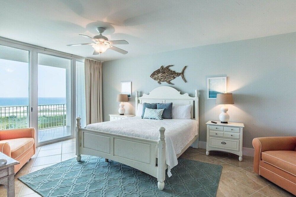 Set right by the sea, overlooking the Bayou Saint John and the Gulf of Mexico, this three-bedroom apartment is set on a stretch of Alabama's easternmost coast that's renowned for its pristine white sand beaches and family-friendly atmosphere.Step inside and take in the view through floor-to-ceiling windows that allow plenty of natural light to flood in throughout the day. A vast corner sofa occupies prime position by the windows, with balcony access a few steps away. Elsewhere, a six-seater dining table will ensure sociable mealtimes, while the kitchen comes with everything you could need to cater for yourself. If you aren't in the mood to cook, there's a restaurant on-site at the resort, plus a poolside deli for light bites at lunchtime. Each of the three bedrooms is inspired by the beautiful location, making use of natural jute carpets, blue and yellow colour schemes, plus sea life-inspired artwork hanging in the main en-suite – complete with a Jacuzzi bath.Whether you're looking to while away your days by the pool with a drink in hand, immerse yourself in nature along the backcountry trails, or keep a keen eye out for dolphins on a sunset cruise, Orange Beach has it all. Outside of the resort, The Wharf offers an enticing array of eateries, fifteen minutes away. Alternatively, Orange Beach Waterfront Park offers you a chance to throw in a fishing line and hope for the best just 5 miles down the road.