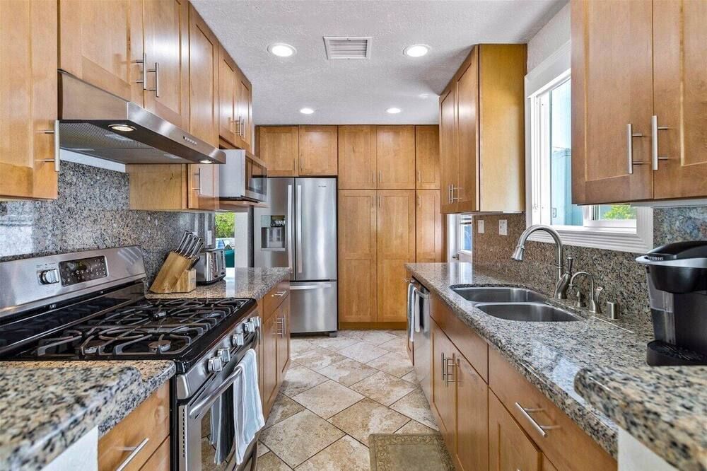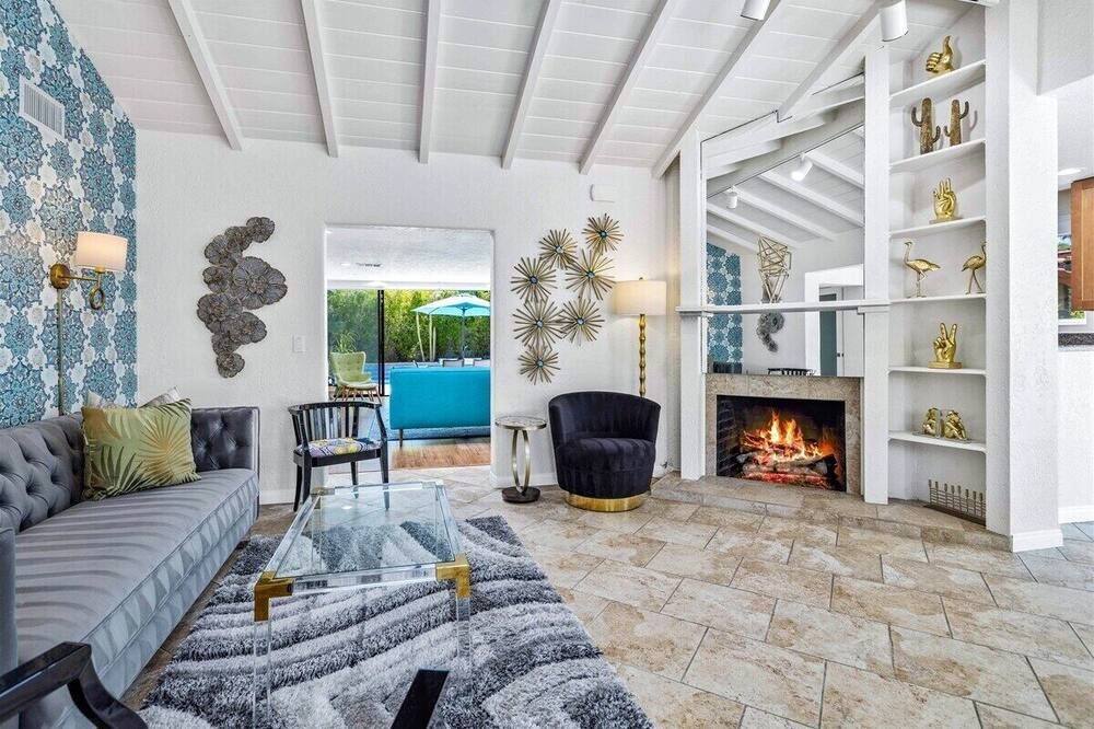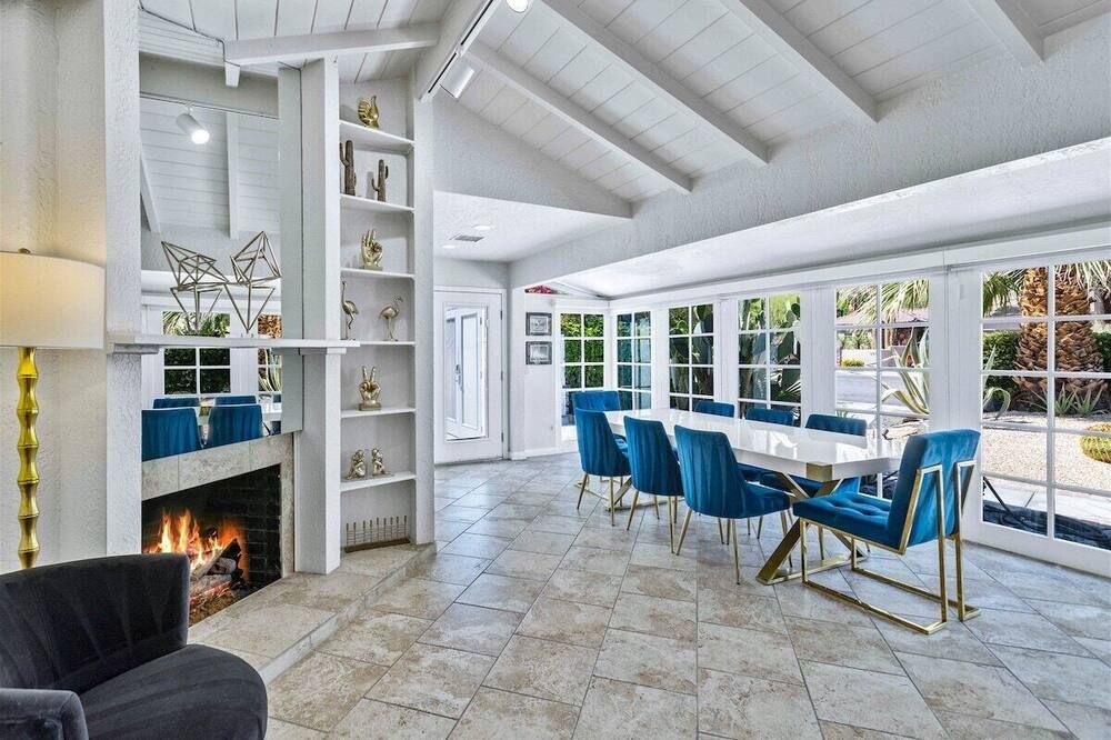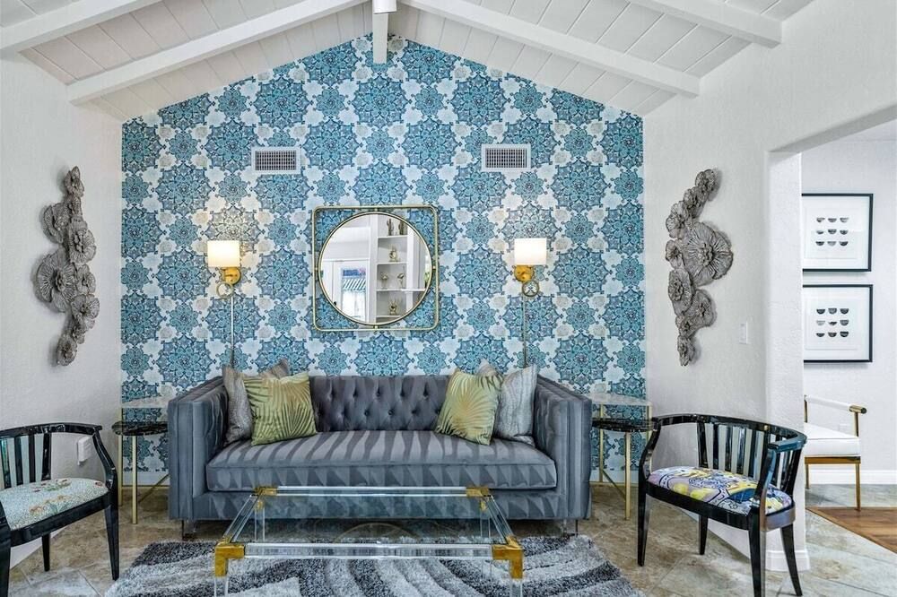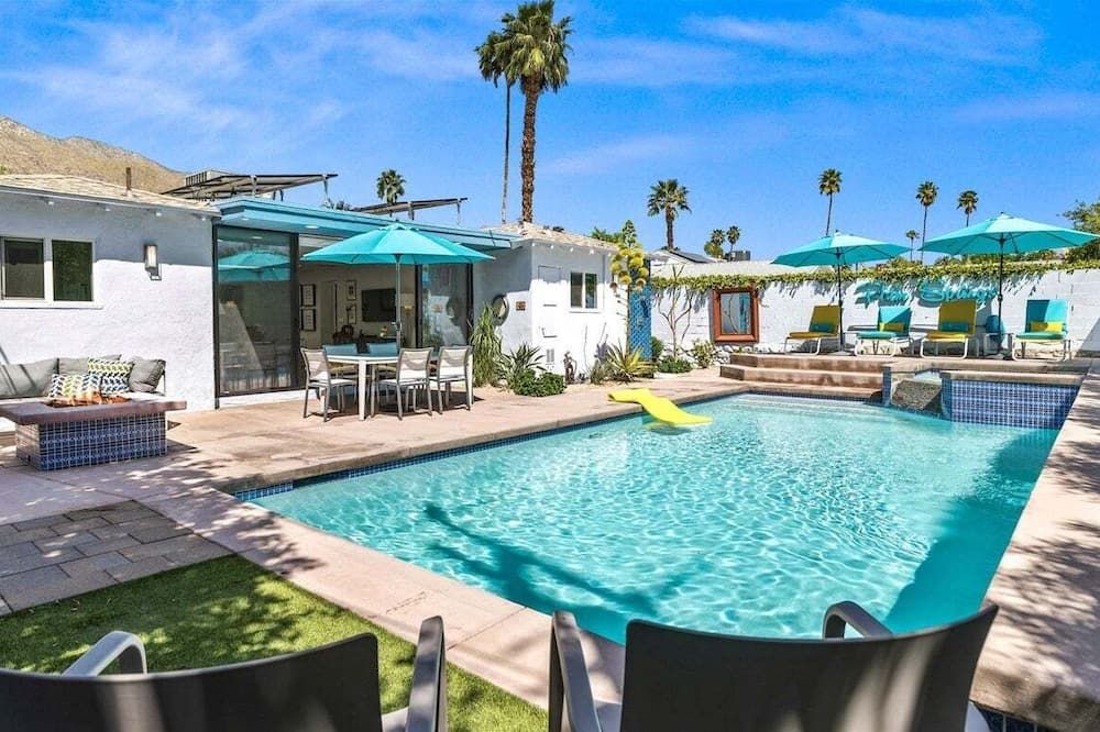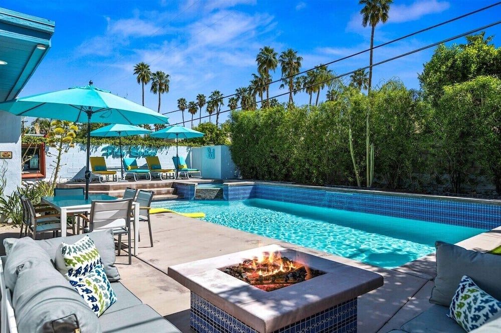 Daring, modern and unapologetically bold, the monochrome interior of this Palm Springs villa is worlds apart from the traditional Spanish-inspired building it sits within. Within its stucco walls and beneath the rustic wood ceilings, expansive rooms take nicely to lashings of black and white. Grey geometric floor tiles and funky objets d’art keep it interesting, especially in the bedrooms. The dining space features a huge sliding glass wall that gives way to the patio and lush garden. This is where we imagine you’ll be spending most of your time, soaking your cares away in the bubbling hot tub or lapping up the sunshine beside the water’s edge. After a refreshing dip in the pool, saunter the five minutes to Palm Springs thoroughfare for a classy, curated selection of bars, restaurants, vintage boutiques and the swanky Design District. When the sun starts to set, head home for an evening of drinks around the fire pit, relishing the cool desert breeze and mountaintop vistas from the comfort of your opulent outdoor setup.