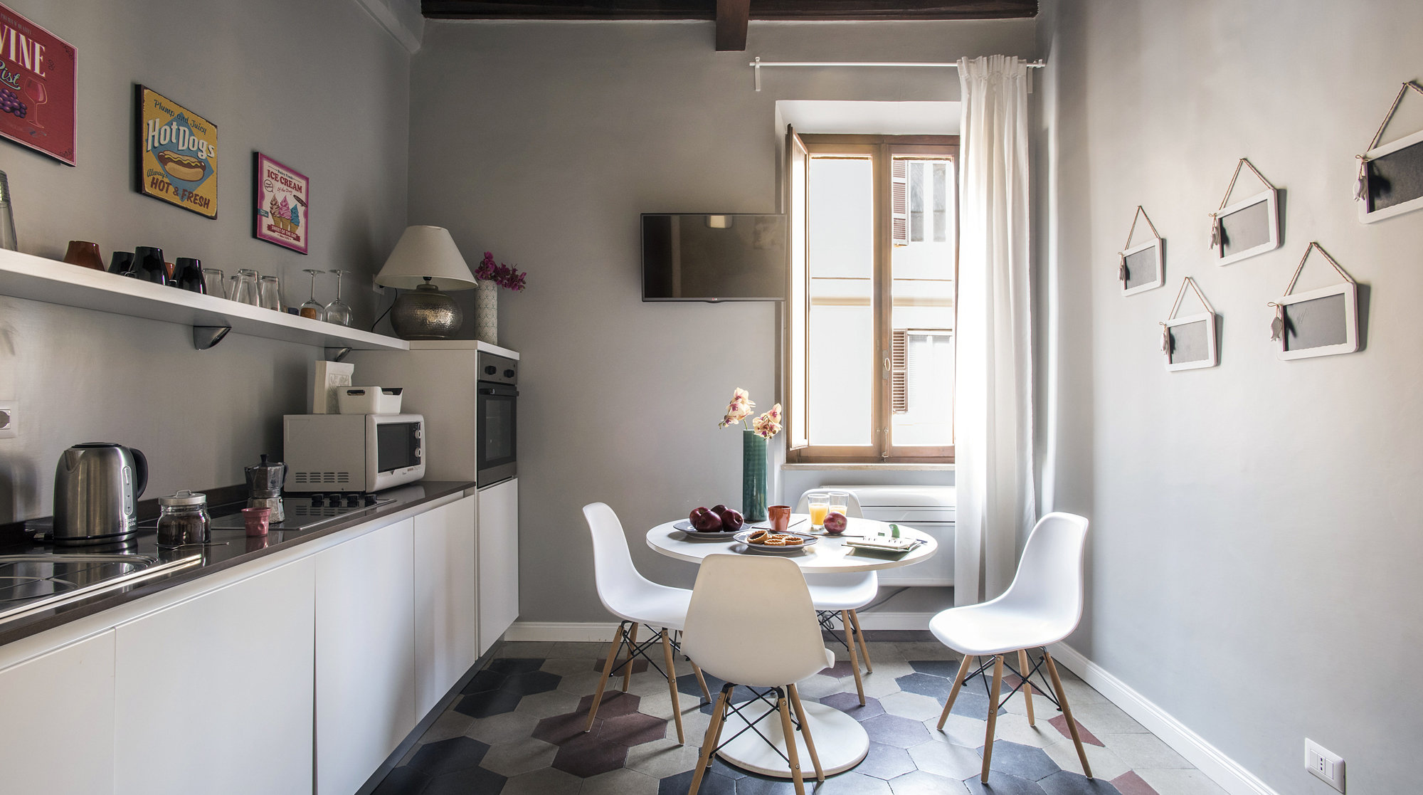 You can’t visit Rome without visiting the Vatican City – luckily this stylish abode is just a five-minute stroll to St. Peter's Square. It’s also only a ten-minute walk to the Vatican Museums, as well as Castel Sant'Angelo with its large roof terrace offering breathtaking views across the city. Right on this apartment’s street, there’s a range of restaurants, gelaterias and cafés to choose from – we think this is a wonderful location. After all that sightseeing, you’ll need somewhere super comfortable to return to. If you don’t fancy eating out for dinner, cook some pasta and enjoy at the dining table, next to the window with views across the neighbourhood. The bedrooms, with little touches like the distressed metal lights, and warm parquet floors, make for a charming retreat. So, when in Rome, if you want the perfect setting, combined with a comfortable home, look no further.