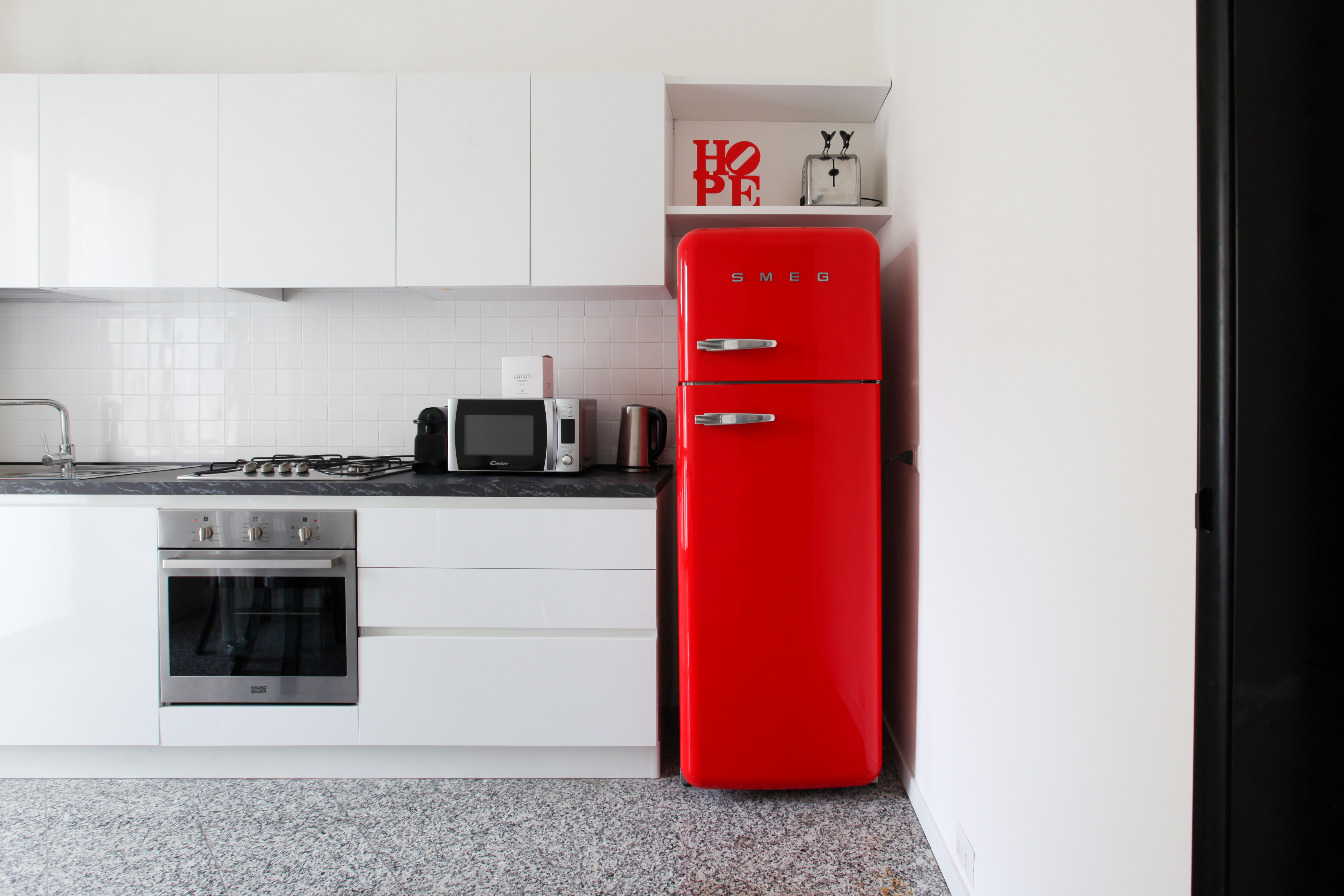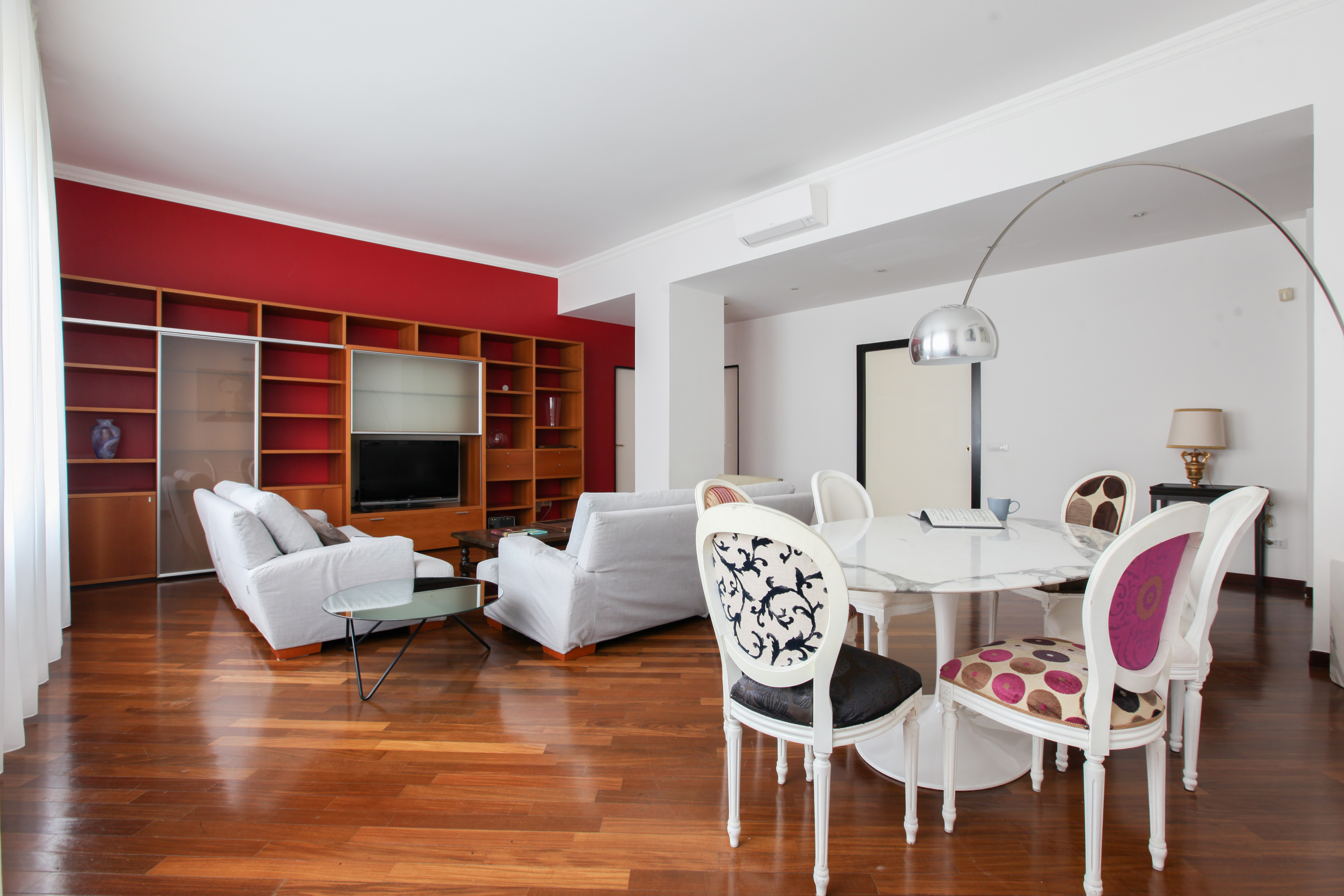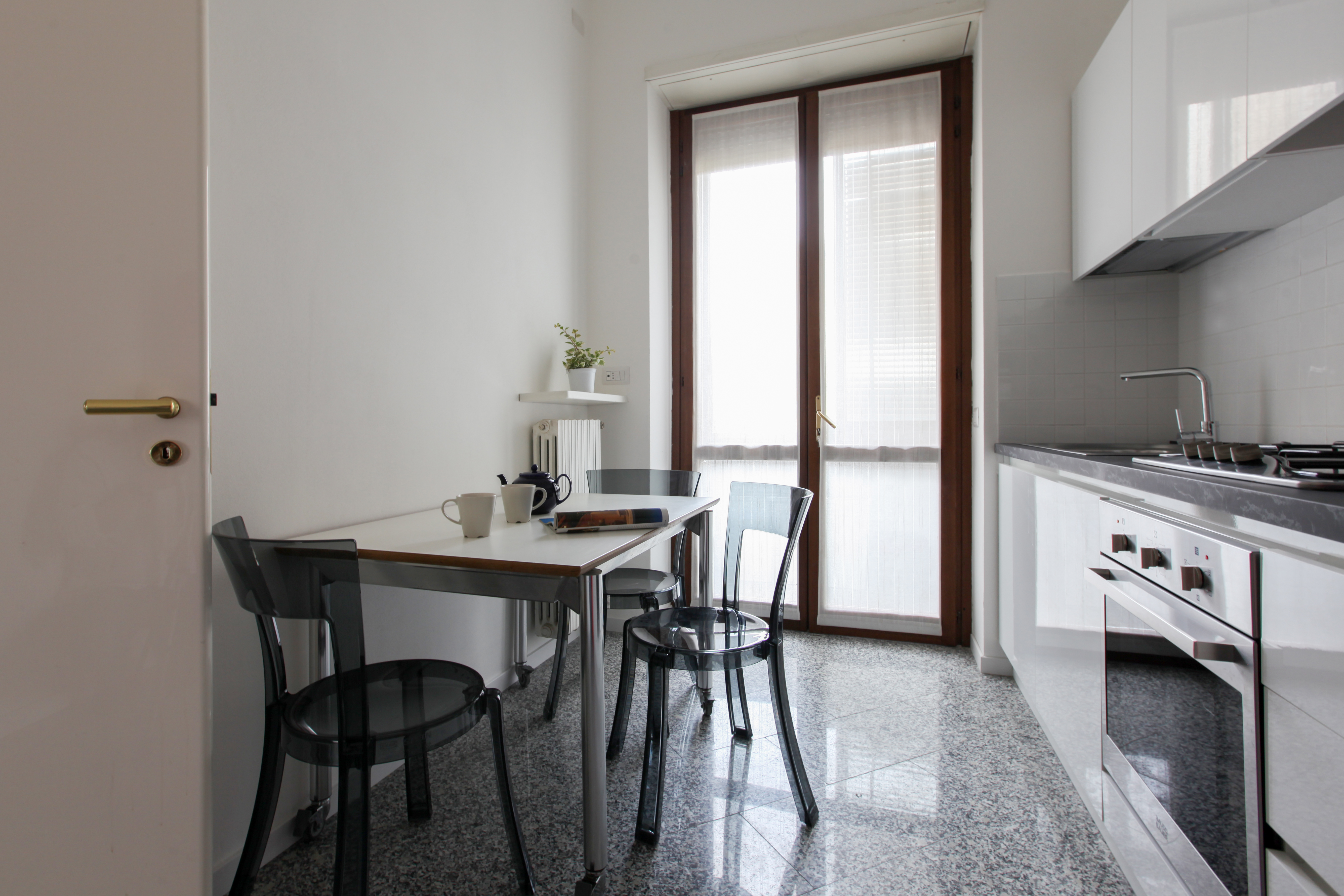 All but a five-minute walk to the Corso Venezia – part of the city's upscale Quadrilatero della moda shopping district – this enviable apartment sits right at the heart of the fashion hubbub. Locally, the surrounding area is lovely, benefitting from calm squares, grand architectural statements, and the historic centre is easy to get to on foot – the Duomo di Milano is a twenty-minute stroll away. Back home, you'll find a bright and roomy living space with light neutral tones, soft thoughtful furnishings, chic replica prints and a stylish Castiglioni lamp. The kitchen is colourful and uplifting, with pops of red, plenty of sunlight coming in through the window and a charming dining spot to enjoy breakfast while planning out the day's trips. The bedrooms have their own personalities, with a children's bunk-bed room that will quickly put the kids at ease.