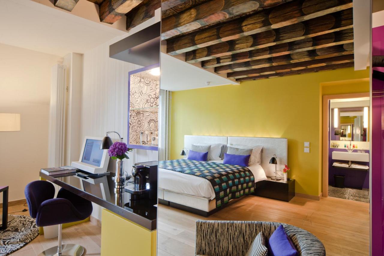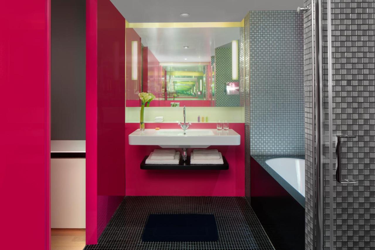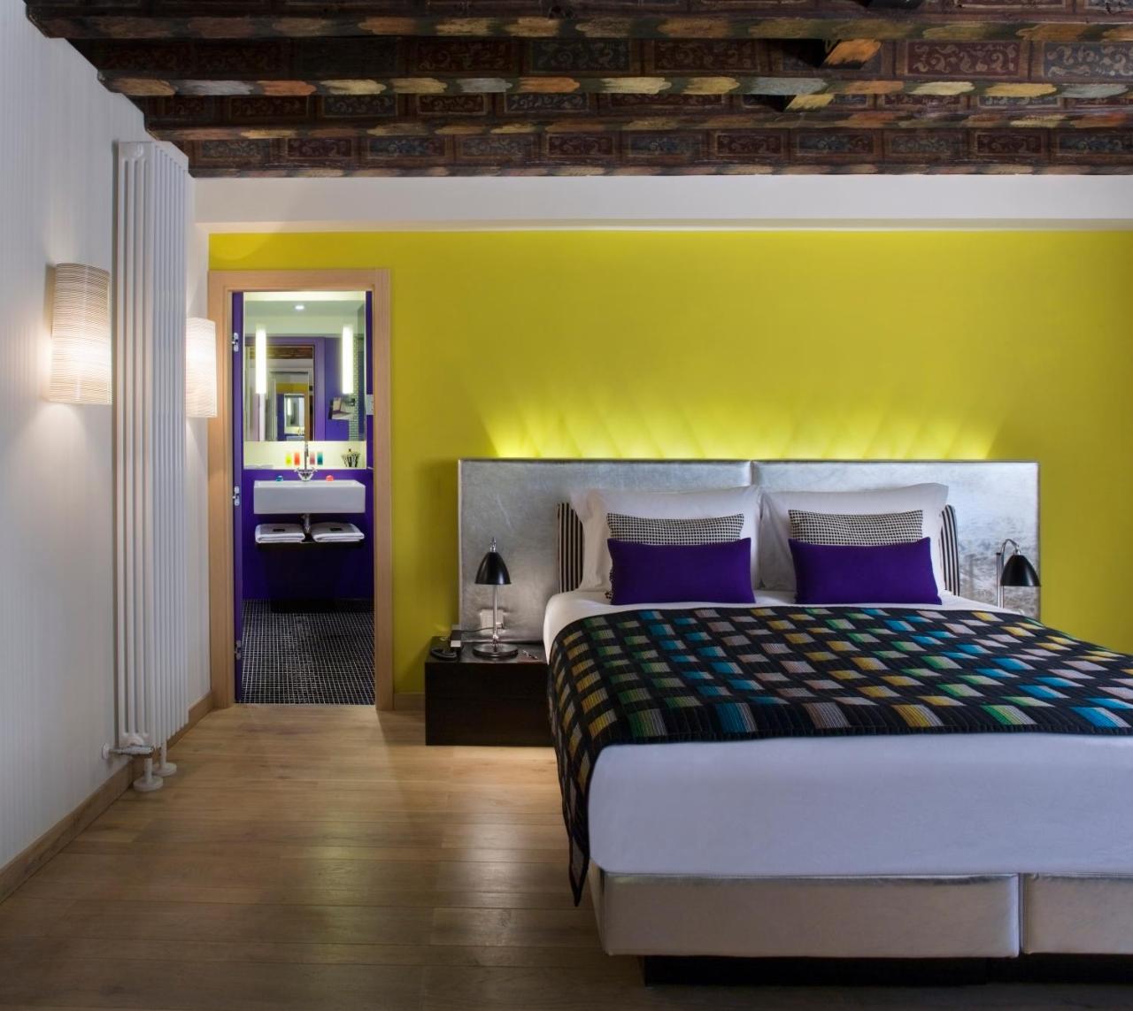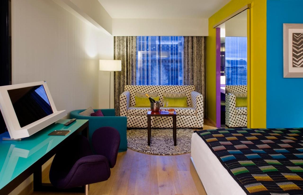 The hotel's bedrooms and suites balance style with comfort. Amenities include Nespresso machines, LCD TVs and free high-speed internet. The designer interiors throughout the hotel are stylish and colorful. Each room has an private bathroom.