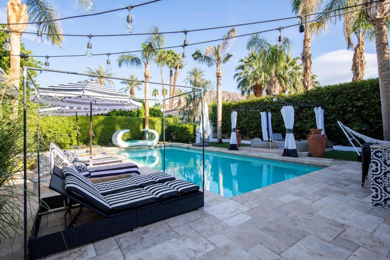 Nestled at the base of 1,952ft Eisenhower Mountain in the lush city of Indian Wells, find yourself surrounded by Beverly Hills-style mansions and breathtaking scenery.This ranch-style home makes for a splendid family hideaway with sociable open-plan spaces decorated in a minimal palette of black and white, with gold accents and plenty of desert plant-life surrounding you.Opulent super king-size beds occupy the two larger bedrooms, with the main room enjoying direct access to the poolside patio and an en-suite shower room with double sinks.Step outside and appreciate the jaw-dropping mountain views from the backyard before sitting down to breakfast at the long dining table. As the day heats up, spend time relaxing poolside listening to podcasts or swinging gently in the hammock with a good book. As day turns to night, a Jacuzzi and fire pit are on hand so you can continue to share stories beneath the stars.You're perfectly placed to enjoy everything this stunning desert location has to offer. From the arts on display at Coachella, fifteen minutes away, to the art deco architecture of Palm Springs, 16 miles up the road, and world renowned tennis and golf tournaments right on your doorstep – this home has it all.