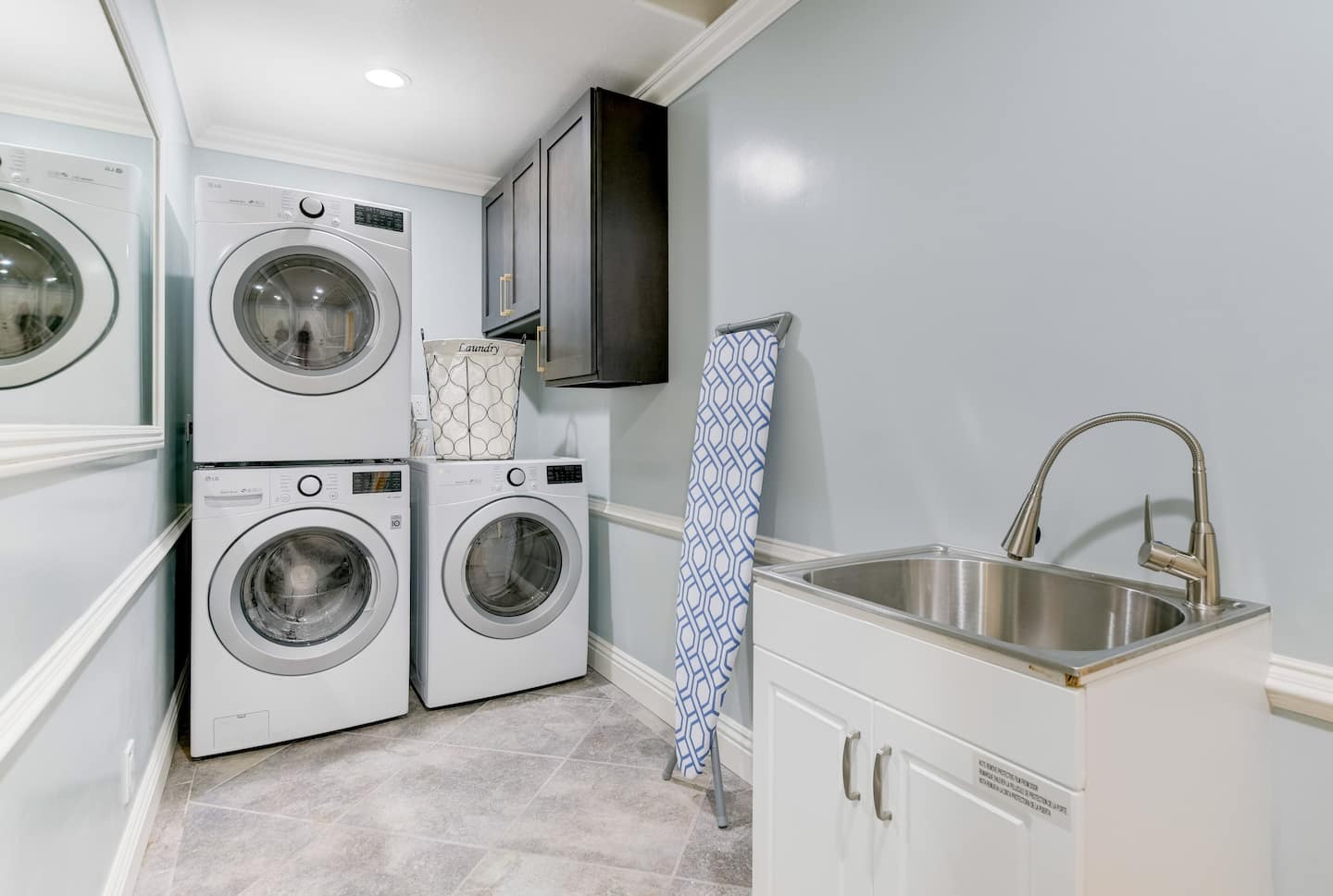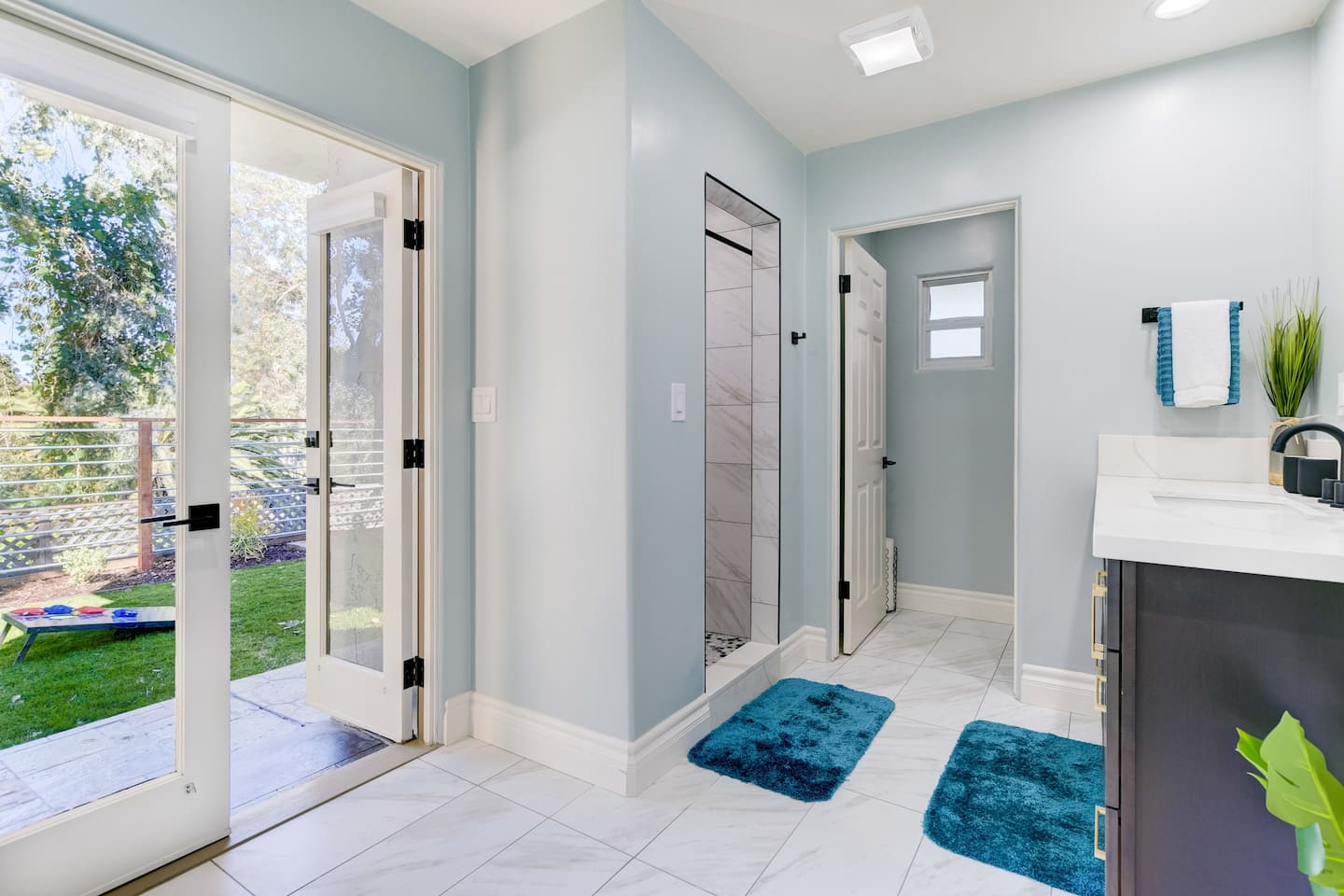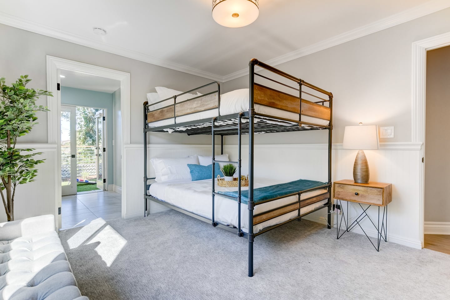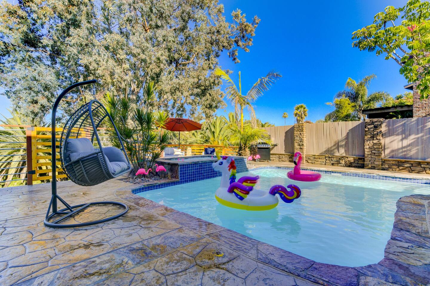 It’s always sunny in California and this is the perfect home for catching those rays. Make a beeline to the back garden, where you’ll find a pool surrounded by swaying palm trees and an attached jacuzzi. Watch the children splash about in the water from the comfort of a swing seat and take in the canyon views; they will love this tropical space with turf for outdoor games and a terrace for barbecues. The interior is sleek and glamorous, making use of metallic tones and pops of vibrant colour. The open-plan kitchen, dining room and living space are spread across the ground floor – perfect for bringing the family together. The kitchen has been kitted out with brand-new appliances and has plenty of silverware to serve up a meal for twelve. Parents will be glad to know that there’s a wet bar downstairs as well as a laundry room. Why not reward yourself with a cocktail while you put the washing on?