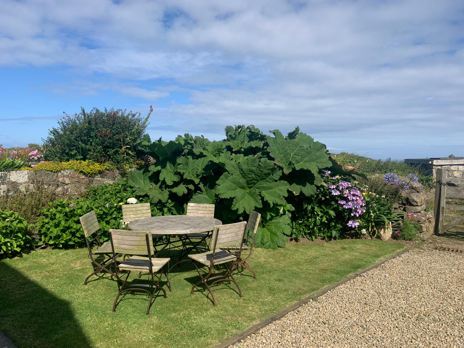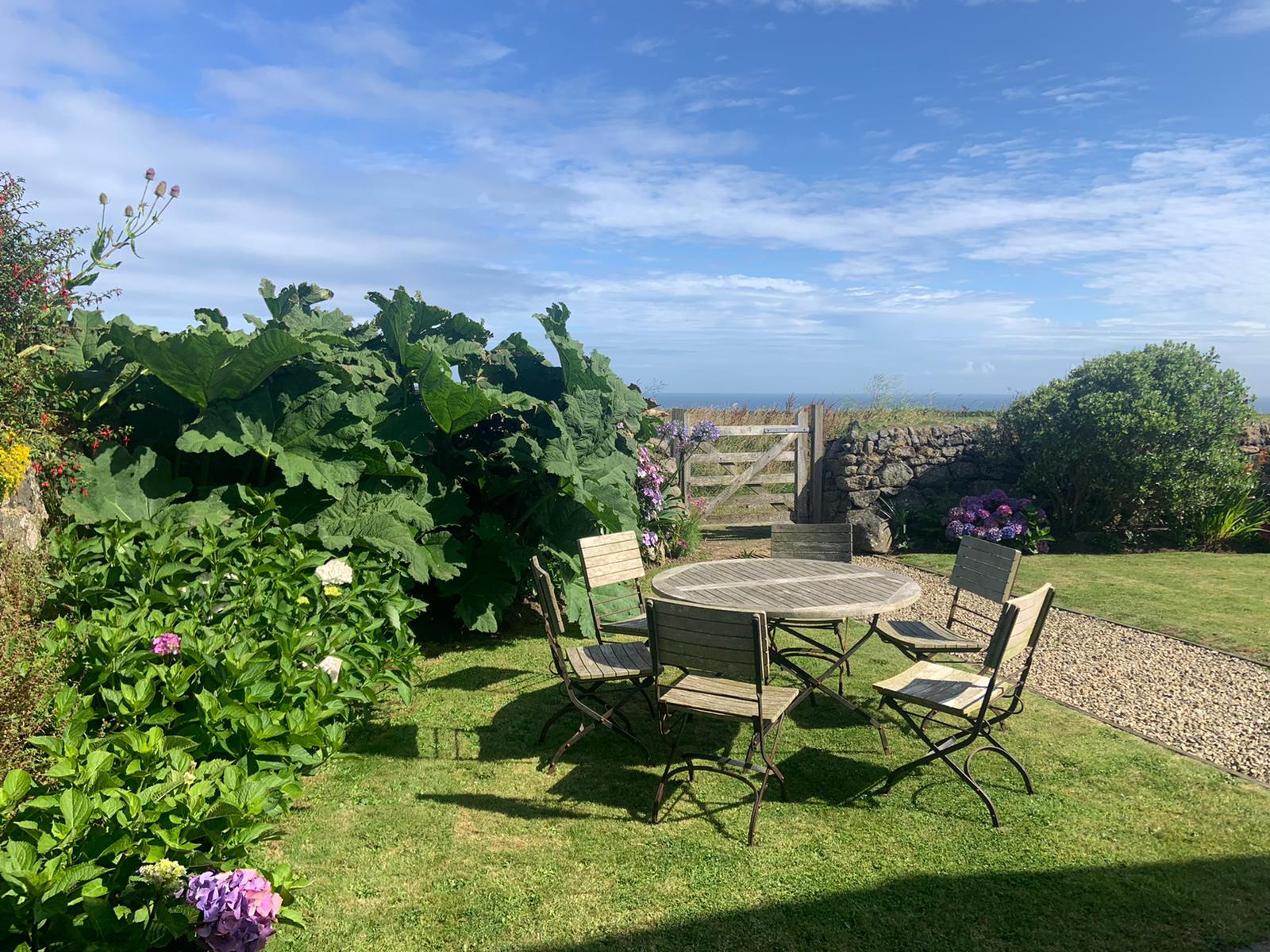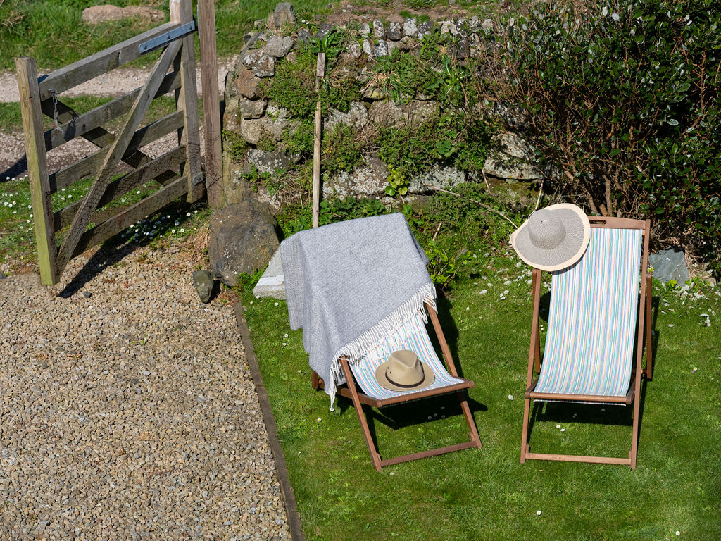 Then there’s the outside; a fabulous green garden brimming with flowers and a perfectly manicured lawn. On a hilltop location, you can see the sea from the outdoor dining table and there are a couple of deckchairs for sunny summer days.