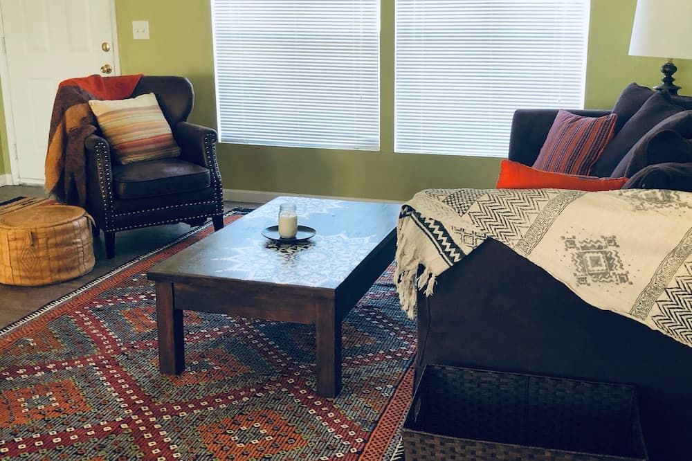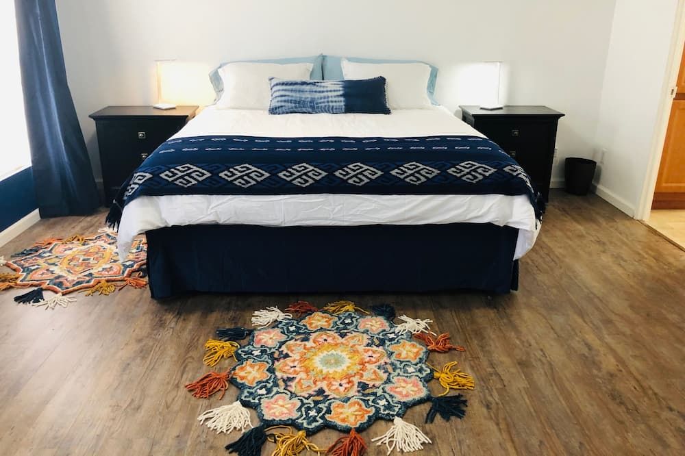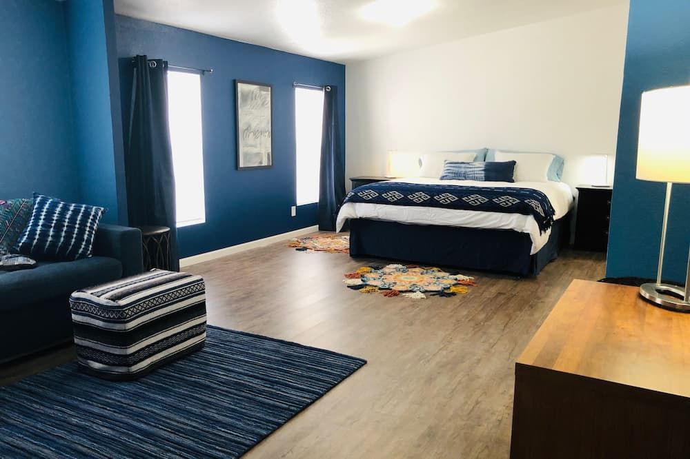 Five minutes from Joshua Tree Village, this modern home is surrounded by peaceful desert. Sunlight streams through floor-to-ceiling windows in the living room, and sliding glass doors open for a seamless transition from inside to out. Choose to heat up in the hot tub, or cool off in the cowboy-style steel tub. A propane grill and outdoor fire provide everything you need for a feast under the night sky. Inside, the chef's kitchen is equipped with all mod cons. Two king bedrooms in the main house embrace minimalist chic. An additional third bedroom with its own bathroom, living room, and kitchen can be found separately, casita-style.