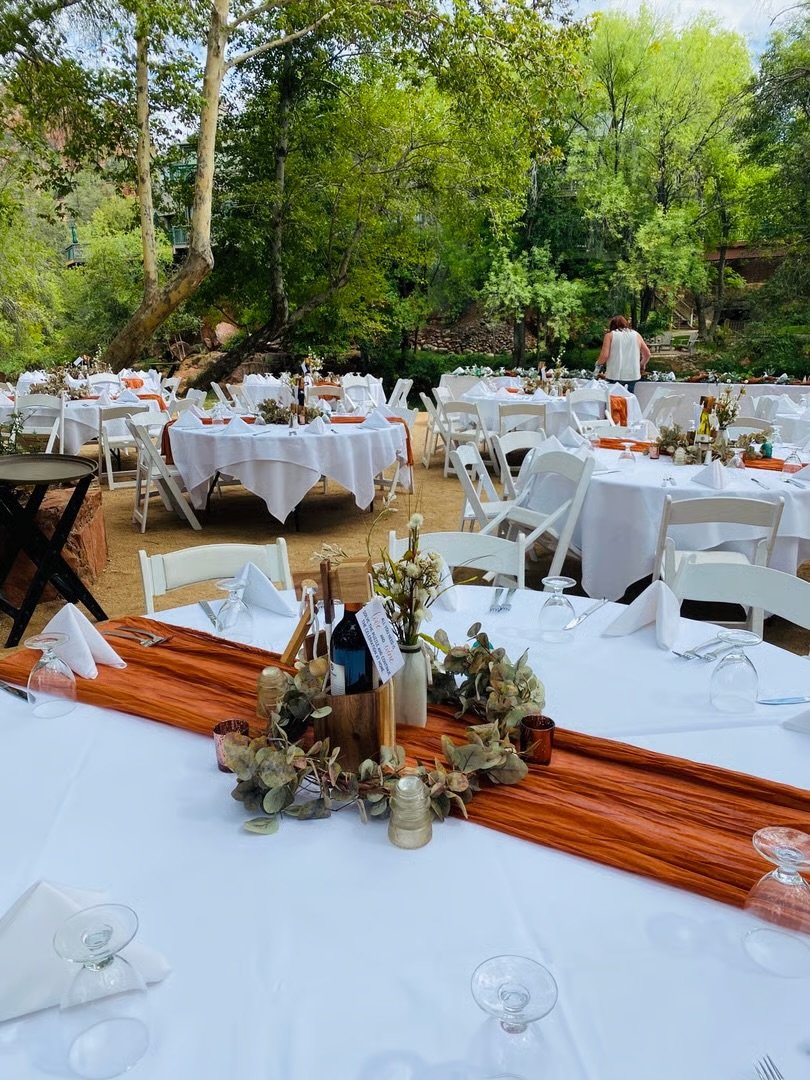 A ceremony by the creek with a lush garden backdrop. Cocktail hour on the lawn with passed hors d’oeuvres. Sunset photos by the charming bridge. A reception glowing under market lights. Our original Old School Prime Rib recipe, slow-roasted to perfection. Dancing under a canopy of stars. All in the heart of Sedona, inside a renowned resort embraced by breathtaking Red Rocks.
