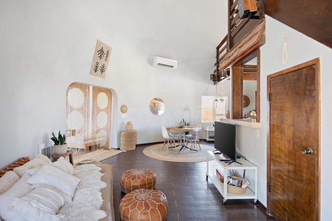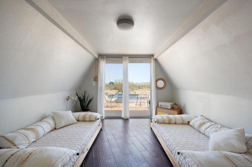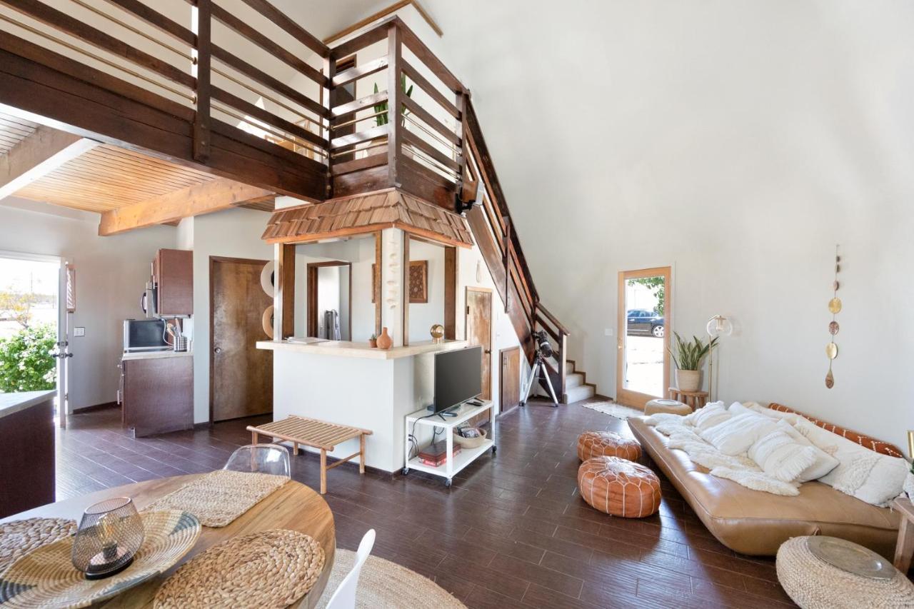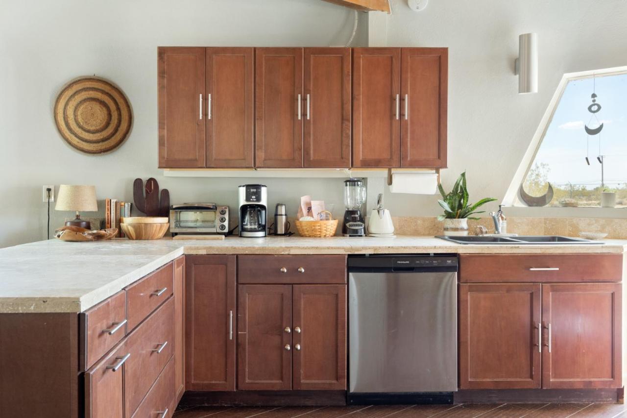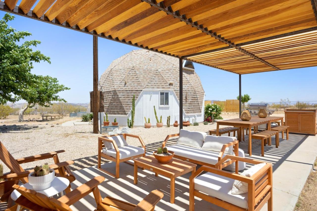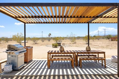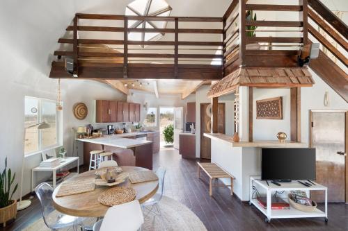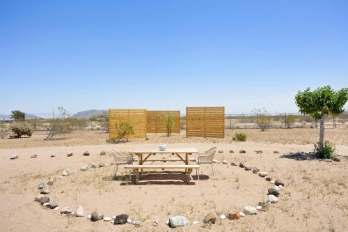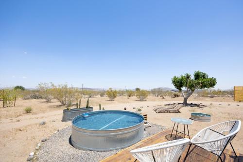 This magical home sits on 2.5 acres of beautiful Mojave landscape, and is a vision straight out of our wildest dreams. Design buffs will appreciate the architecture of the striking geodesic dome, and the bohemian vibe created with Moroccan-inspired pouffes and sheepskin rugs provides the perfect laidback holiday atmosphere. Mix a drink at the bar, play a game of horse-shoes, fire up the grill or swing in the hammock, scanning the skies for shooting stars. Unwind in the cowboy tub, still warm from the hot desert sun. Inside, play your favourite tunes on the record player, and peruse the curated library for holiday reads. Whip up fresh eggs, delivered straight to your door, in the small but stylish kitchen. The complimentary fresh Canyon coffee is the perfect accompaniment. You can elevate your stay into a wellness retreat - private yoga and spa treatments can be arranged from the comfort, beauty, and privacy of the home. Located just five minutes from the historical landmark, Integratron (sound bath anyone?), you'll also be a 20-minute drive from the nightlife of Pioneertown or the enchanting expanse of Joshua Tree National Park.