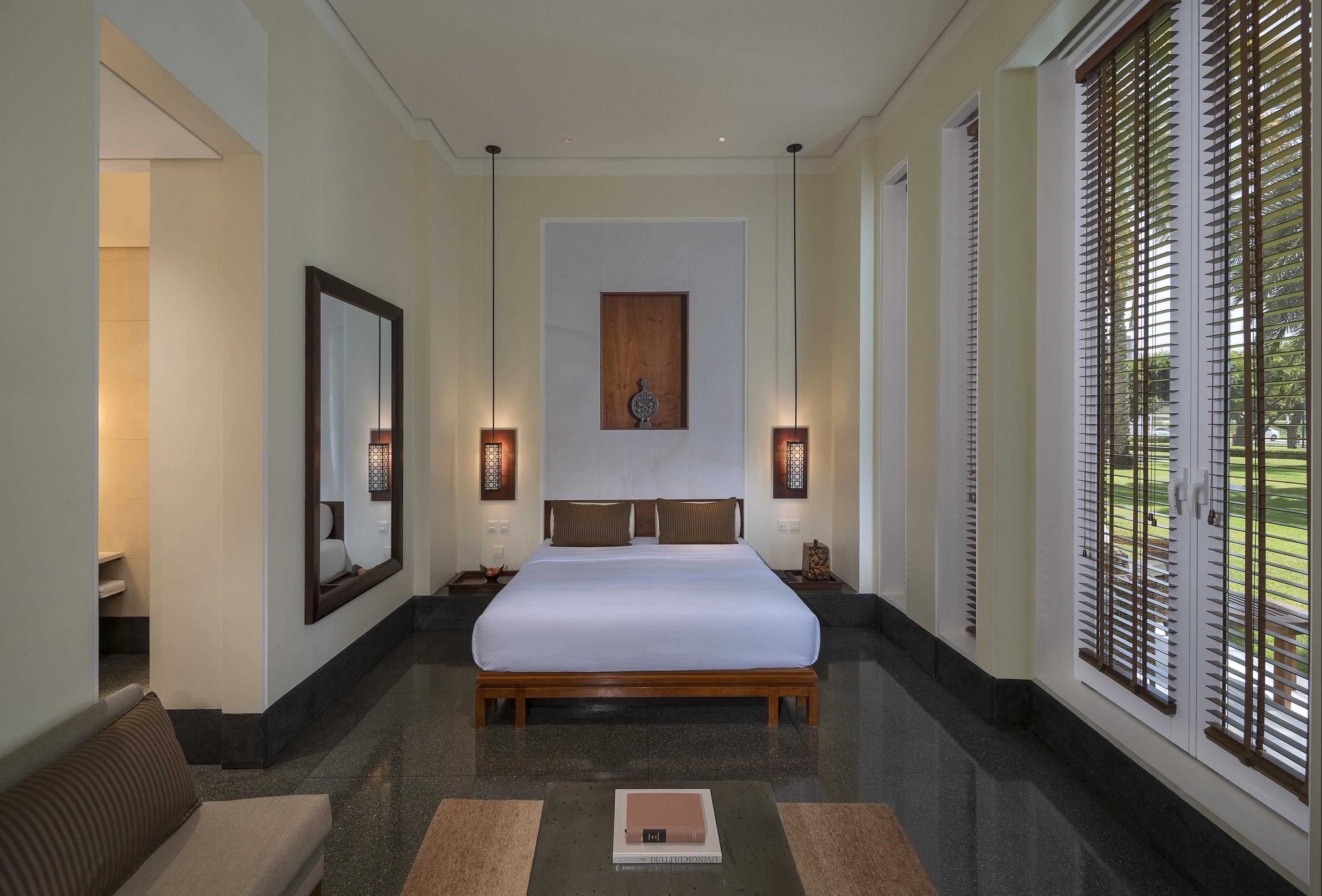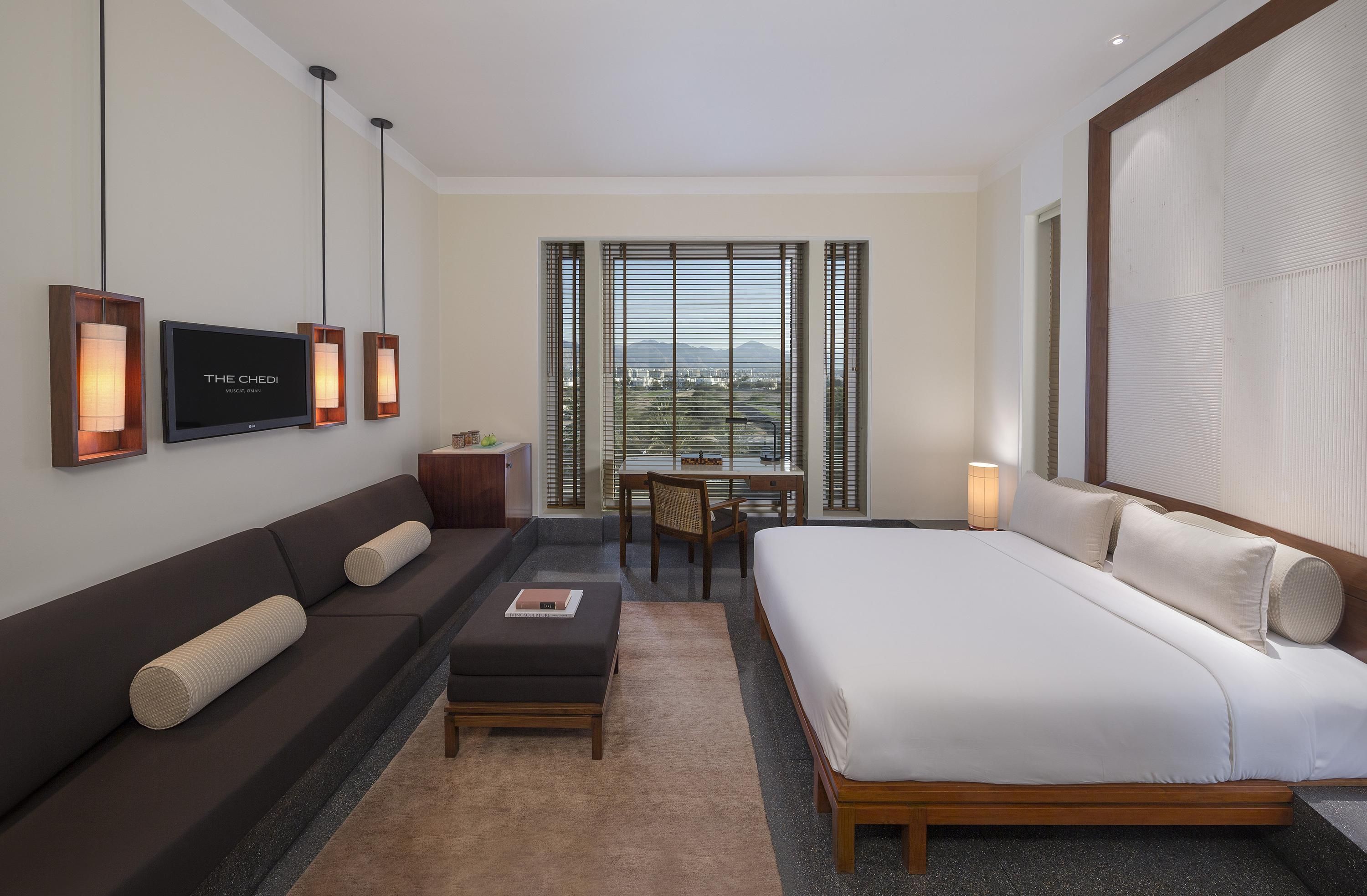 The air-conditioned rooms at The Chedi Muscat have a flat-screen TV, a private espresso machine and a spacious work desk. Some rooms have a seating area.