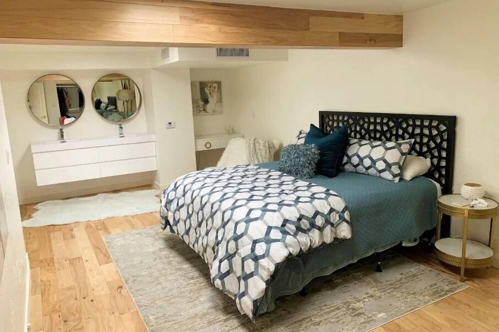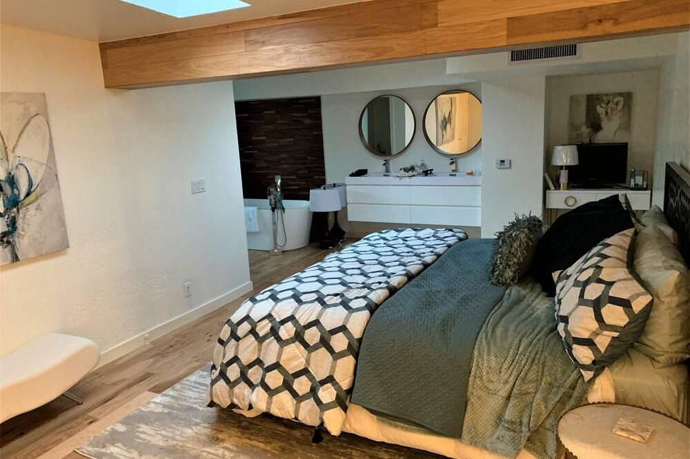 Set in the exclusive resort city of Indian Wells, here you'll be surrounded by tennis courts, golf courses, spas, and country clubs. With its mid-century aesthetic and high-end amenities, it’s the kind of place you imagine featuring in an early season of Mad Men. There’s even a cocktail cart, so you can practise making Manhattans. Nothing here feels out of place – everything from the art to the bedding feels meticulously chosen for this specific space. Outside, you'll have a private courtyard to sit out in, and shared grounds to explore. There's a communal pool, volleyball court and grass spaces for games of Bocce ball. And if you do want to get out and explore, Palm Springs is a short drive away, while there are all sorts of hiking opportunities in the San Jacinto Mountains behind the home.