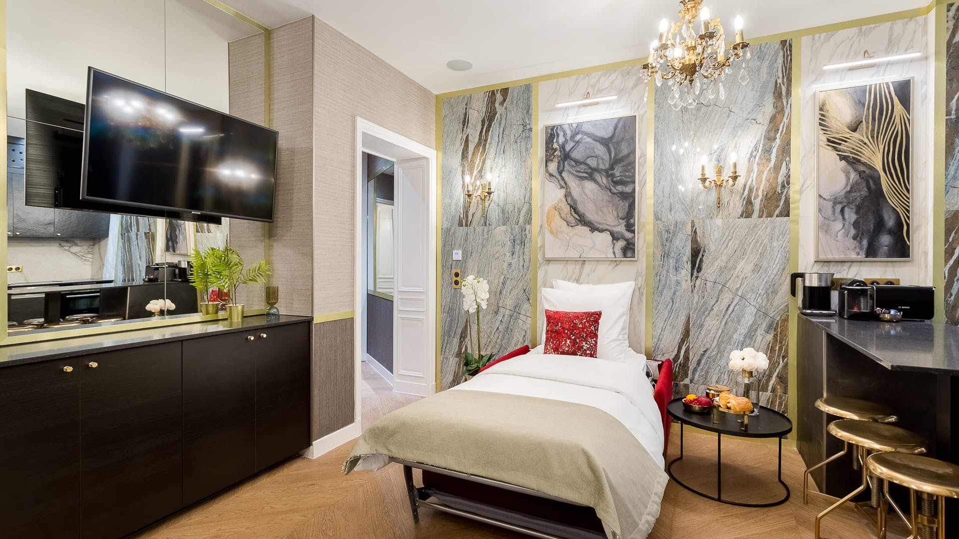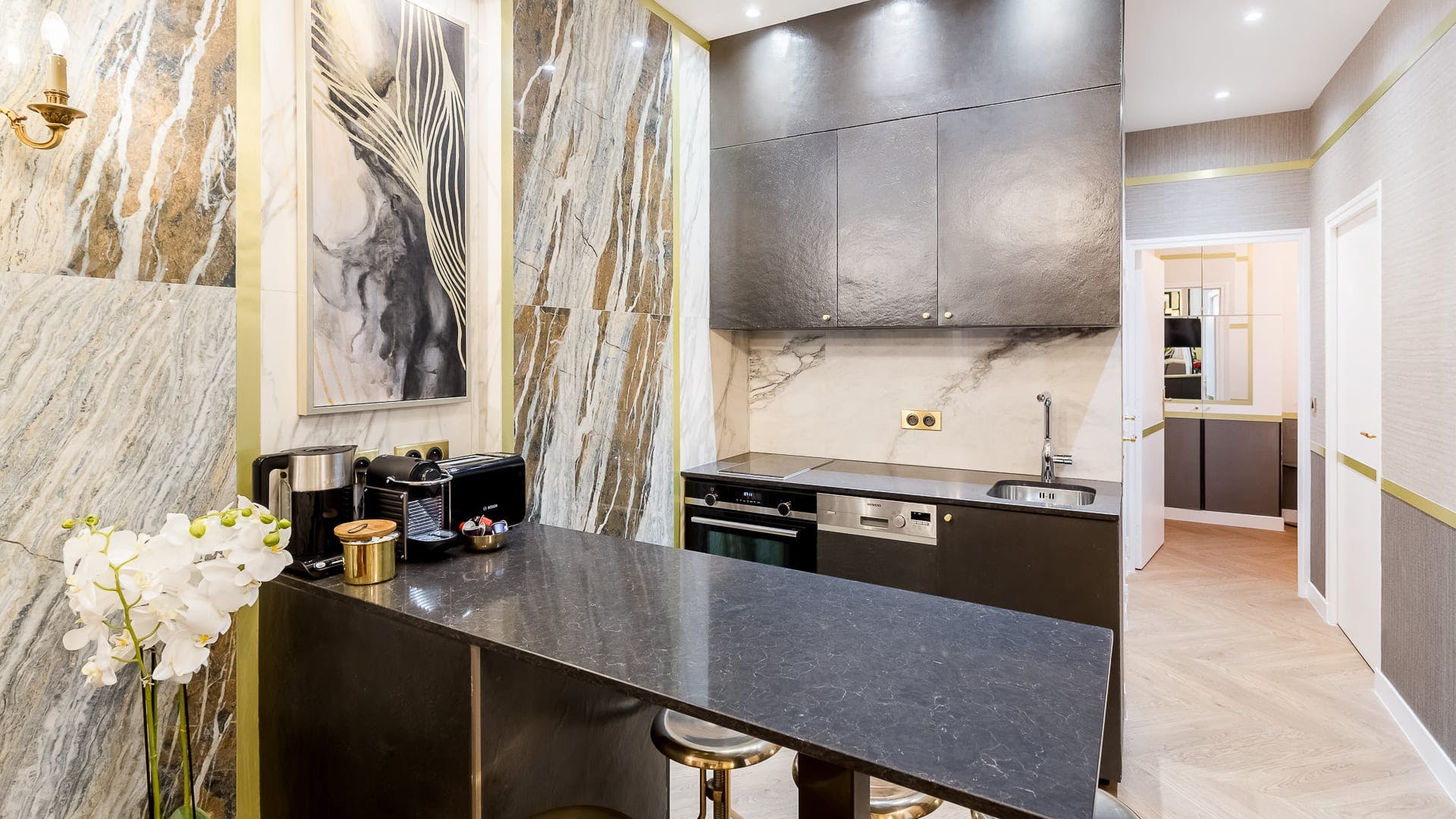 Sitting in a quiet neighbourhood in the fifteenth district, this apartment combines old-world Parisian glamour with contemporary luxury to create an unforgettable stay. Located in a traditional Haussmann building dating back to 1900, it’s the perfect setting to experience the city's iconic charm. And whether you’re preparing drinks in the kitchen, reading by the window or gathering around the table, every detail of this home enriches the moment with ease and comfort.Outside, wander along the tree–lined streets towards the Eiffel Tower and Le Champs de Mars – only an eleven–minute walk away. Stop in a street–side cafe and savour the poetic ambience, before treating yourself to something special in the iconic Le Bon Marché – a twenty–five minute walk away. Wherever you find yourself, this elegant apartment opens its doors to the timeless beauty of Paris.