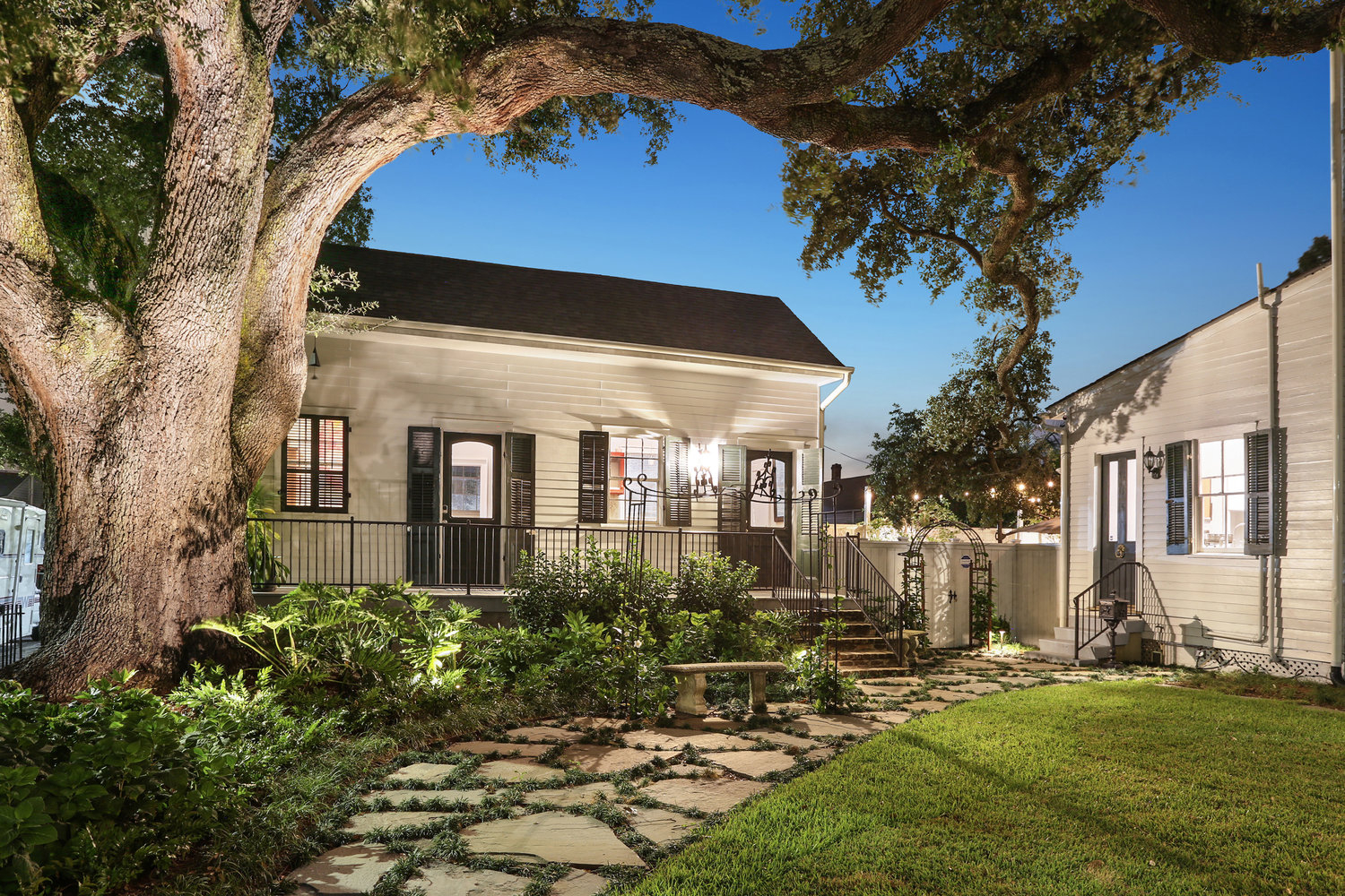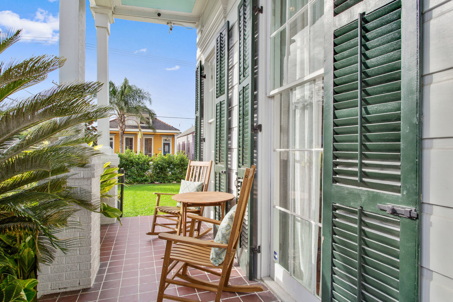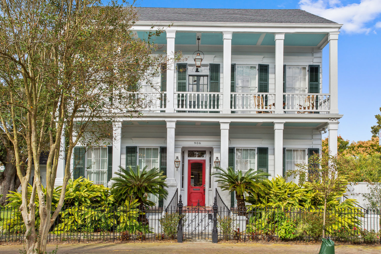 * Front porch (gallery) with historic gas lamps and outdoor seating