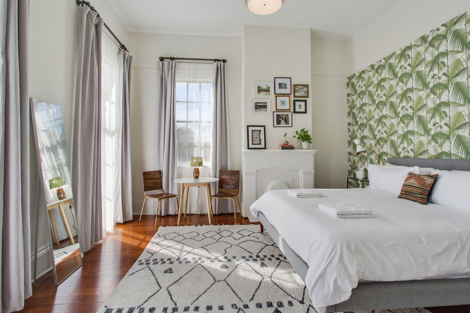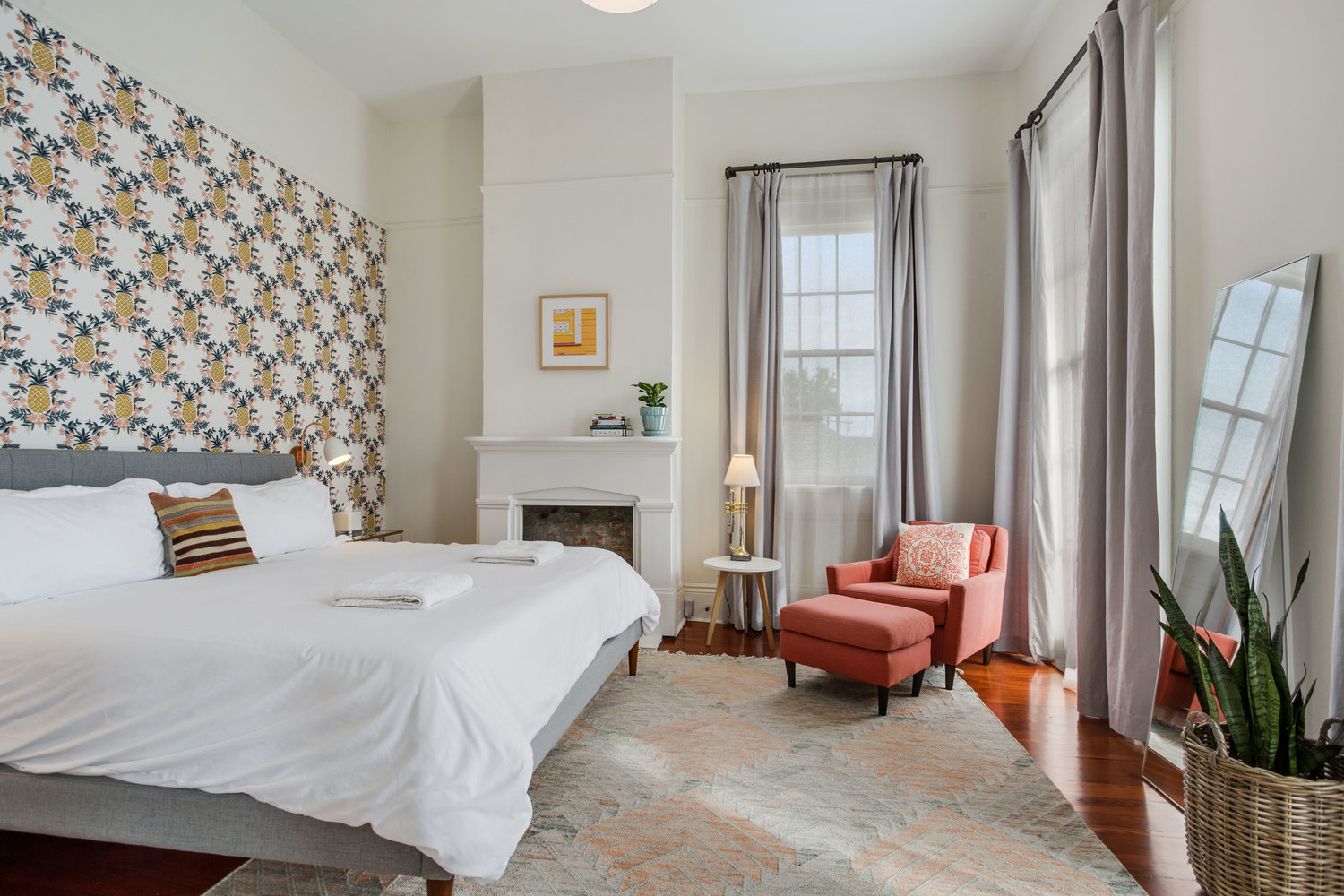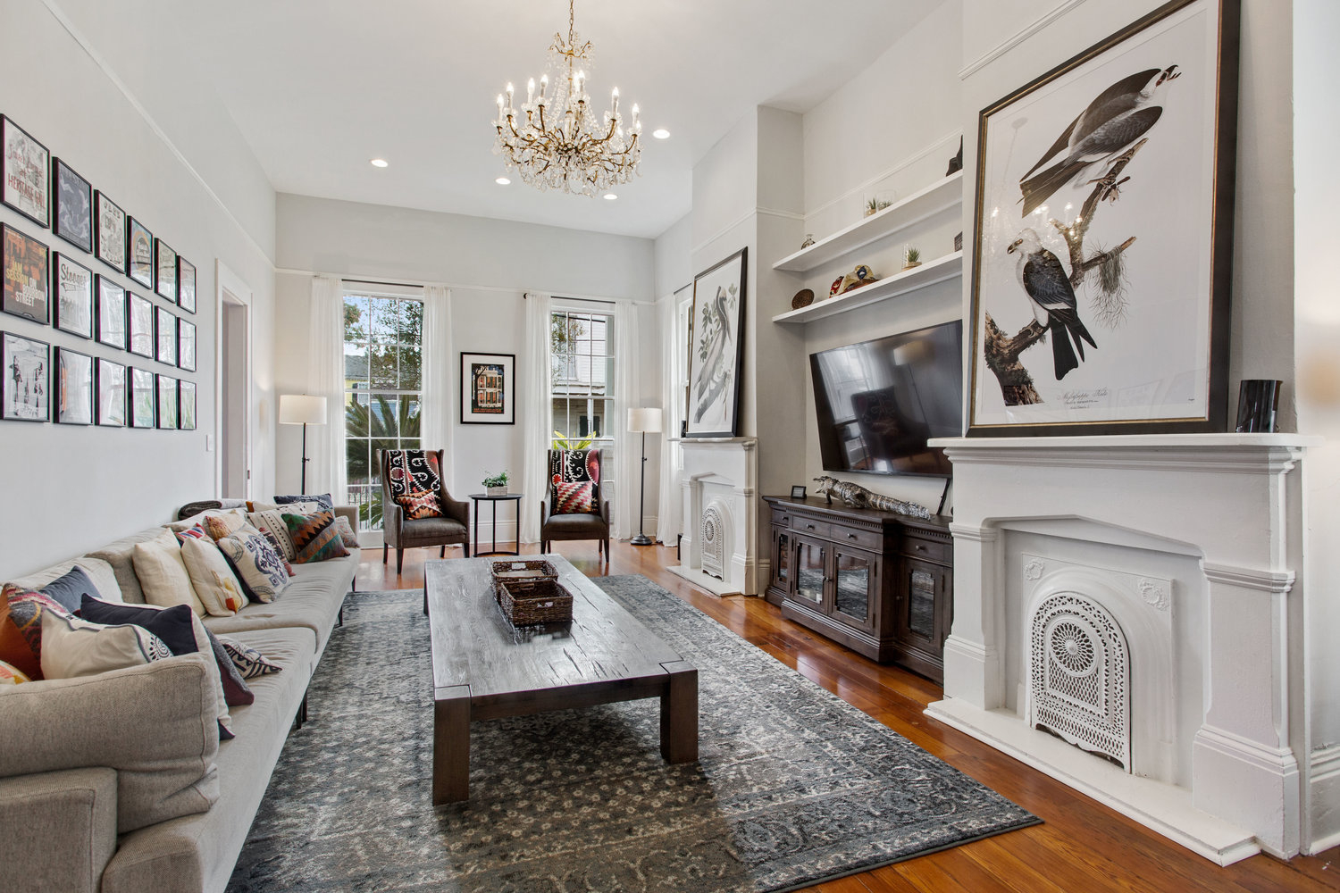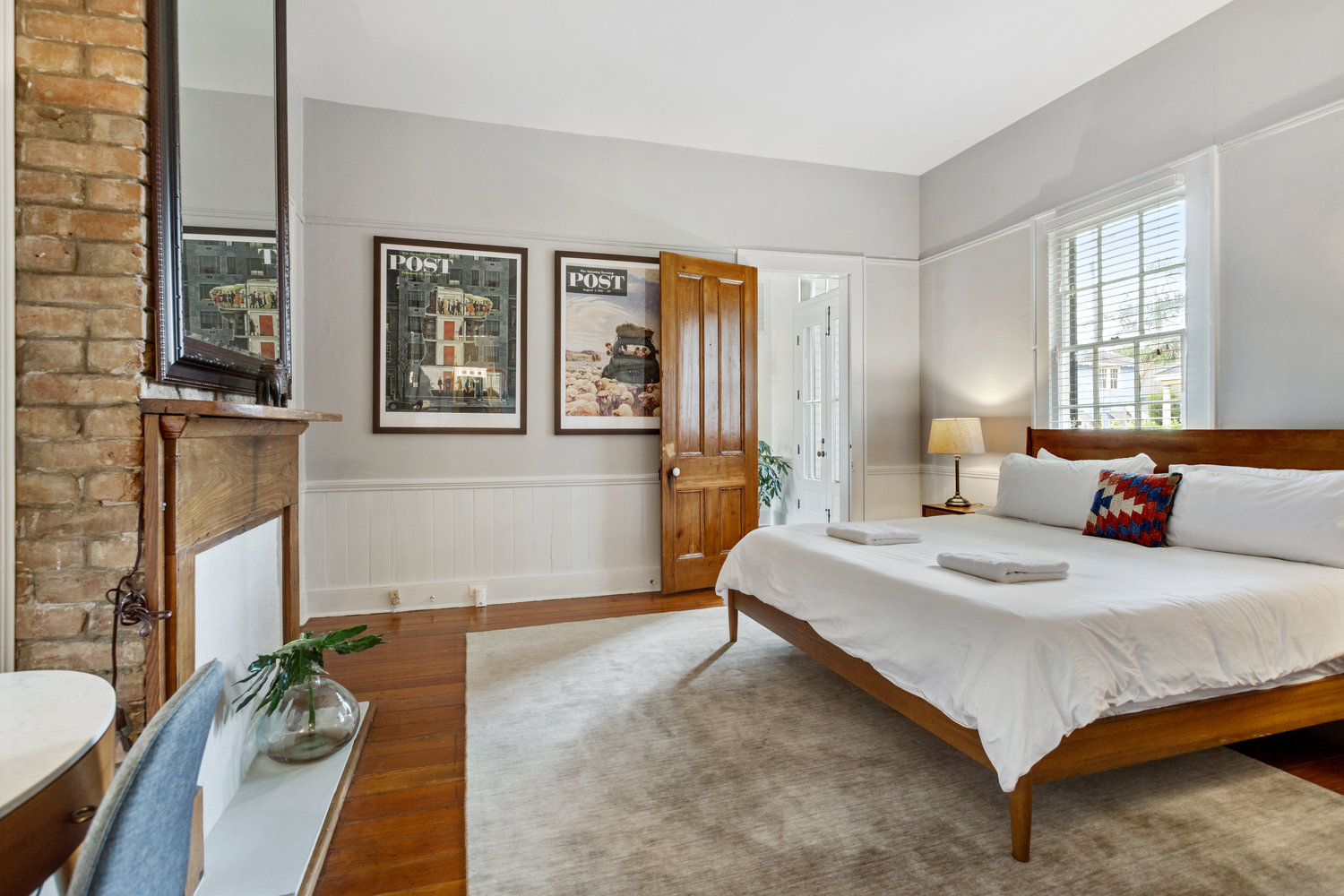 The house was recently renovated to preserve historic details including 13' ceilings with plaster medallions, heart pine wood floors, cypress doors, and a 125-year old oak tree. At the same time, we updated the layout to more comfortably accommodate large groups: