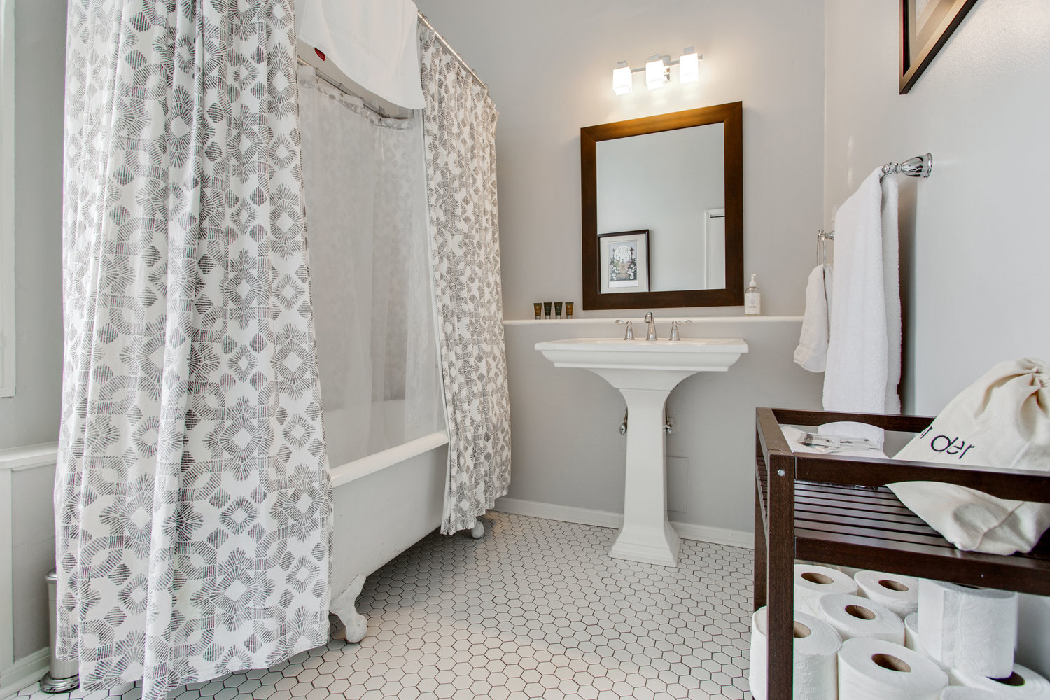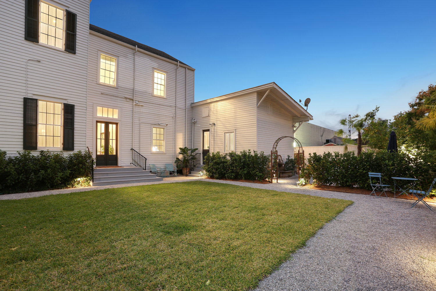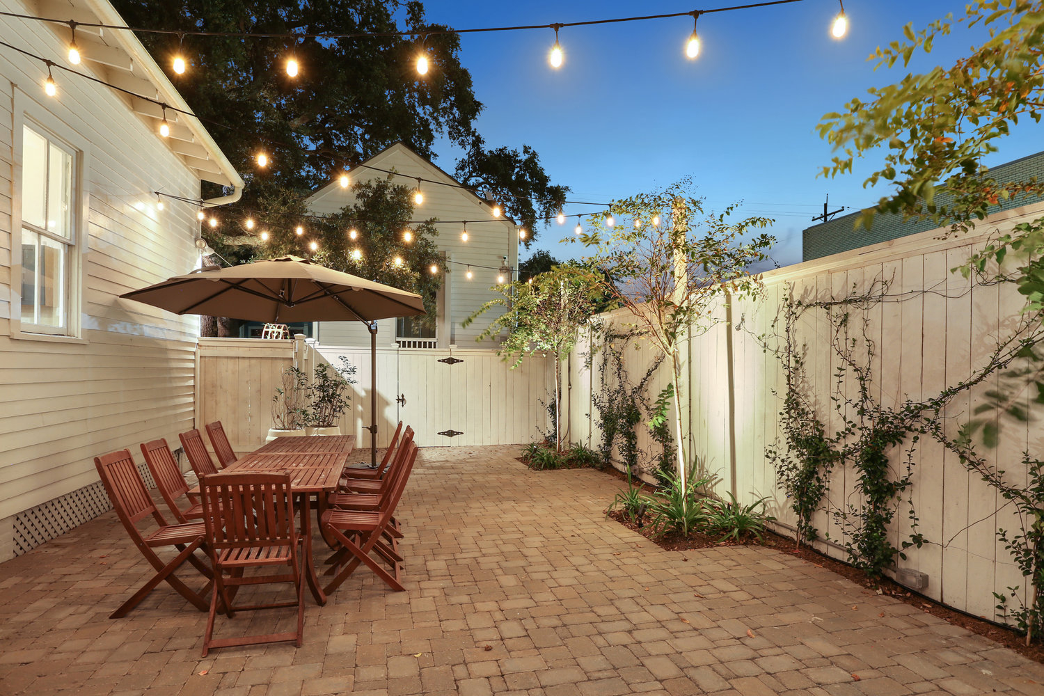 The house itself is located in the center of a triple lot, with a corner yard (under the oak tree) on one side and a private, fenced back yard on the other side. The two yards are connected by a center hallway that runs through the middle of the house. Some groups choose to do part of the event (i.e. ceremony) in one yard and then the other part of the event (i.e. reception) in the other yard, but depending on size of your group you could do it all on one side as well. The non-cottage side yard is private and fenced, but also has a large gate that can be opened to allow easy access for a food truck.