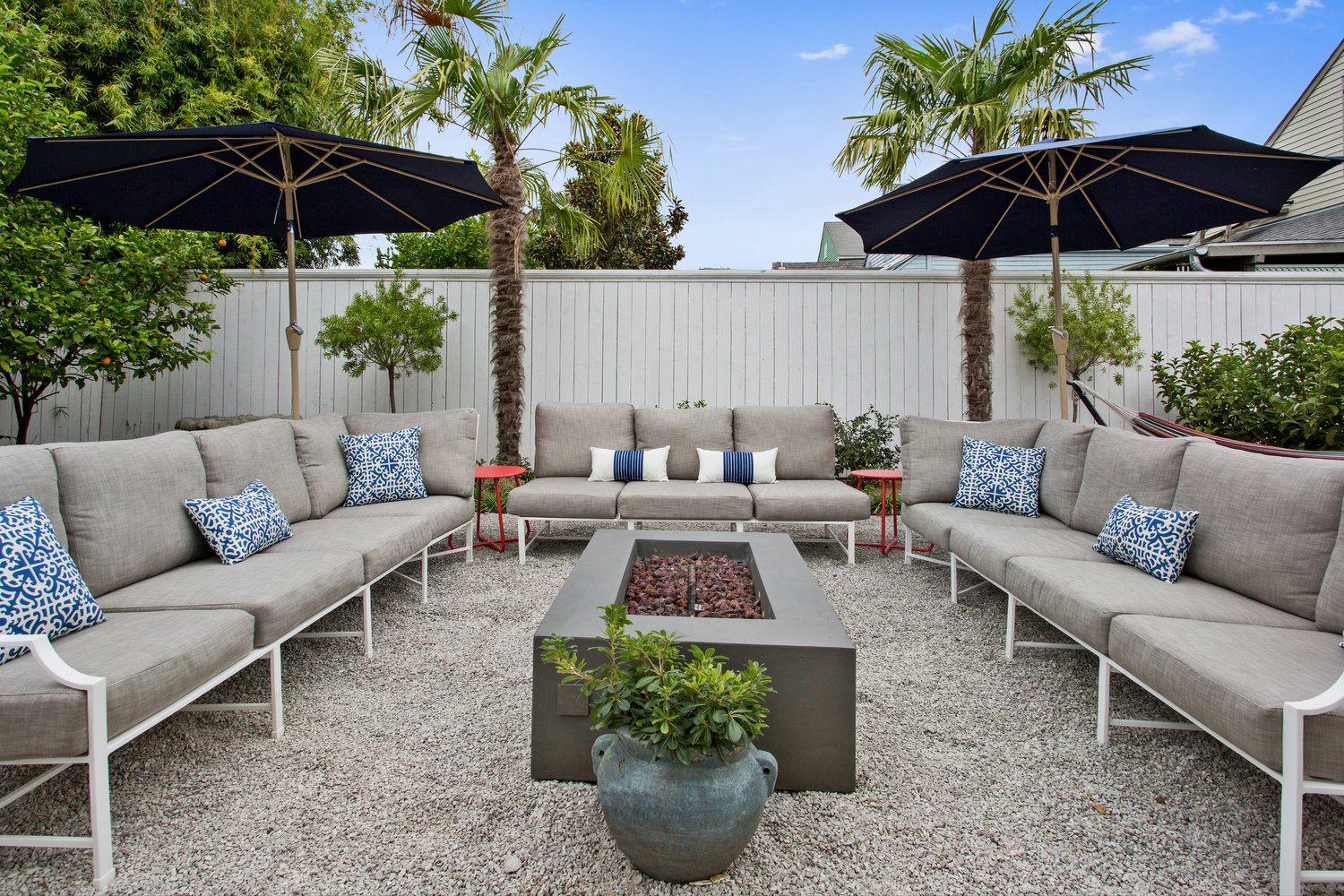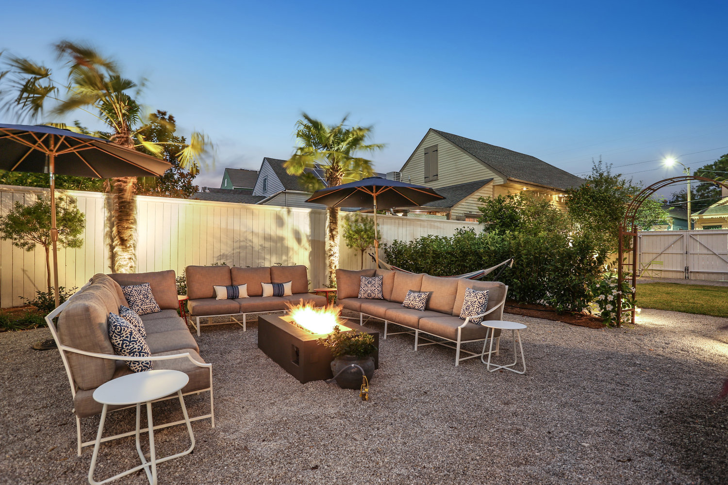 * Private yard (1/3 acre) with fire pit, six-burner propane BBQ, outdoor table, and hammocks