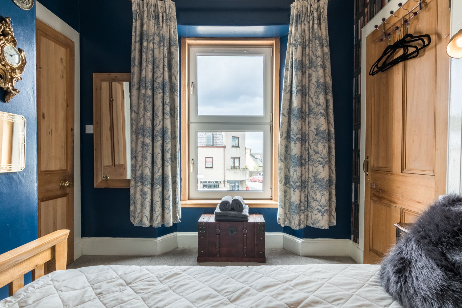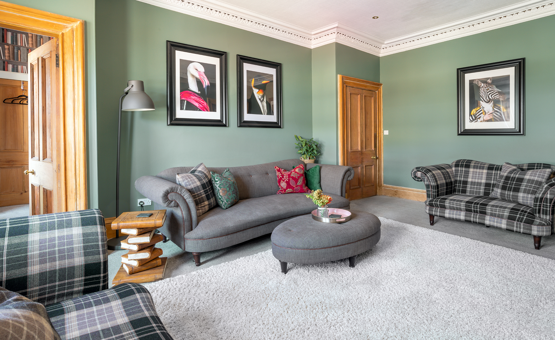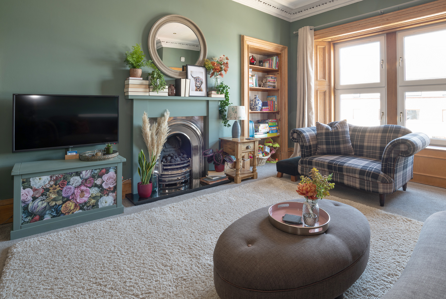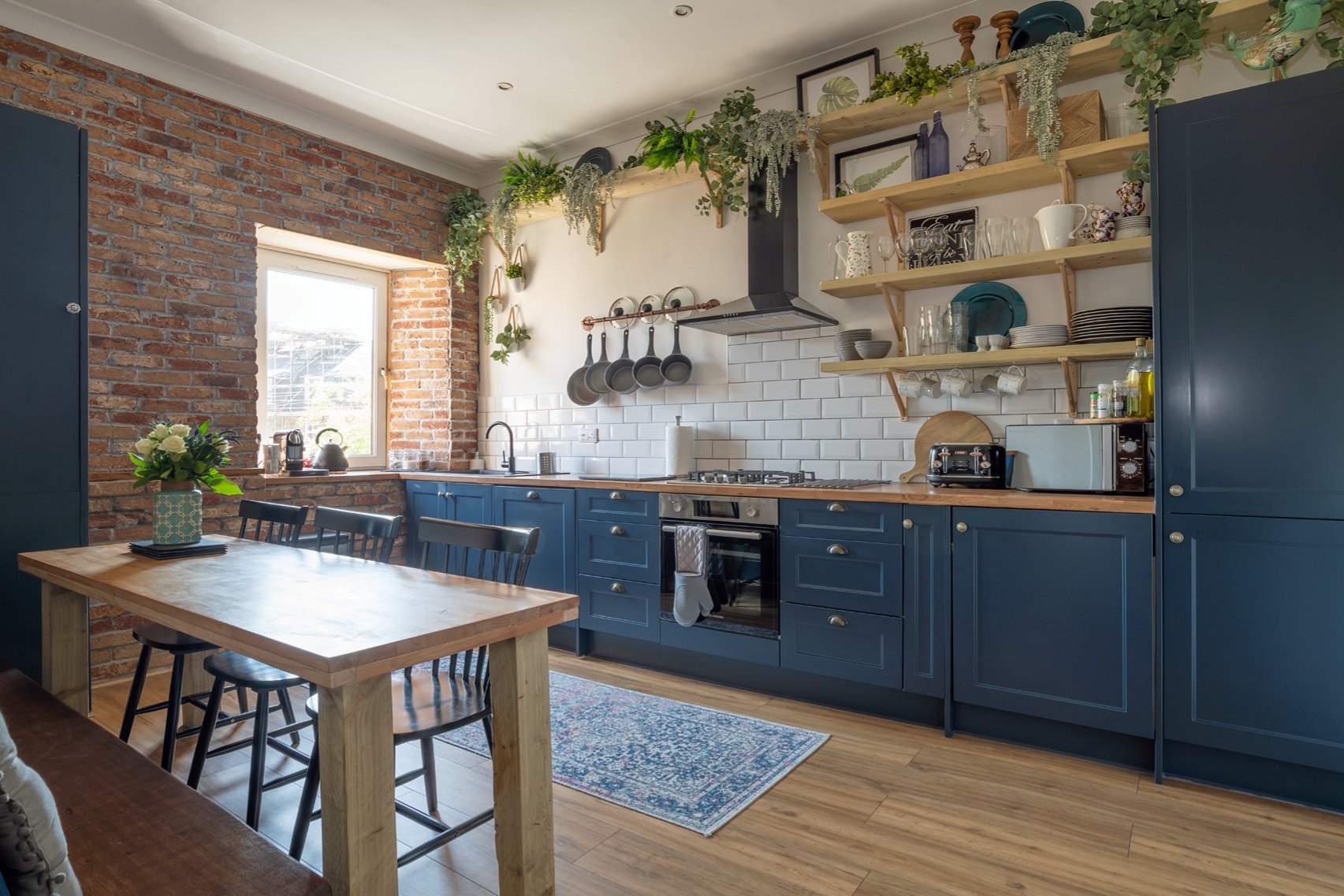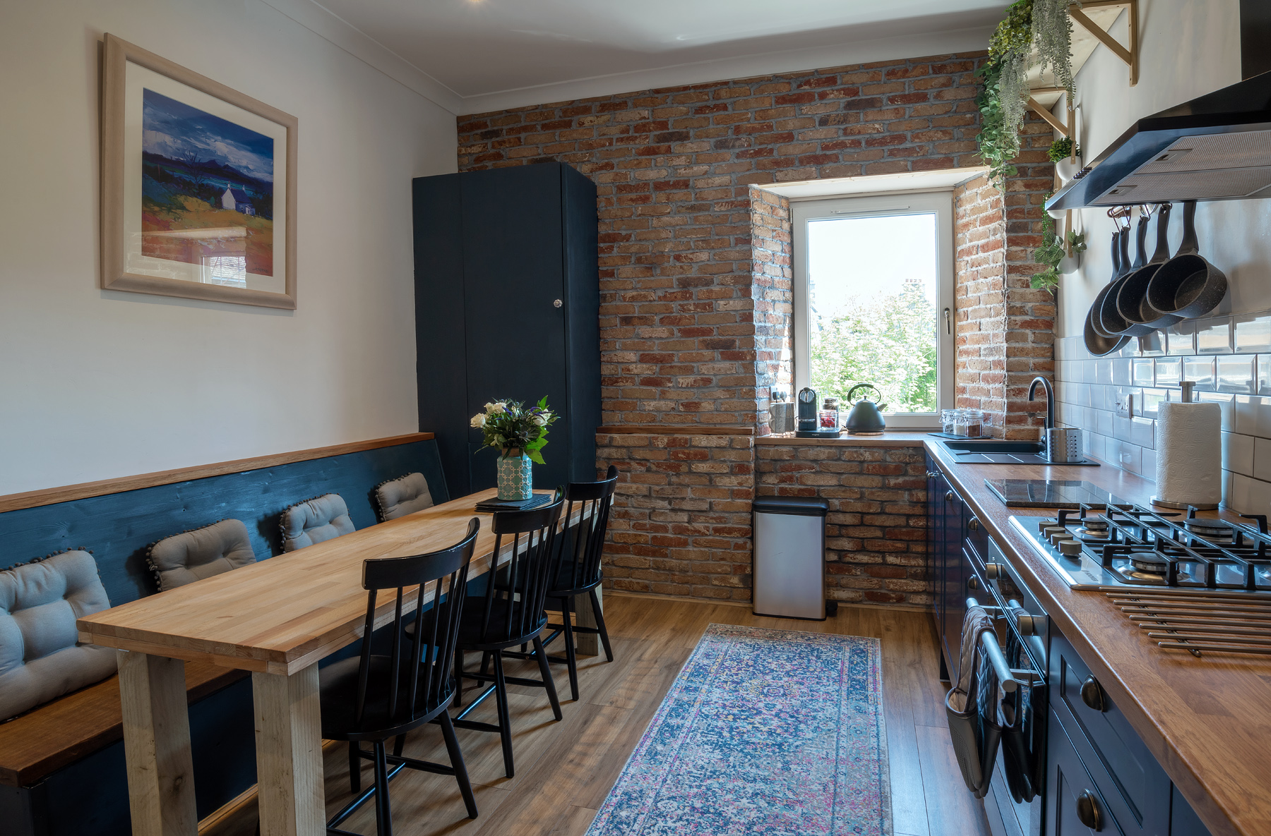 Near the banks of the River Ness in the heart of beautiful Inverness, this stylish period home is a real stand out. It offers a comfortable stay for up to eight guests with ample space to wind down with a good book or come together for hearty meals. Located in the city centre, you're a short stroll from an array of restaurants, bars and shops. For a cultural day trip out, the beautiful Inverness Botanic Gardens is less than fifteen minutes in the car. And after a day spent mooching around boutiques and long peaceful river walks, return to a cosy family home and put your feet up. Knock up a tasty dinner in the charming kitchen-diner with stylish blue cabinets, exposed brickwork, a metro-tiled backdrop and an impressive curation of houseplants. The four bedrooms and a grand living room with plenty of refined yet comfy seating make it a lovely spot to relax in big groups or enjoy a moment's rest. We especially love the Farrow & Ball green smoke walls and eclectic artwork dotted around, as well as the intricate fireplace that keeps things extra snug.
