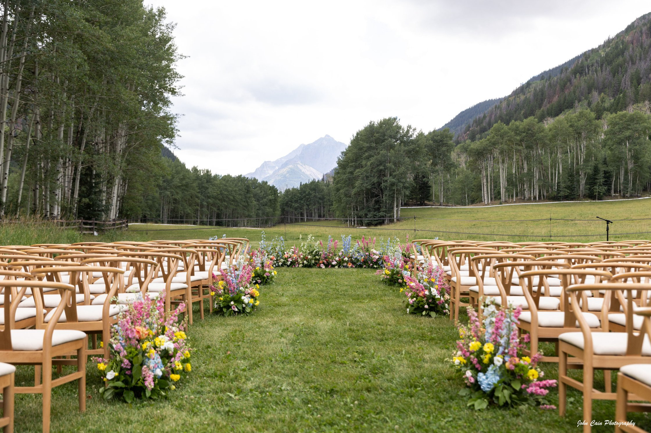 - T-Lazy-7 Ranch is home to four of Aspen's premier event venues. Set against a stunning backdrop of National Forest and wilderness, this picturesque location provides the perfect setting for any event! Our two MEADOW locations offer a beautiful outdoor environment with breathtaking views of one of Colorado's 14,000-foot peaks, Pyramid Peak. THE MAIN MEADOW is ideal for a scenic ceremony, a cocktail hour, and a twinkle-lit reception under the stars. Alternatively, you can choose an intimate ceremony in THE MOUNTAIN MEADOW, followed by a reception at THE T-LAZY-7 LODGE, which exudes quintessential western elegance. For a more adventurous gathering, enjoy a cozy atmosphere around the campfire at our open-air facility, known as THE CHUCKWAGON GROUNDS. You are welcome to bring in your own caterer, entertainment, and planner, allowing you to personalize your wedding or event. T-Lazy-7 Hospitalities will provide all alcoholic beverages, along with a professional bartending staff. We invite you to learn more about what we offer, and we look forward to the opportunity of working with you to create a unique, memorable, and picture-perfect event.