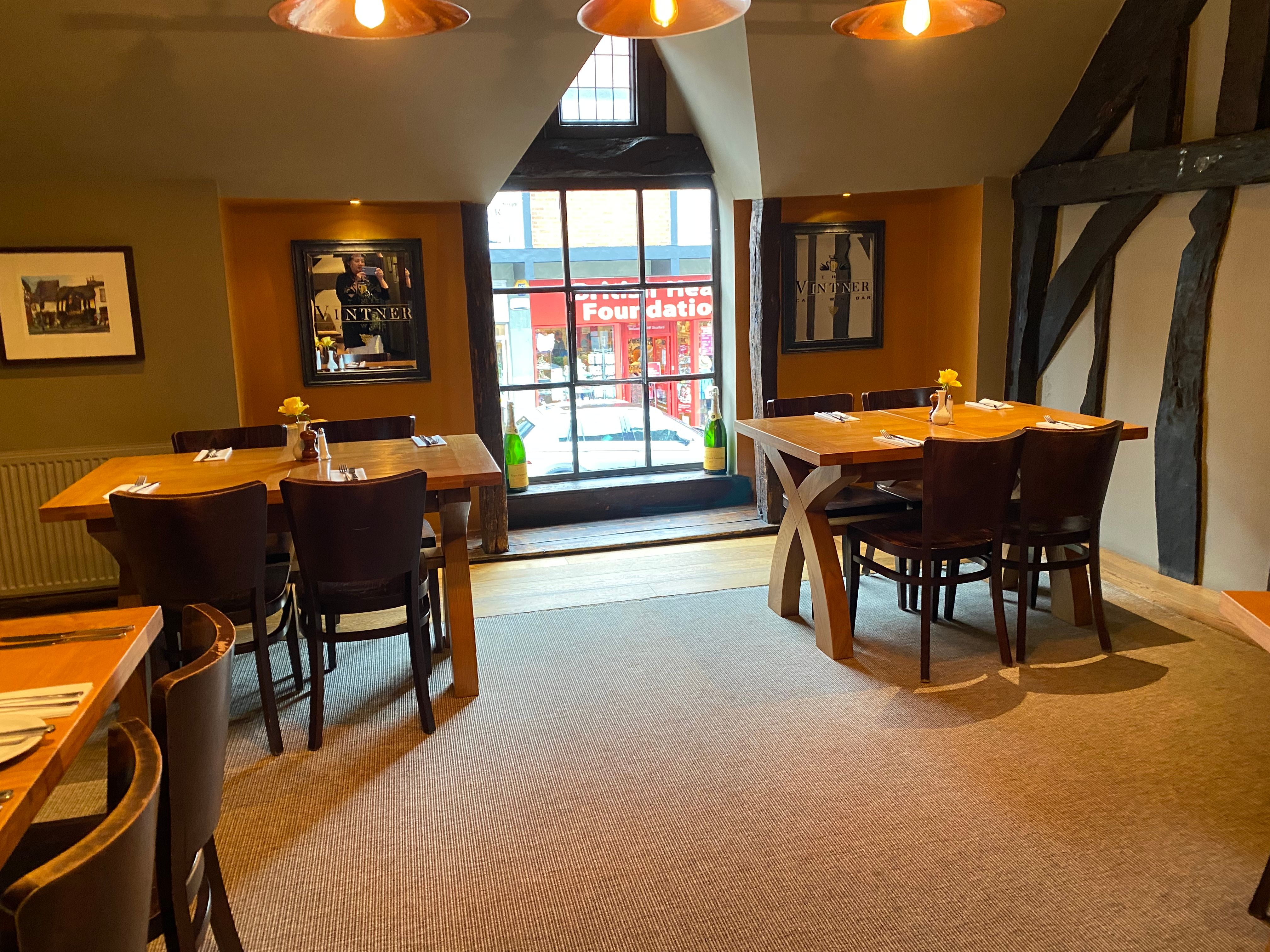 Situated in the heart of Stratford-upon-Avon, The Vintner is a natural meeting place, be it for a coffee or something a little stronger in the café / bar, a meal in our restaurant or when getting together more formally in our Private Dining Room.We have a diverse and thoughtful menu, locally-sourced and seasonally adjusted, as well as a comprehensive range of fine wines and beers from all over the world.'The Vintner' derives its name from the year 1600, when John Smith traded, along with his wife, as a wine merchant (vintner) in this building. It is more than likely that William Shakespeare purchased his wine from here!