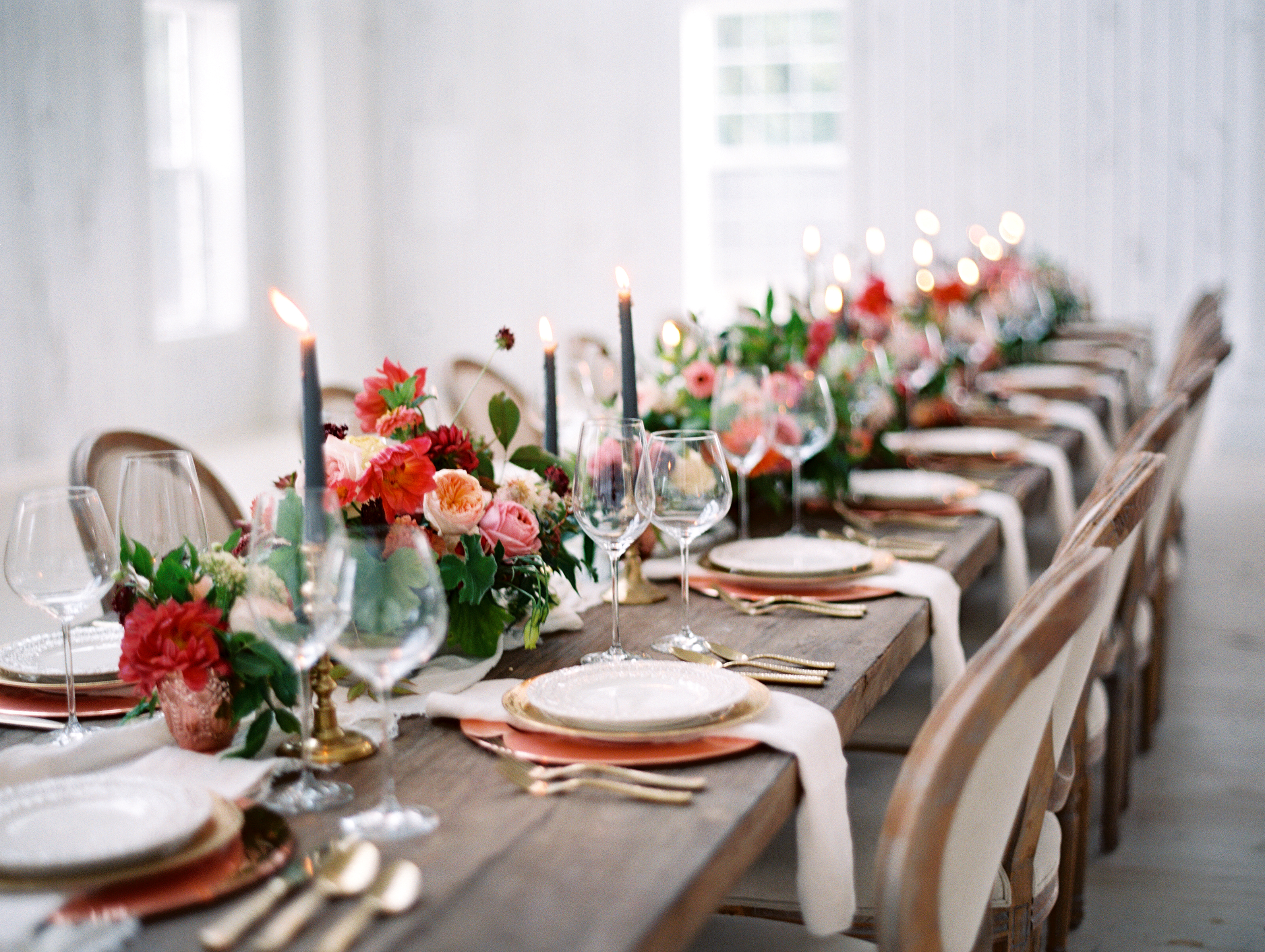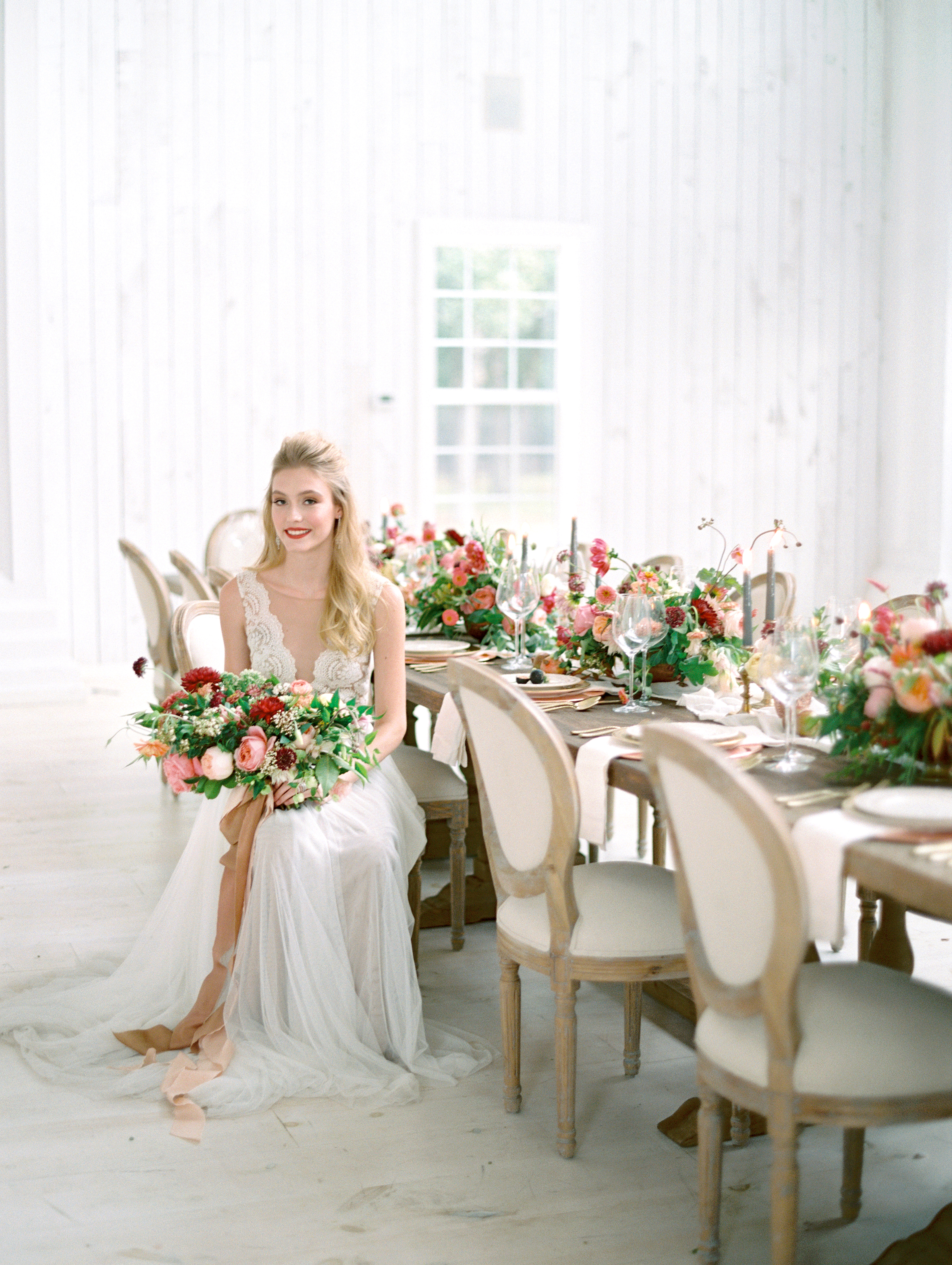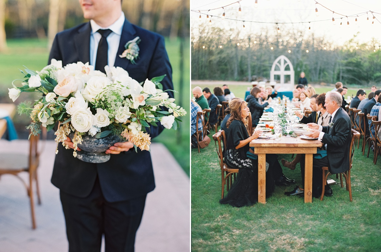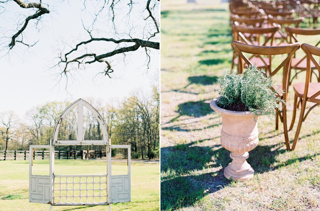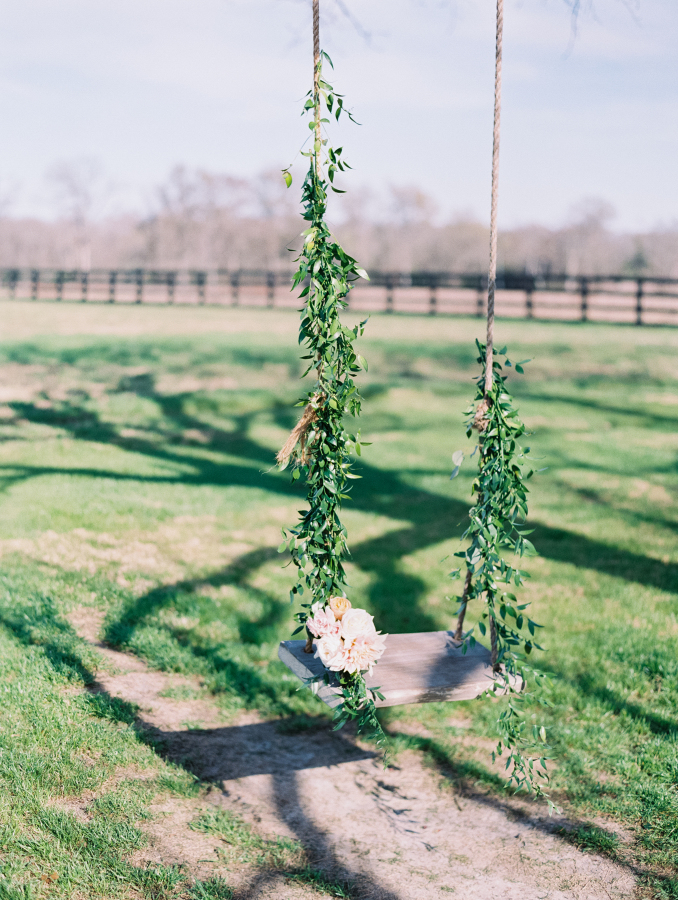 Down-home Texas charm nestled in a field surrounded by flower gardens a grove and a sweet swing. We're not lying when we say this is one of the most beautiful, whitewashed vintage barns we've seen for a wedding, ever. The details feel special and not overdone, each piece and color choice thoughtful.