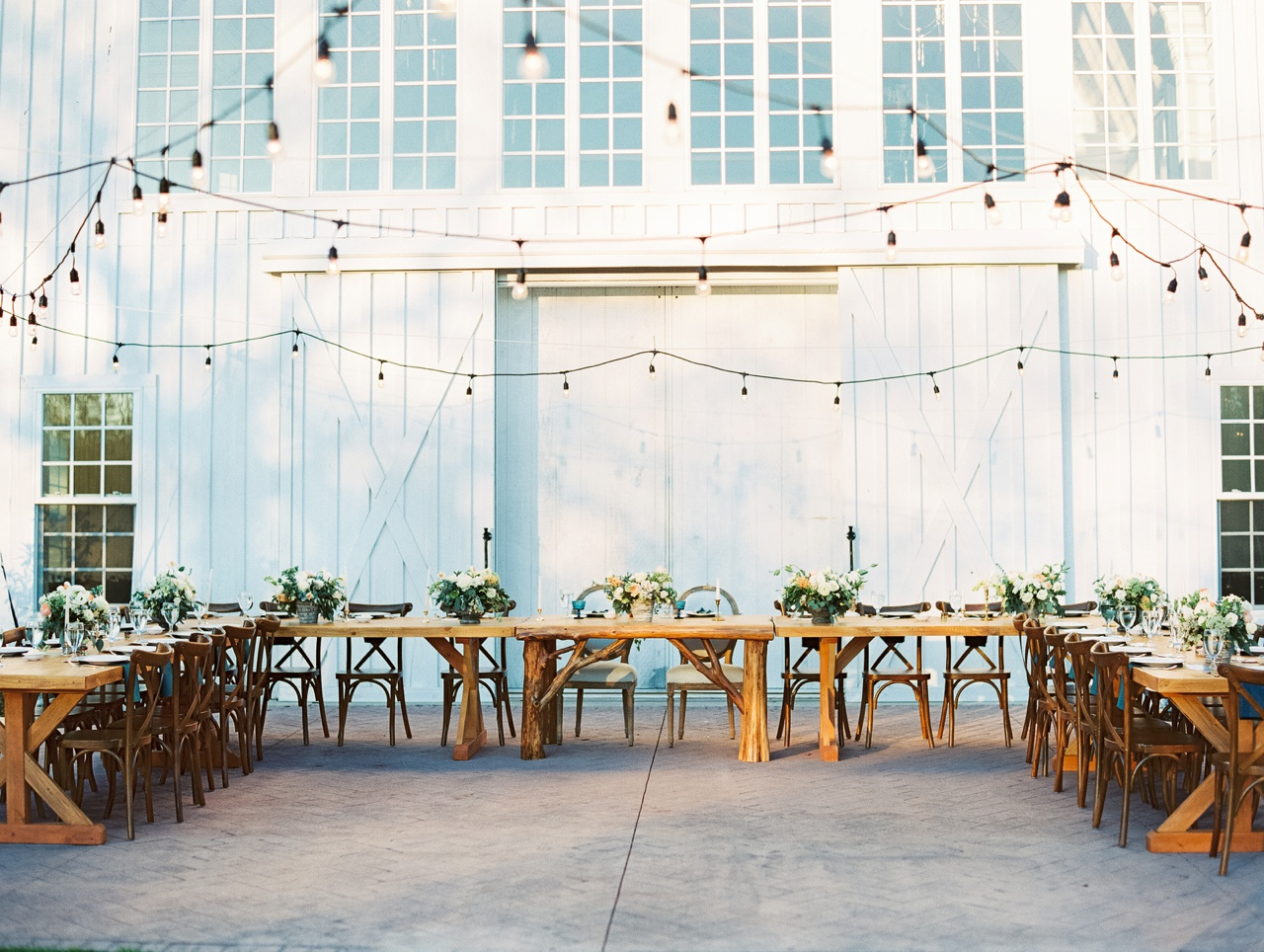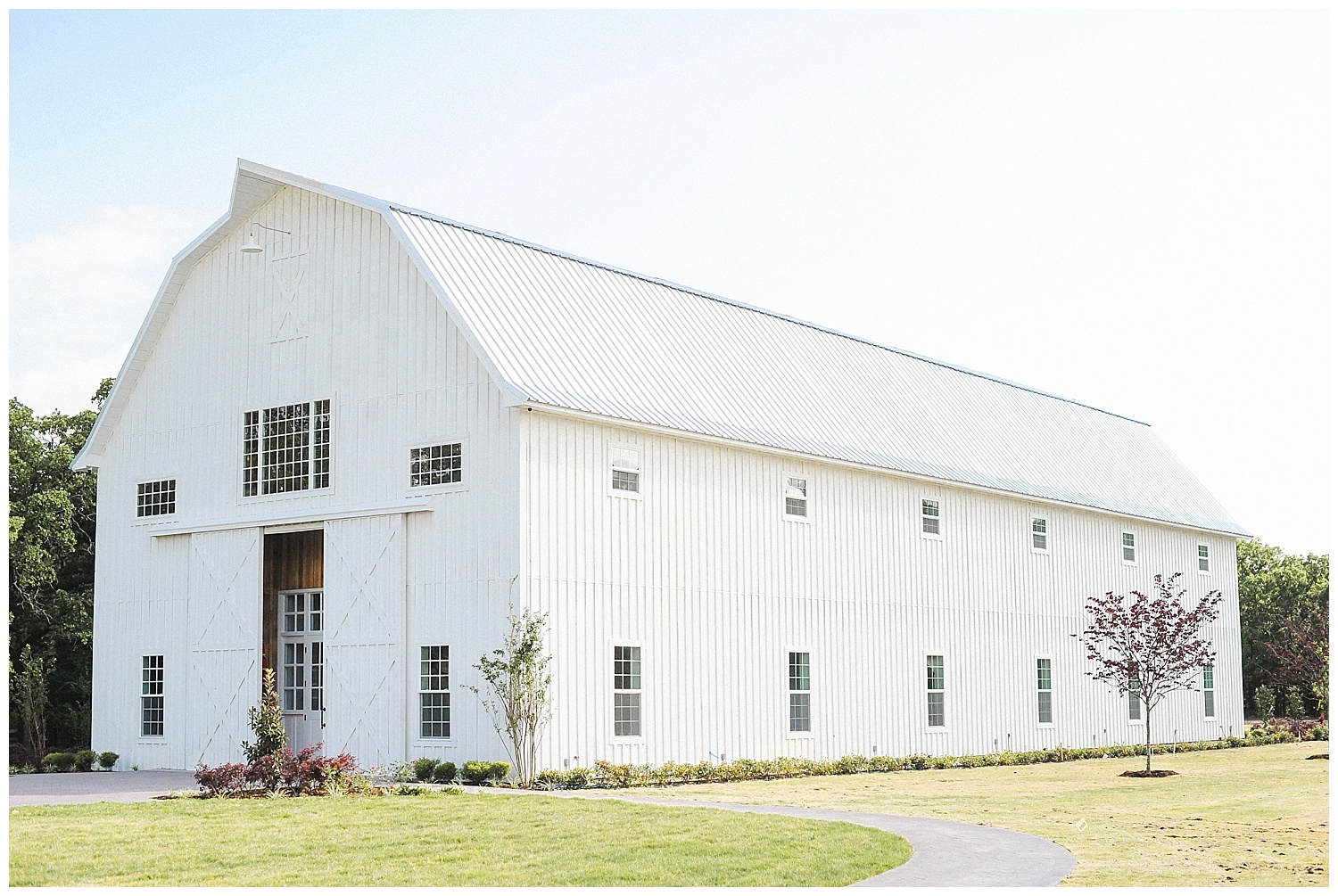 The white barn’s rustic charm is breathtaking in its idyllic natural setting amidst impressive oaks and lush gardens.