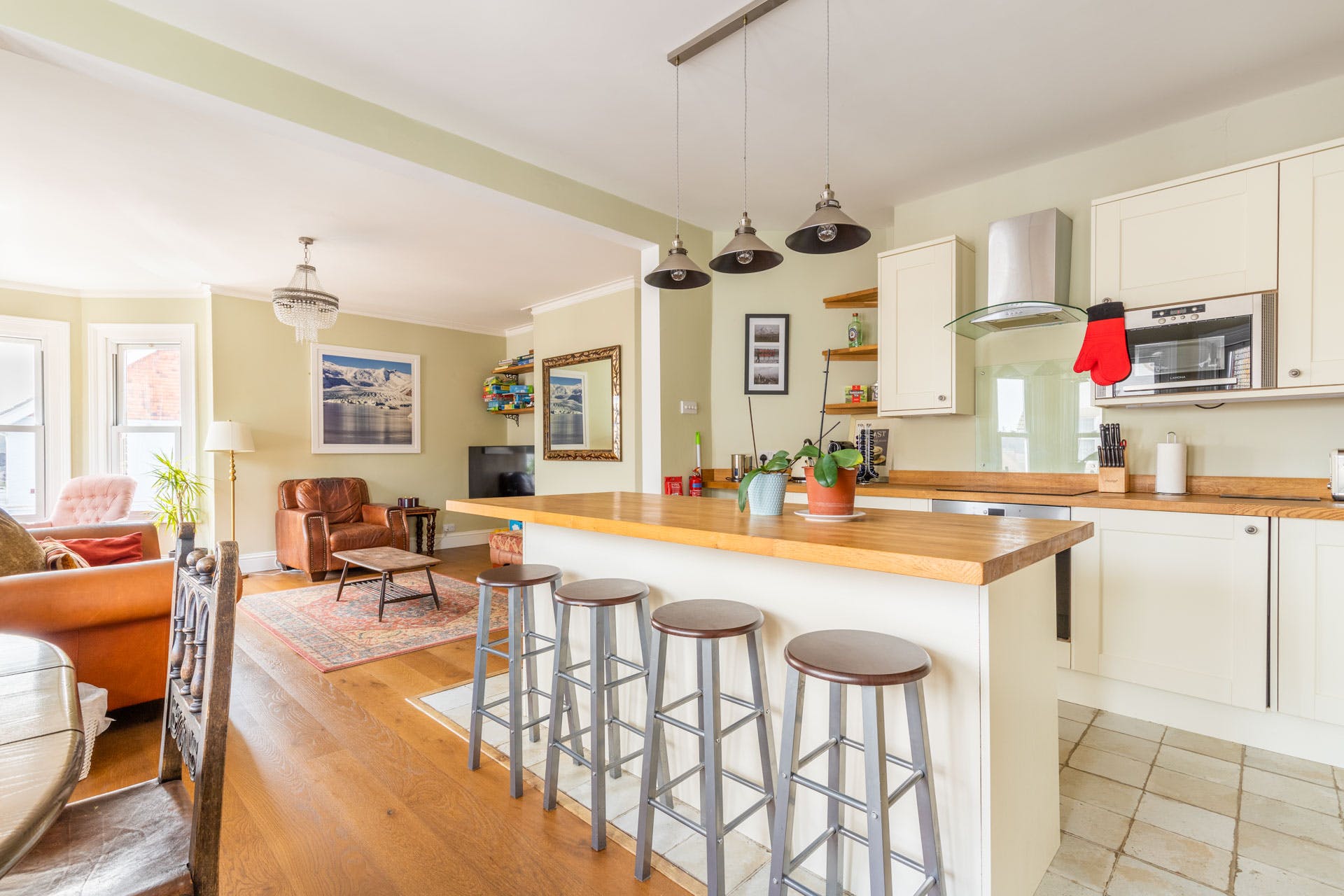 Inside, the open-plan living space is flooded with natural light beaming in through the two bay windows. The buttery-soft leather sofas and patterned rug keep it cosy, while the sleek kitchen is equipped with everything you need to whip up some hearty dishes. We recommend a traditional roast dinner, with all the trimmings, to refuel at the end of a busy day. And, there's even a free-standing bathtub where you can enjoy a long, luxurious soak – peace, perfect peace.