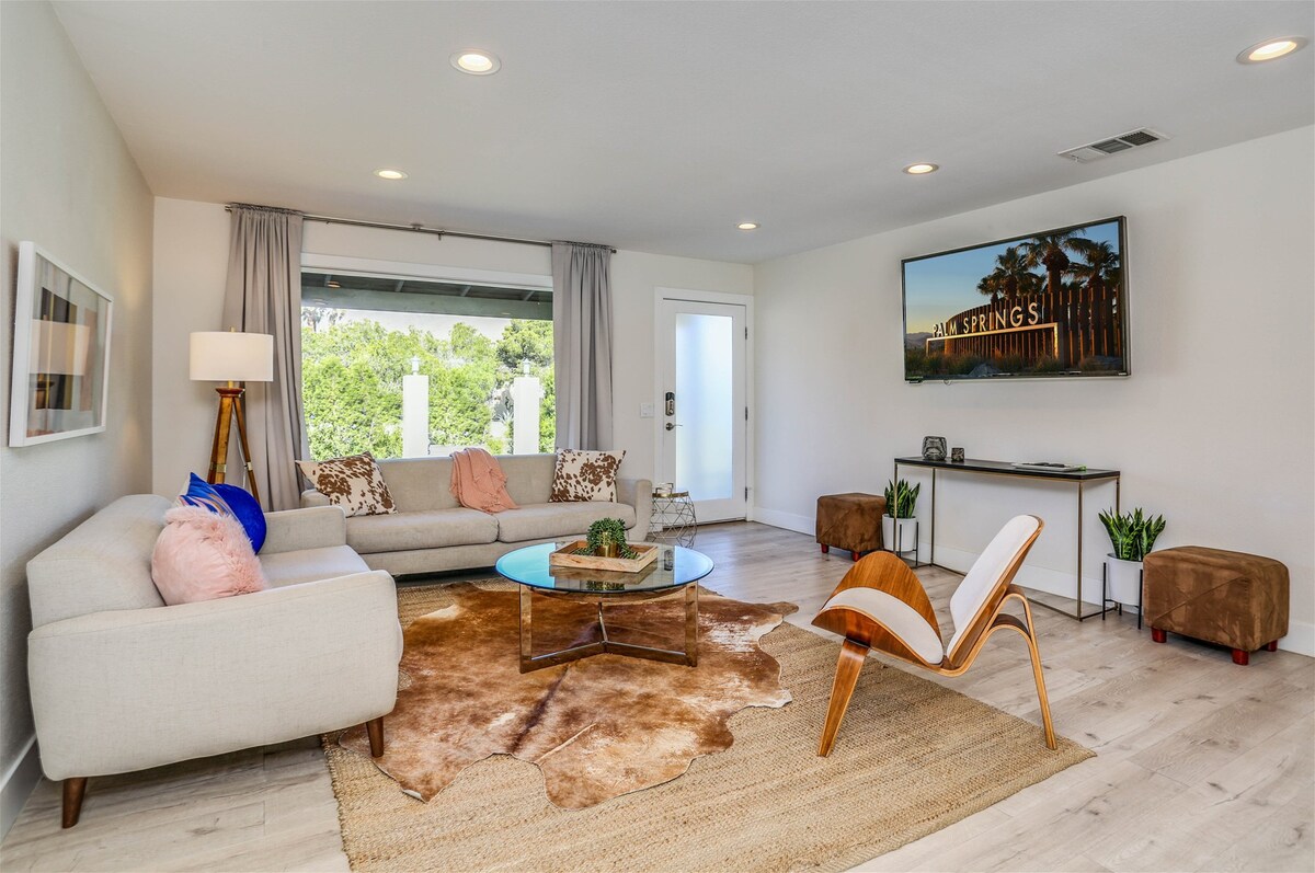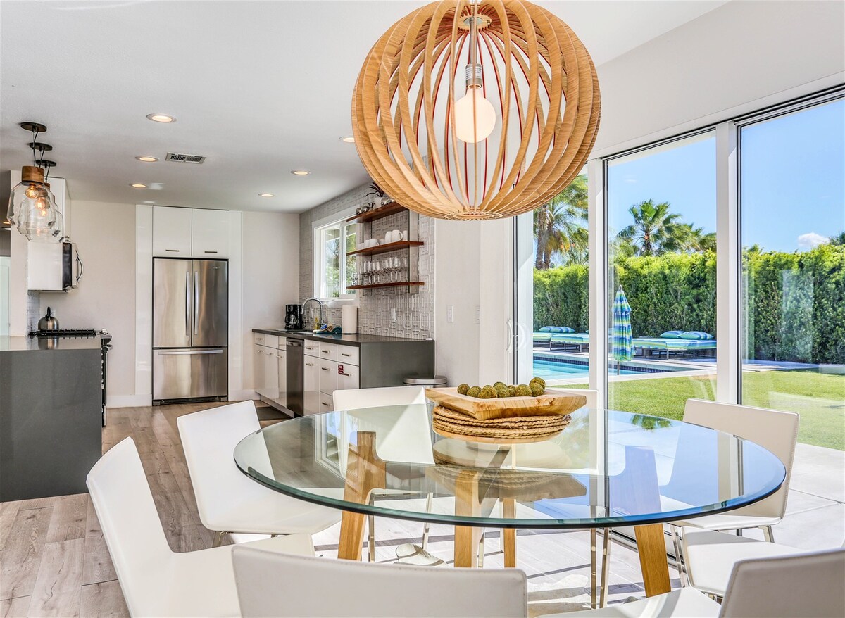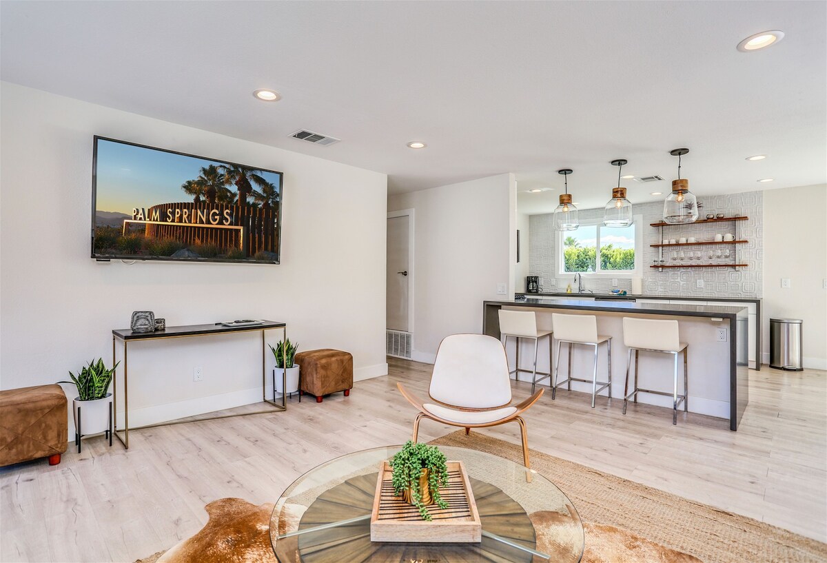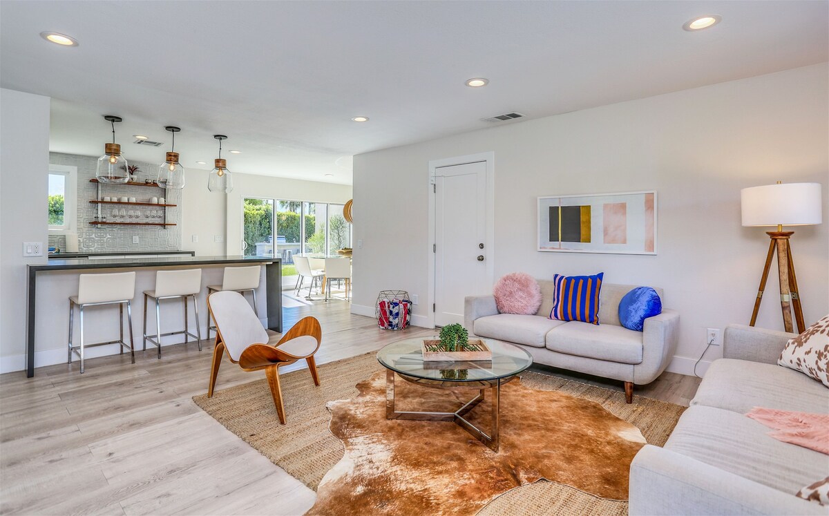 One glance at the backyard and you'll understand why we adore this Palm Springs home — there's a pool, jacuzzi, barbecue area, fire pit and championship ping pong table to keep everyone occupied. Spend your days hanging by the pool, soaking up the views of the San Jacinto Mountains. A covered seating area provides a shady break from the sun – and why not cool off with a cocktail in hand. When the sun goes down and the chilly air kicks in, everyone can gather around the fire pit, toasting marshmallows and chatting about the day. Though the backyard is the star of the show, the inside is wonderful, too. It's bright and modern, with nods to the mid-century style Palm Springs is known for. You're a quick car ride from the vibrant Palm Canyon Drive — head there for bars, restaurants, and shops. Joshua Tree National Park is only an hour away — perfect for a day trip — but we don't blame you if you'd rather stay home, unwinding in your outdoor oasis.