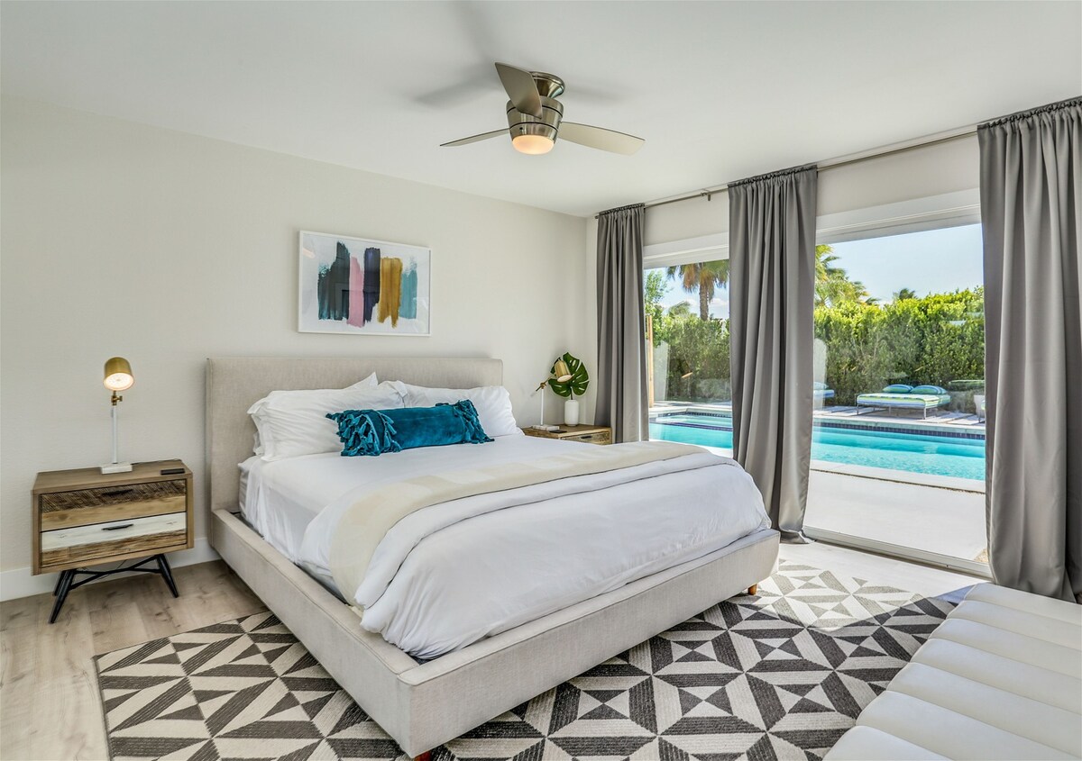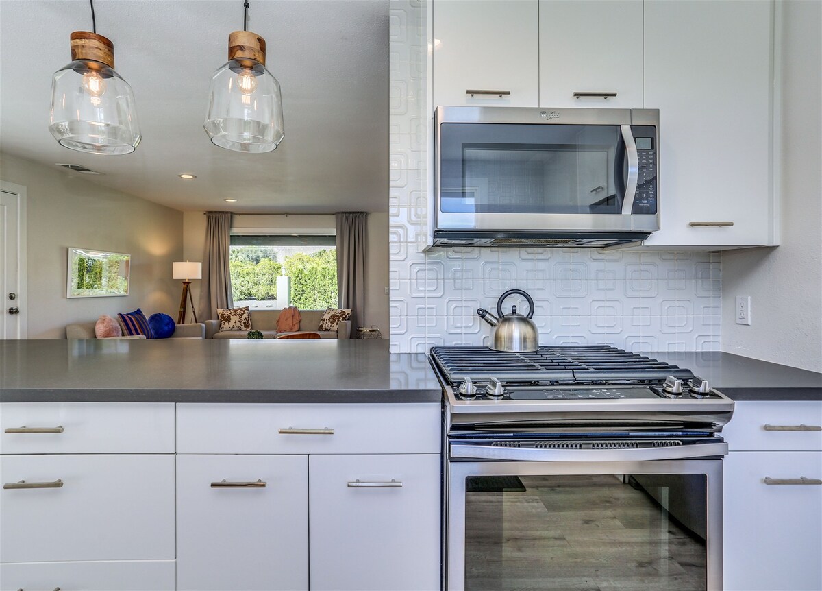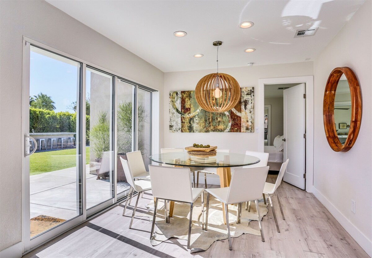 One glance at the backyard and you'll understand why we adore this Palm Springs home — there's a pool, jacuzzi, barbecue area, fire pit and championship ping pong table to keep everyone occupied. Spend your days hanging by the pool, soaking up the views of the San Jacinto Mountains. A covered seating area provides a shady break from the sun – and why not cool off with a cocktail in hand. When the sun goes down and the chilly air kicks in, everyone can gather around the fire pit, toasting marshmallows and chatting about the day. Though the backyard is the star of the show, the inside is wonderful, too. It's bright and modern, with nods to the mid-century style Palm Springs is known for. You're a quick car ride from the vibrant Palm Canyon Drive — head there for bars, restaurants, and shops. Joshua Tree National Park is only an hour away — perfect for a day trip — but we don't blame you if you'd rather stay home, unwinding in your outdoor oasis.
