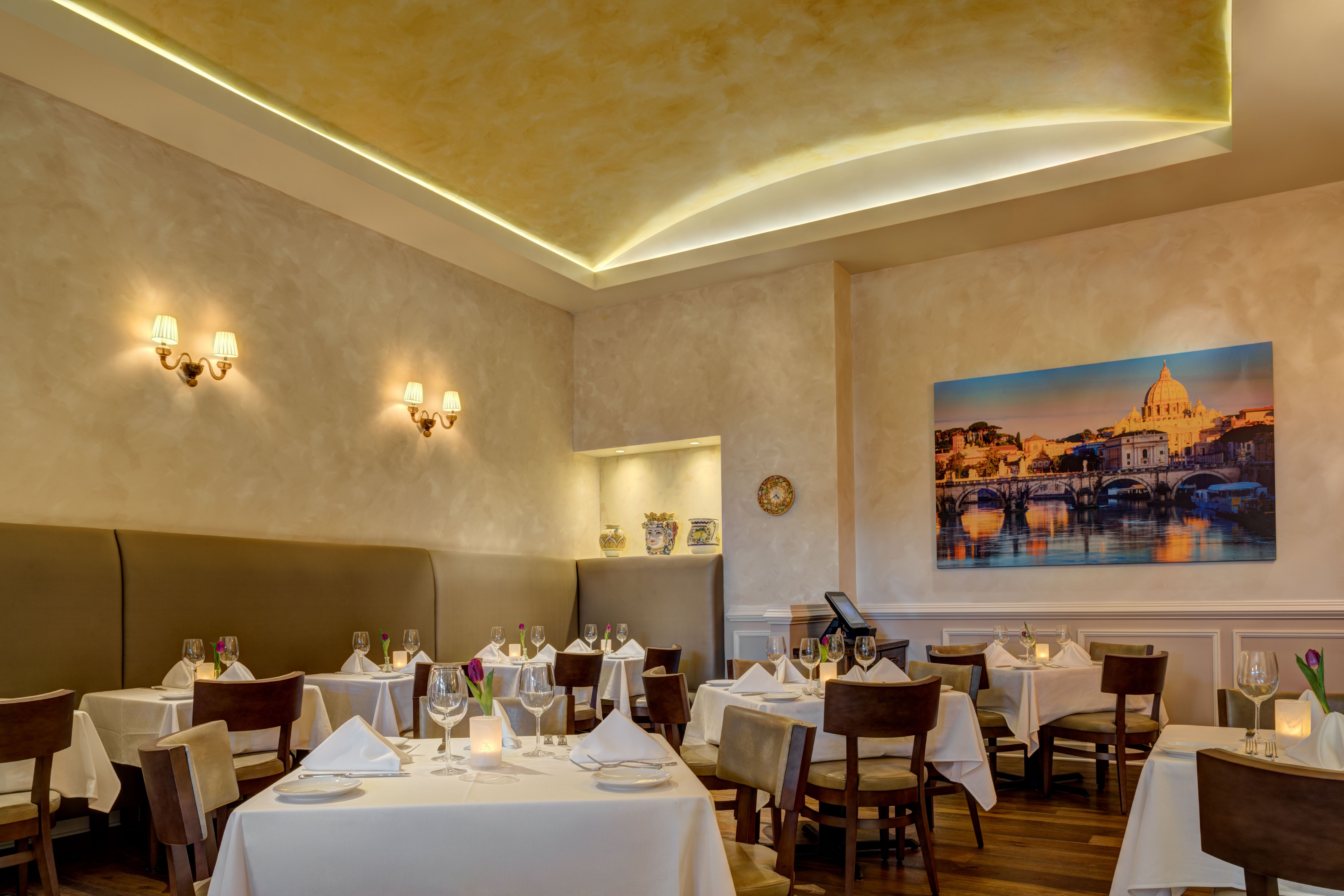 Via Roma offers authentic Italian fine dining featuring many of Toscana's popular menu items along with specials that touch on dishes that are traditional in Rome. An extensive Italian wine collection is available to compliment your meal. Via Roma is ideally situated in front of a wonderfully-designed outdoor gathering place with chairs, rocking benches and fountains across from the new Hilton Gardens.