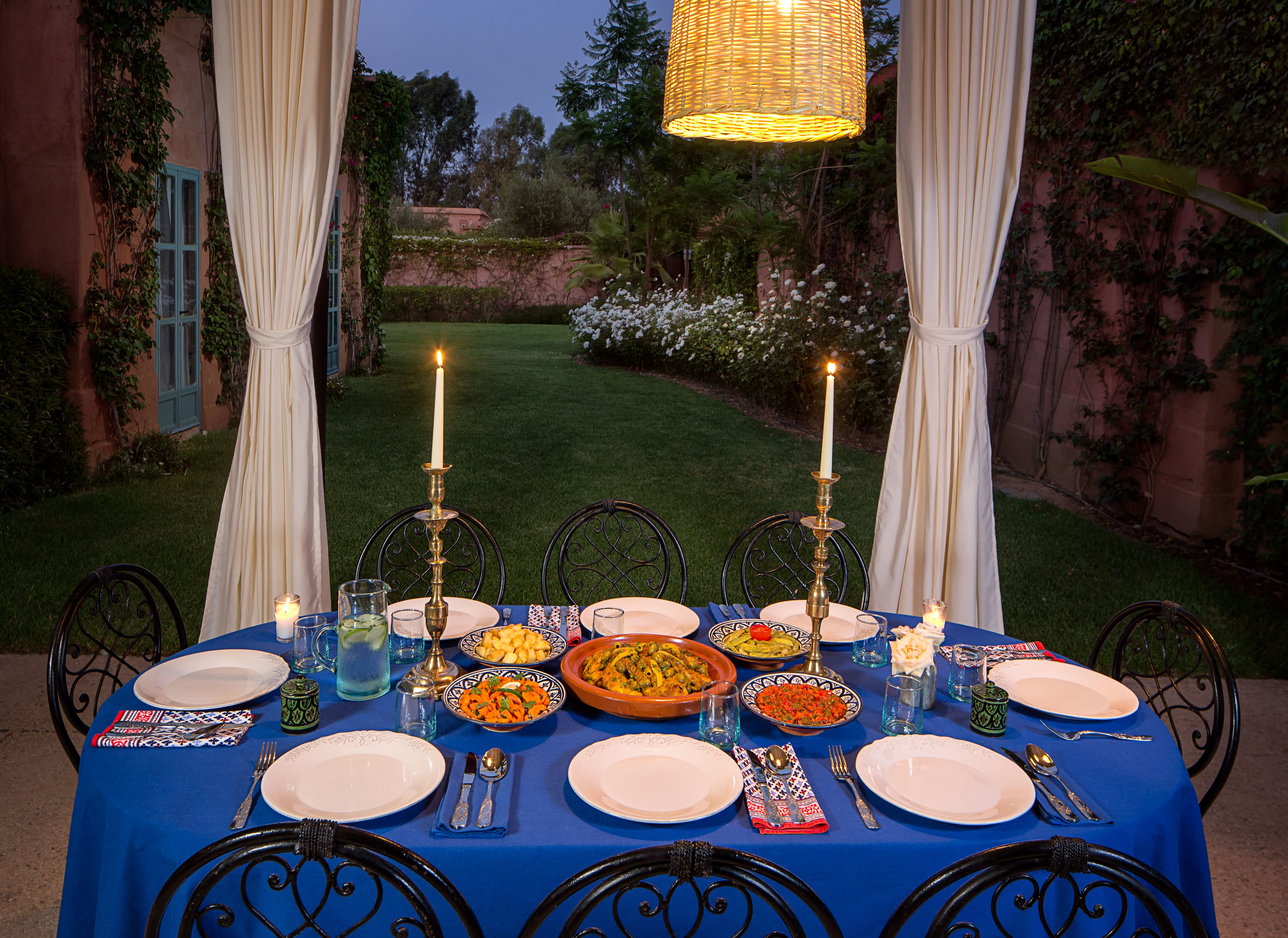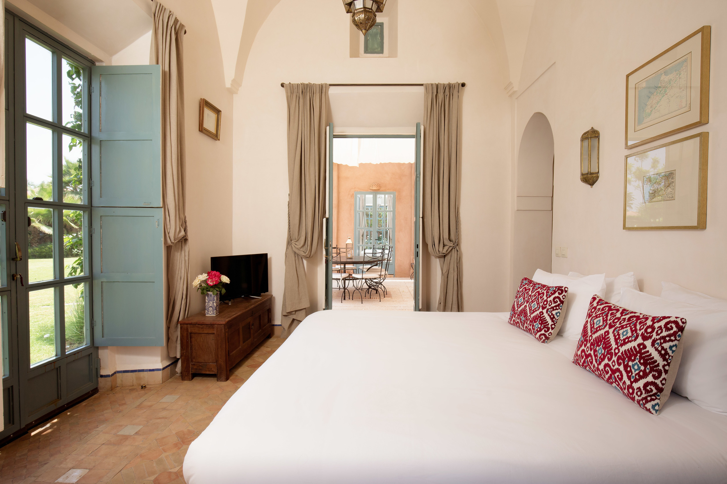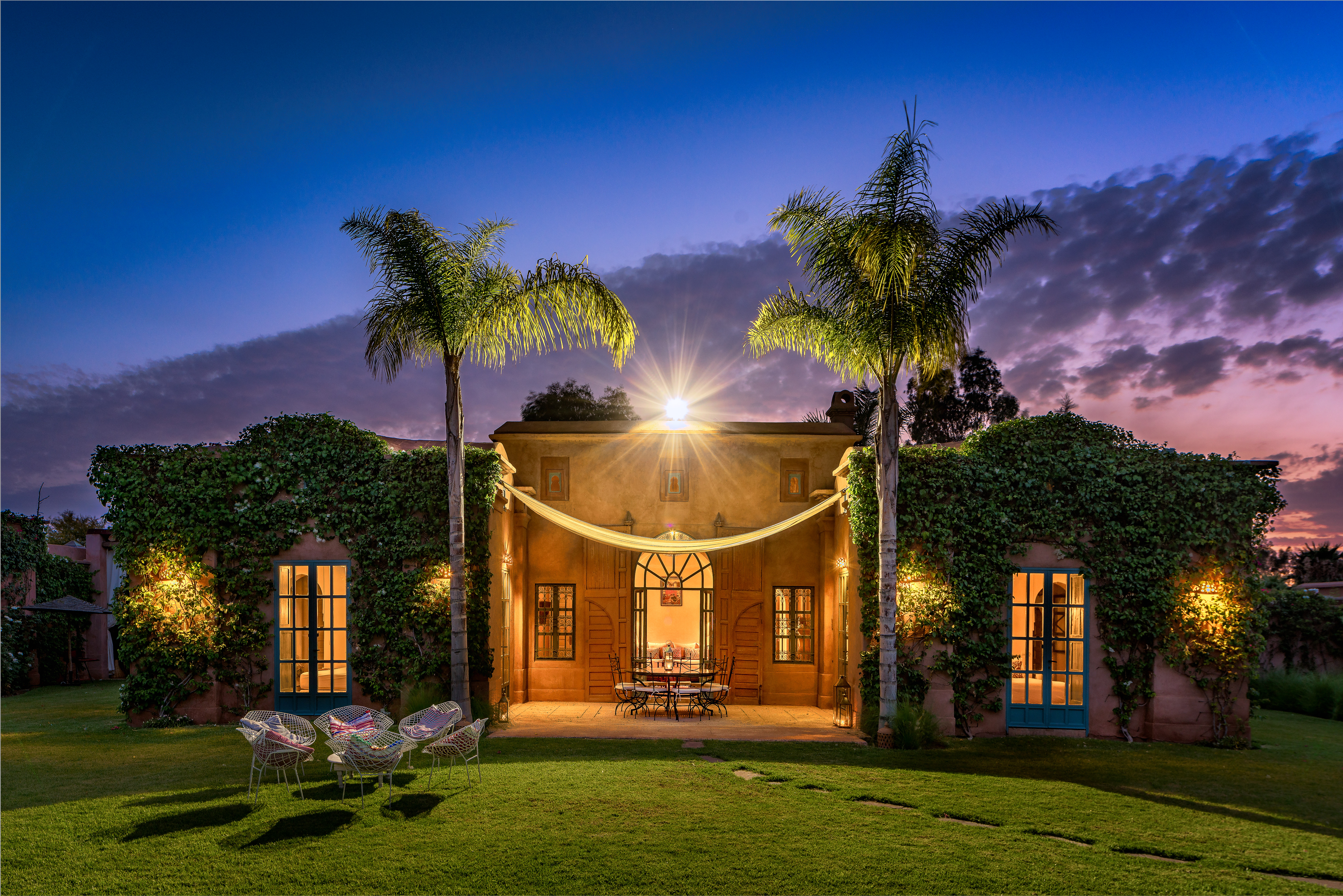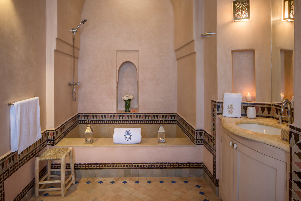 Villa Magtafa is immersed in mature gardens, which feature bougainvilliers, fragrant roses and palm trees. Built within a 2.4m high privacy wall perimeter, we have the largest garden of the domaine de l'Akhdar featuring a 14m private swimming pool complete with covered 'bathing kiosks'.